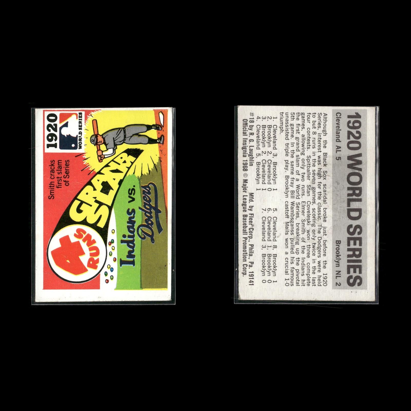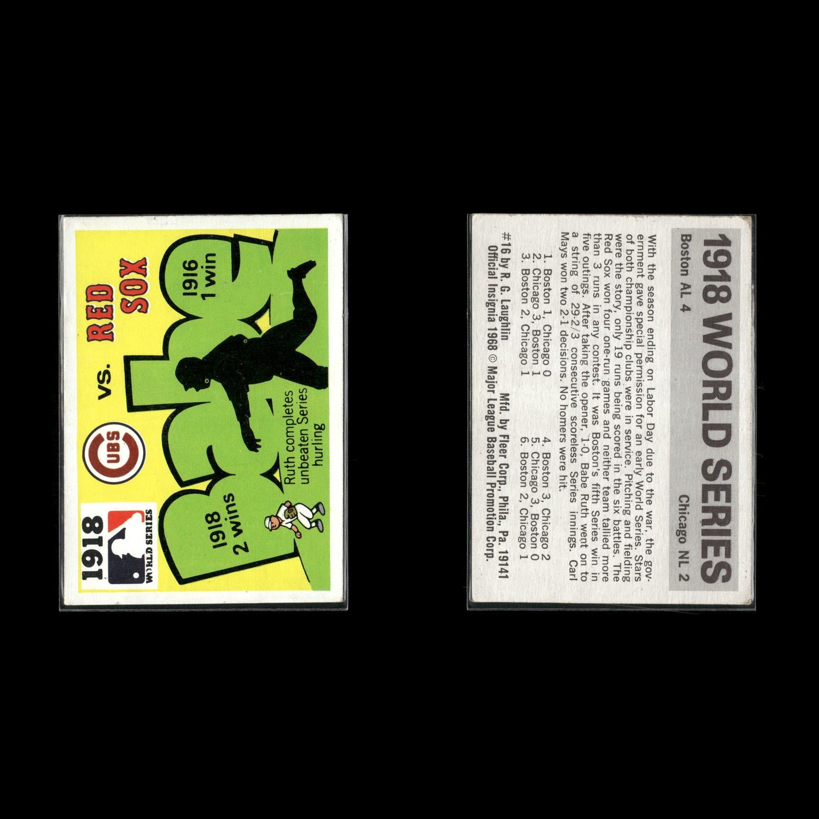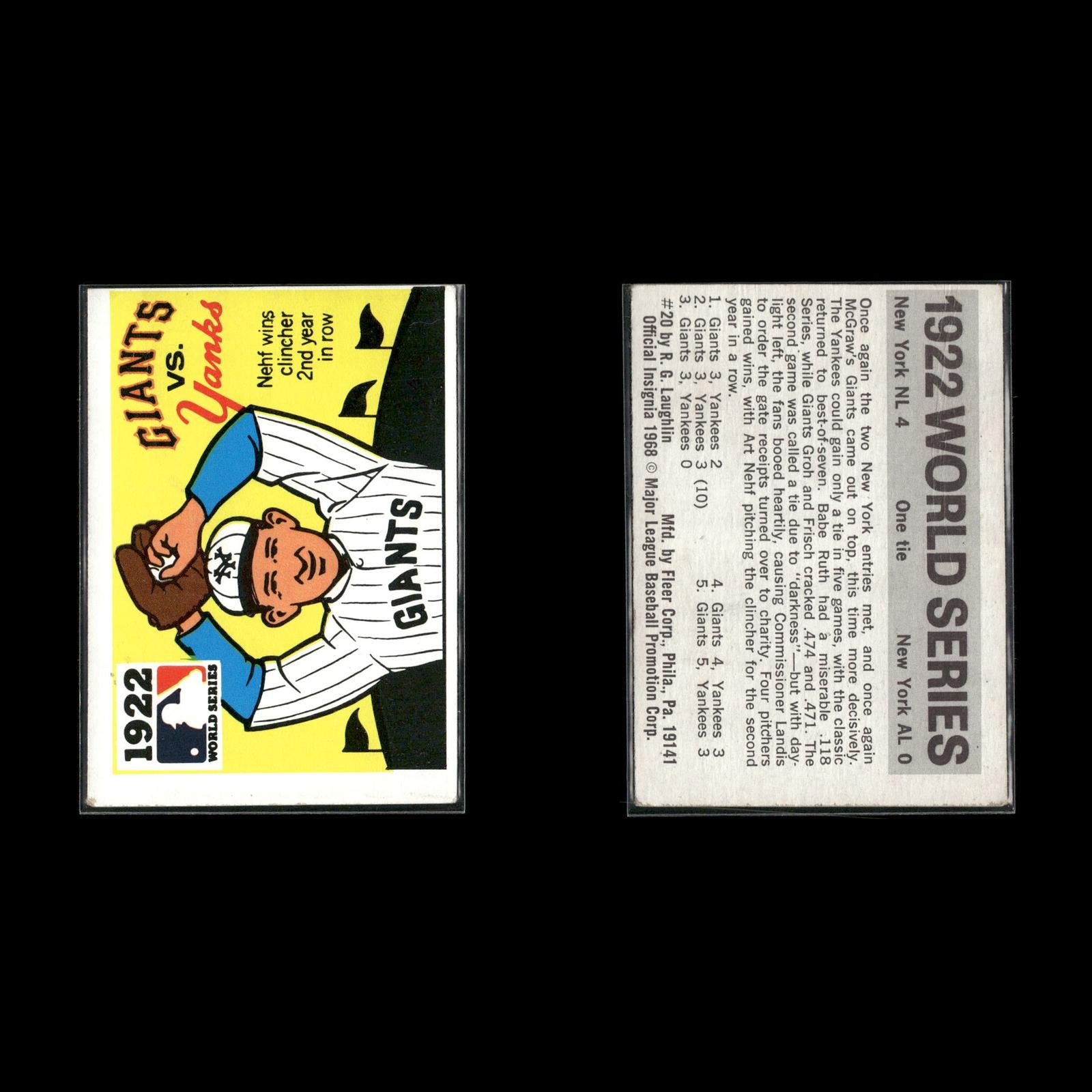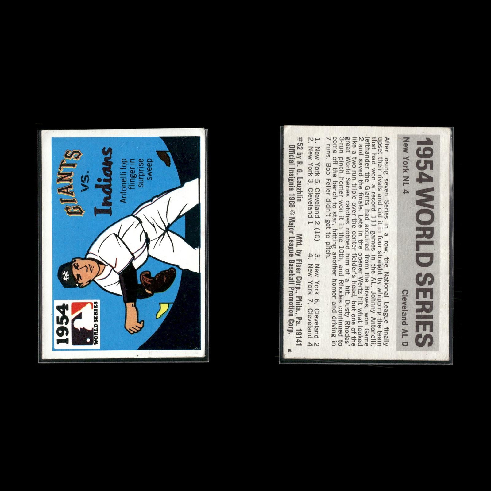 1908 - Cubs vs. Tigers - Ty Cobb #6 1971 Fleer World Series 1918 - Cubs vs. Red Sox - Babe Ruth #16 1971 Fleer World Series 1954 - Giants vs. Indians - Johnny Antonelli #52 1971 Fleer World Series 1922 - Giants vs. Yankees - Art Nehf #20 1971 Fleer World Series 1931 - Cardinals vs. A's - Pepper Martin #29 1971 Fleer World Series 1951 - Giants vs. Yankees - Ed Lopat #49 1971 Fleer World Series 1952 - Yankees vs. Dodgers - Johnny Mize #50 1971 Fleer World Series 1941 - Dodgers vs. Yankees #38 1971 Fleer World Series 1920 - Indians vs. Dodgers - Elmer Smith #18 1971 Fleer World Series 1953 - Yankees vs. Dodgers #51 1971 Fleer World Series
