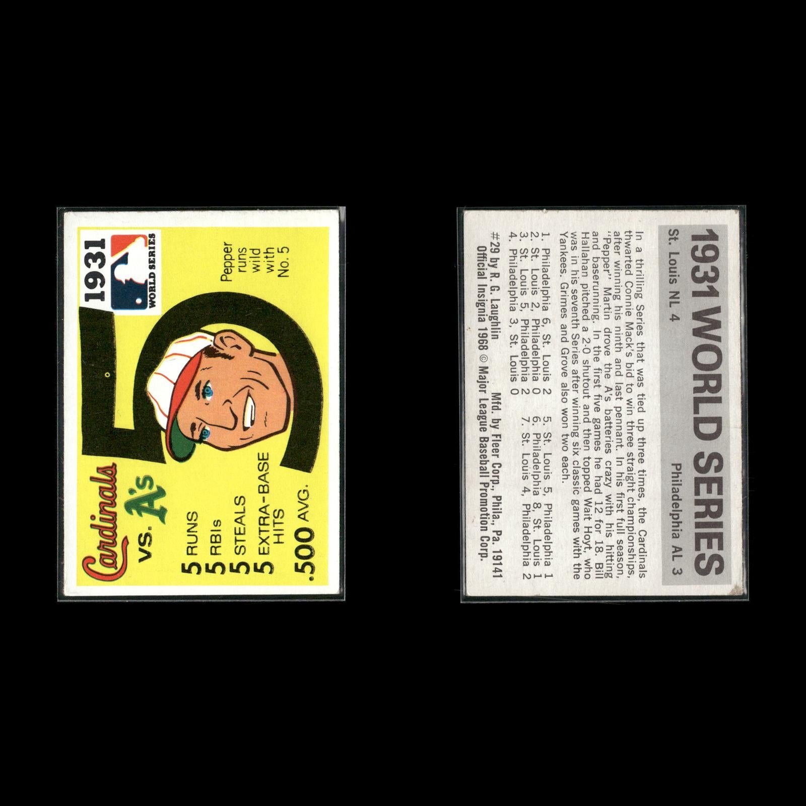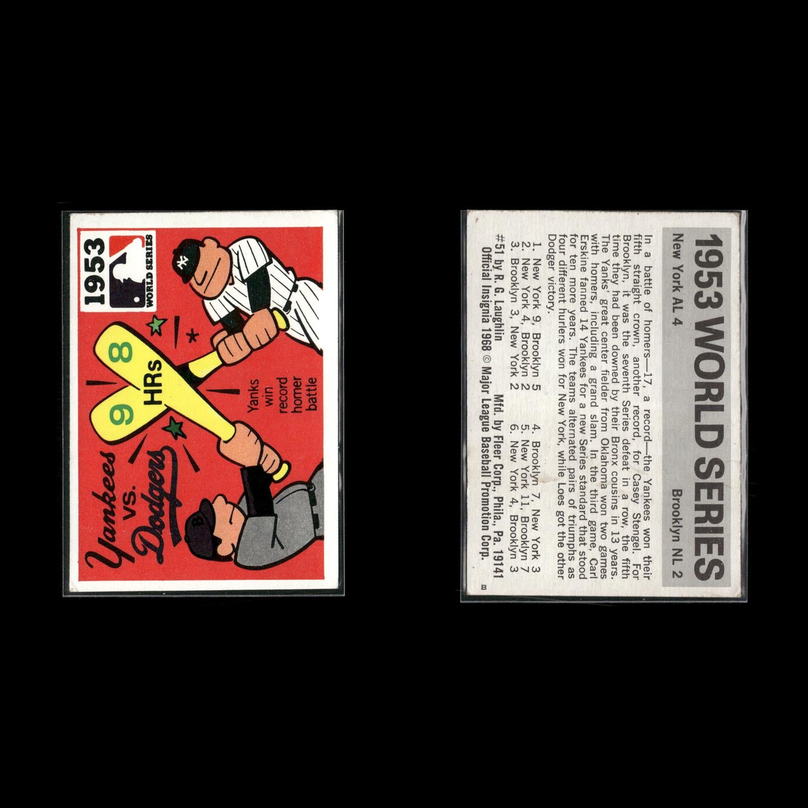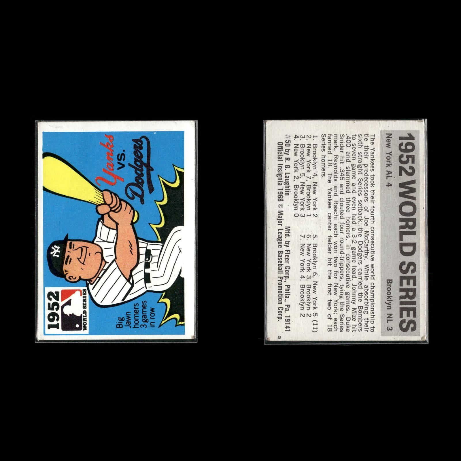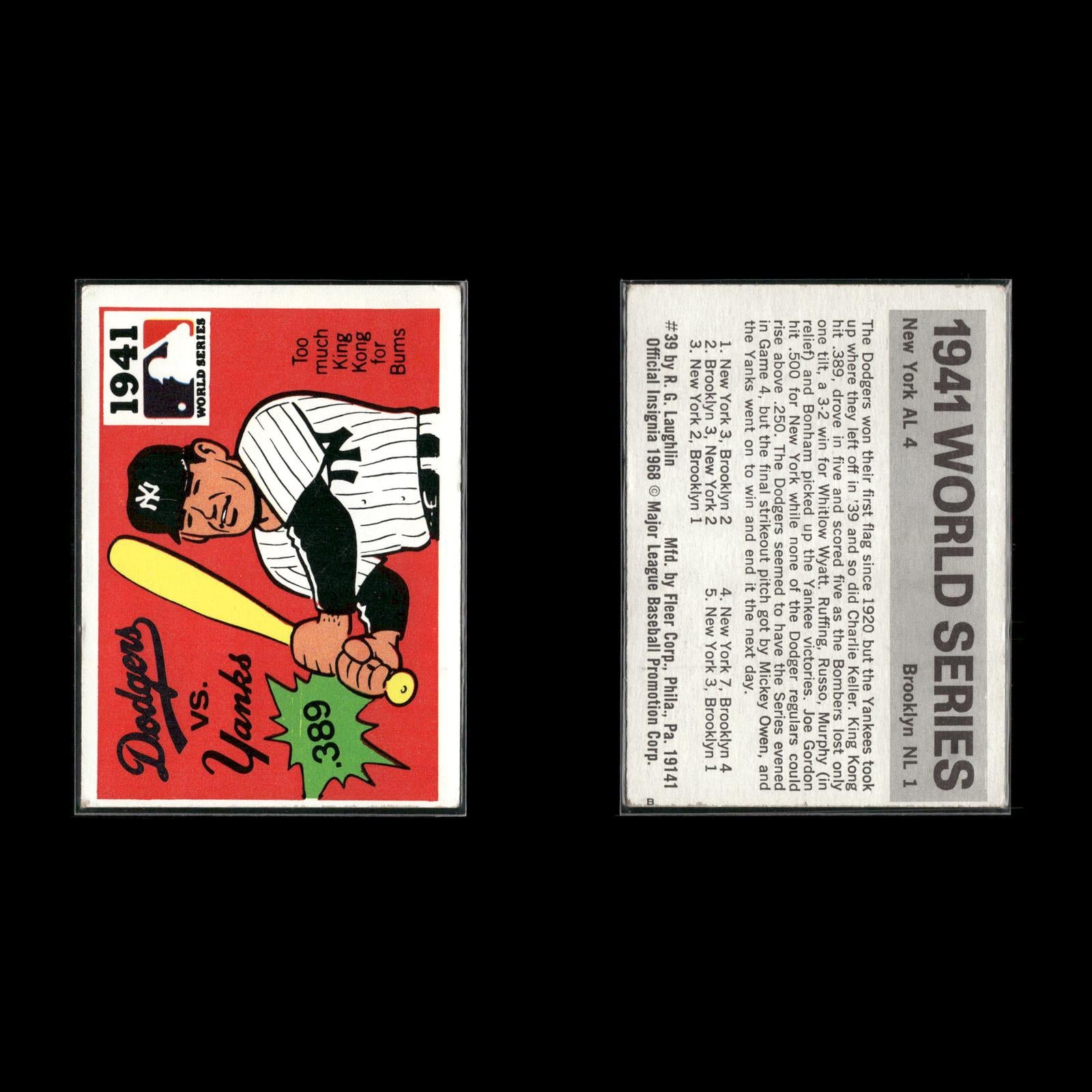 1908 - Cubs vs. Tigers - Ty Cobb #6 1971 Fleer World Series 1918 - Cubs vs. Red Sox - Babe Ruth #16 1971 Fleer World Series 1954 - Giants vs. Indians - Johnny Antonelli #52 1971 Fleer World Series 1922 - Giants vs. Yankees - Art Nehf #20 1971 Fleer World Series 1931 - Cardinals vs. A's - Pepper Martin #29 1971 Fleer World Series 1951 - Giants vs. Yankees - Ed Lopat #49 1971 Fleer World Series 1952 - Yankees vs. Dodgers - Johnny Mize #50 1971 Fleer World Series 1941 - Dodgers vs. Yankees #38 1971 Fleer World Series 1920 - Indians vs. Dodgers - Elmer Smith #18 1971 Fleer World Series 1953 - Yankees vs. Dodgers #51 1971 Fleer World Series