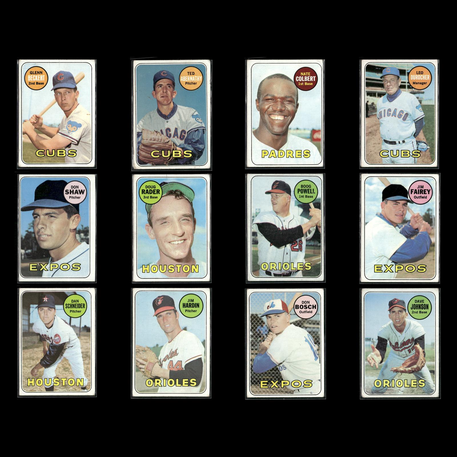Glenn Beckert #171 1969 Topps Chicago Cubs Ted Abernathy #483 1969 Topps Chicago Cubs Nate Colbert #408 1969 Topps San Diego Padres Leo Durocher #147 1969 Topps Chicago Cubs Don Shaw #183 1969 Topps Montreal Expos Doug Rader #119 1969 Topps Houston Astros Boog Powell #381 1969 Topps Baltimore Orioles Jim Fairey #117 1969 Topps Montreal Expos Dan Schneider #656 1969 Topps Houston Astros Jim Hardin #610 1969 Topps Baltimore Orioles Don Bosch #578 1969 Topps Montreal Expos Dave Johnson #203 1969 Topps Baltimore Orioles