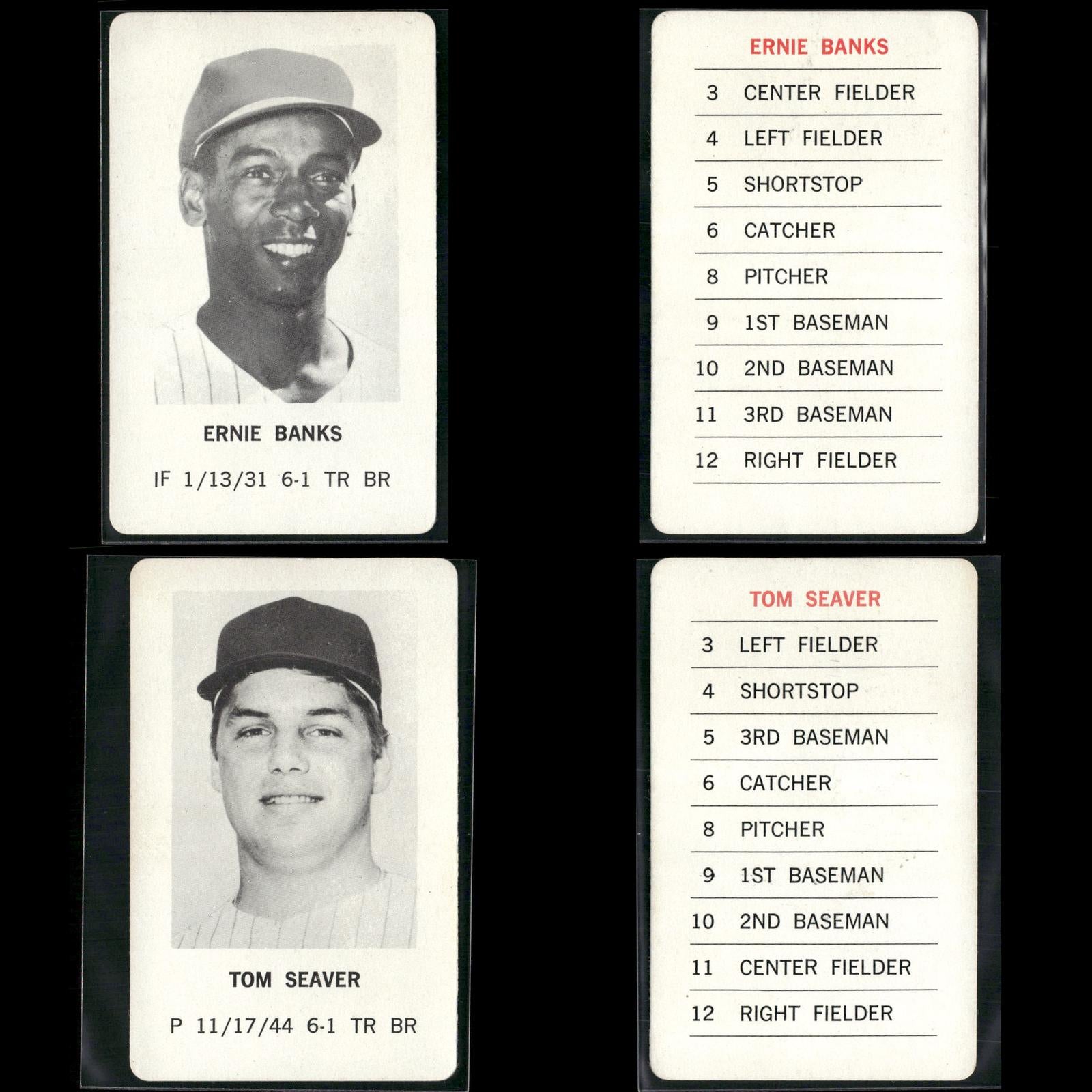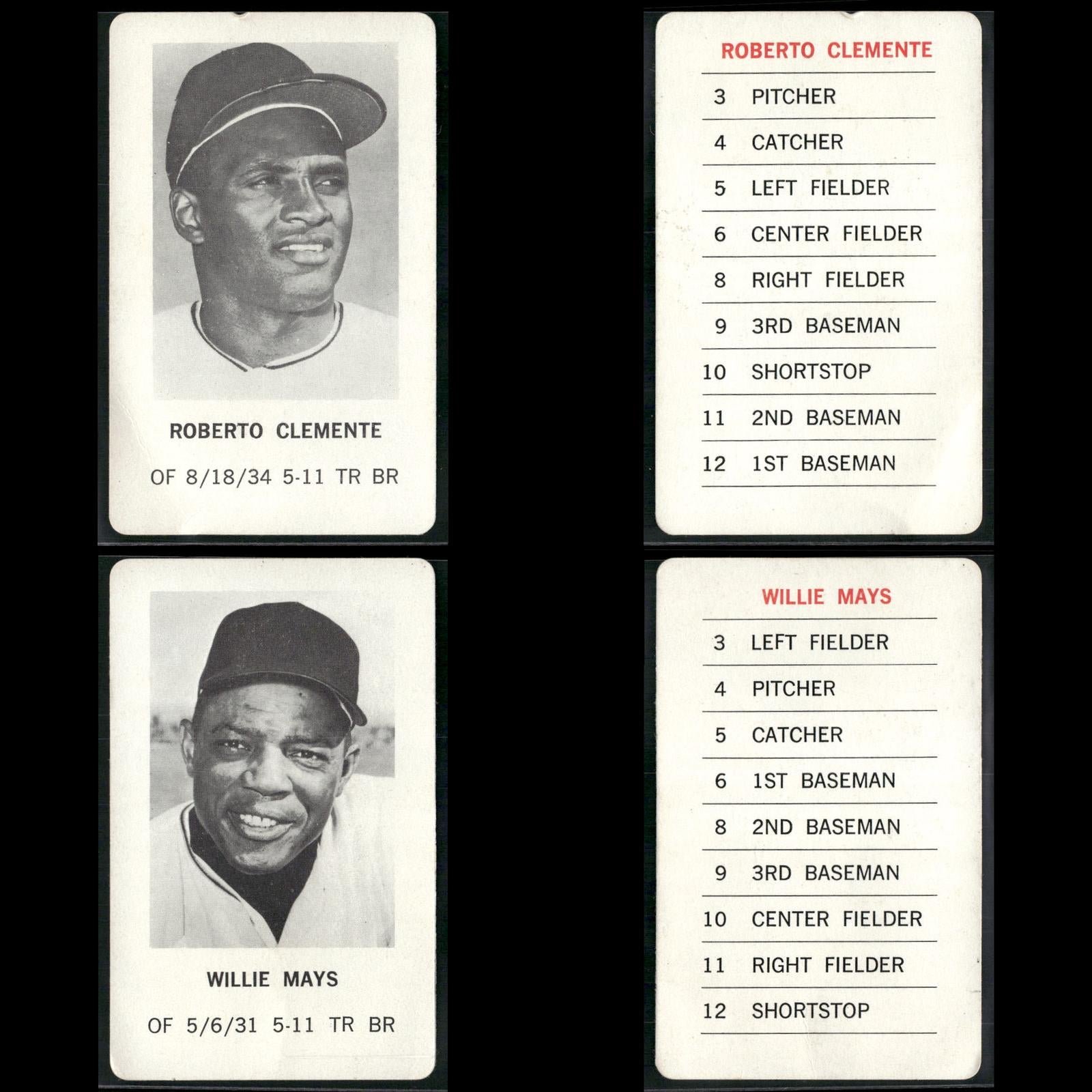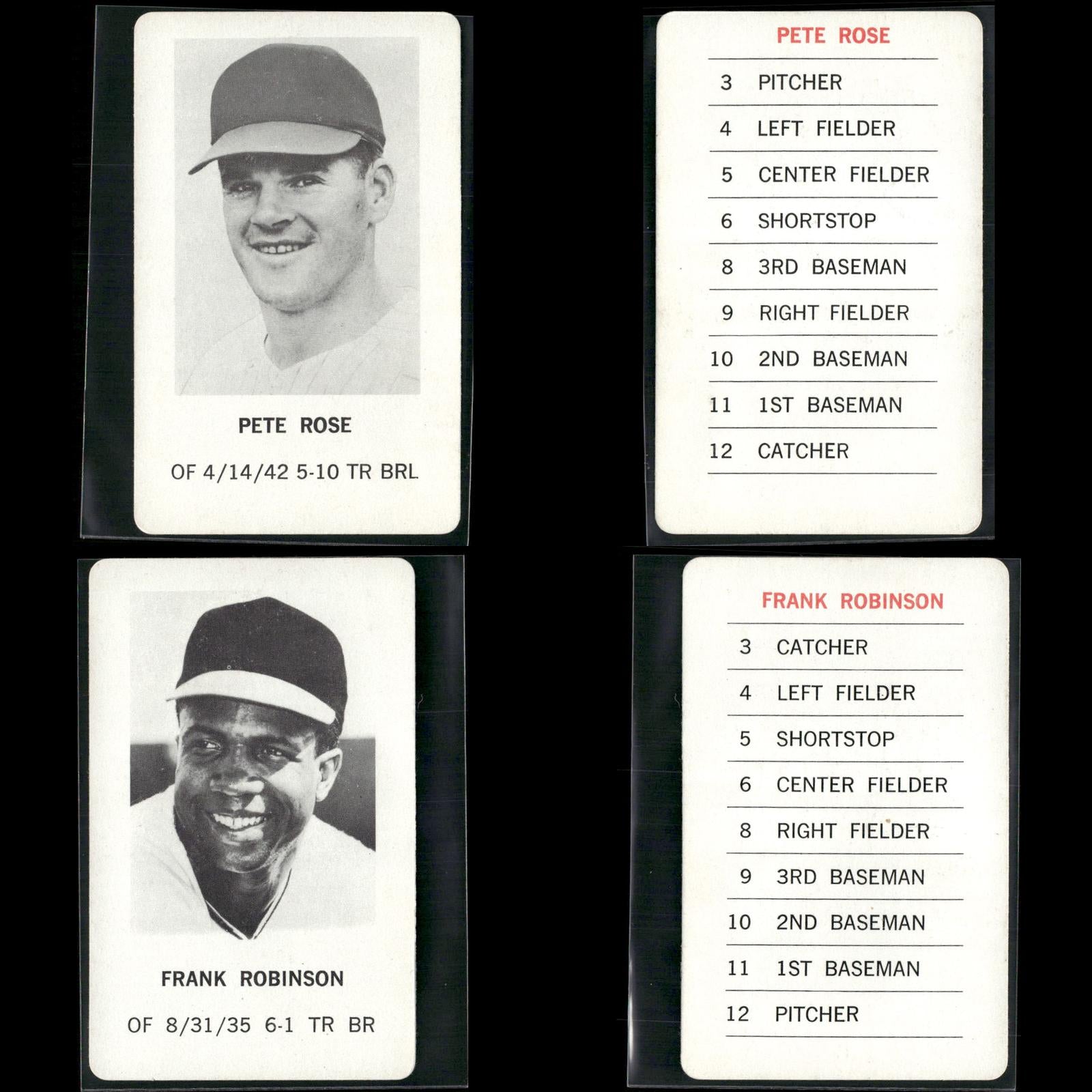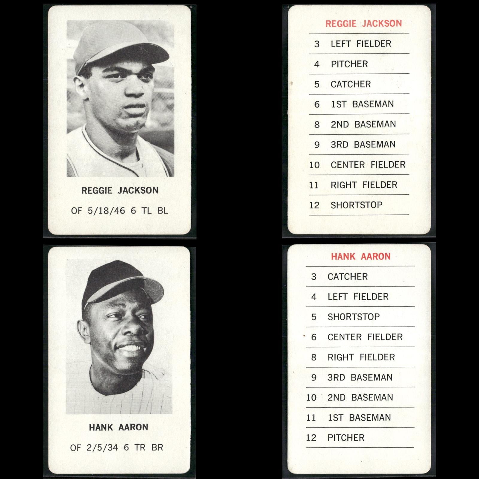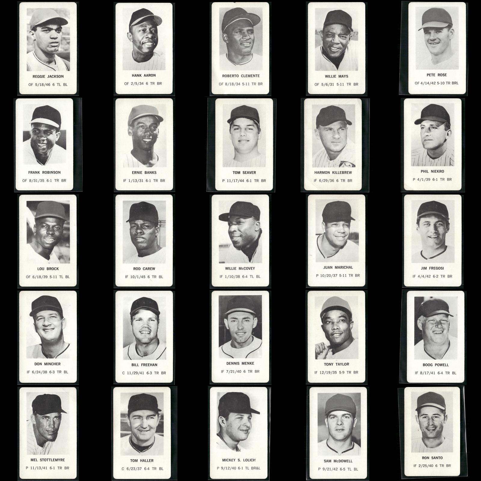 Reggie Jackson #NNO 1970 Milton Bradley Oakland Athletics Hank Aaron #NNO 1970 Milton Bradley Atlanta Braves Roberto Clemente #NNO 1970 Milton Bradley Pittsburgh Pirates Willie Mays #NNO 1970 Milton Bradley San Francisco Giants Pete Rose #NNO 1970 Milton Bradley Cincinnati Reds Frank Robinson #NNO 1970 Milton Bradley Baltimore Orioles Ernie Banks #NNO 1970 Milton Bradley Chicago Cubs Tom Seaver #NNO 1970 Milton Bradley New York Mets Harmon Killebrew #NNO 1970 Milton Bradley Minnesota Twins Phil Niekro #NNO 1970 Milton Bradley Atlanta Braves Lou Brock #NNO 1970 Milton Bradley St. Louis Cardinals Rod Carew #NNO 1970 Milton Bradley Minnesota Twins Willie McCovey #NNO 1970 Milton Bradley San Francisco Giants Juan Marichal #NNO 1970 Milton Bradley San Francisco Giants Jim Fregosi #NNO 1970 Milton Bradley California Angels Don Mincher #NNO 1970 Milton Bradley Seattle Pilots Bill Freehan #NNO 1970 Milton Bradley Detroit Tigers Denis Menke #NNO 1970 Milton Bradley Houston Astros Tony Taylor #NNO 1970 Milton Bradley Philadelphia Phillies Boog Powell #NNO 1970 Milton Bradley Baltimore Orioles Mel Stottlemyre #NNO 1970 Milton Bradley New York Yankees Tom Haller #NNO 1970 Milton Bradley Los Angeles Dodgers Mickey Lolich #NNO 1970 Milton Bradley Detroit Tigers Sam McDowell #NNO 1970 Milton Bradley Cleveland Indians Ron Santo #NNO 1970 Milton Bradley Chicago Cubs