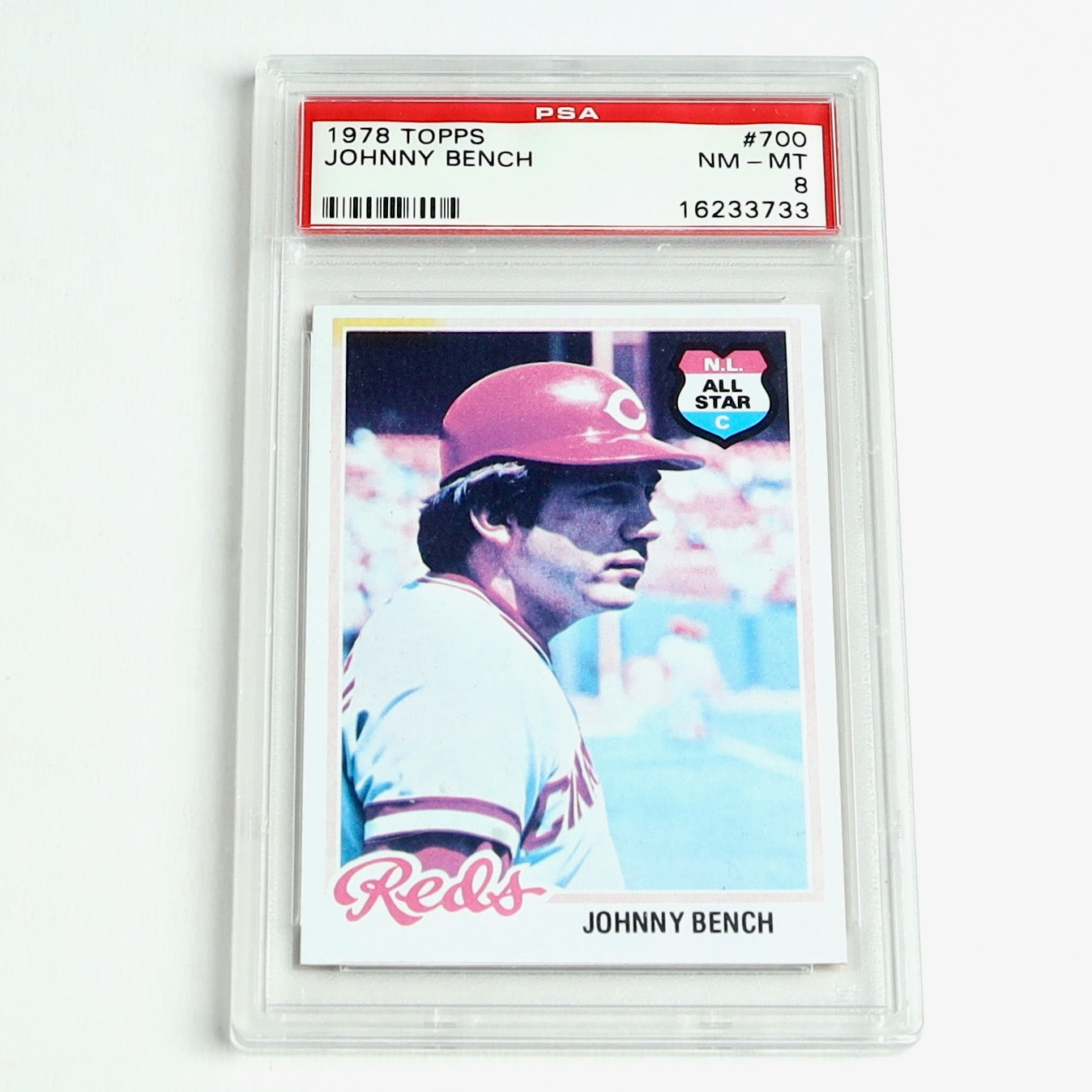 This is a 1978 Topps Johnny Bench #700 baseball card, graded PSA 8 (Near Mint–Mint). The card features the legendary Cincinnati Reds catcher and Hall of Famer. Please note: while the card is PSA graded, it appears to have some visible sun fading/discoloration on the front, likely from display exposure.