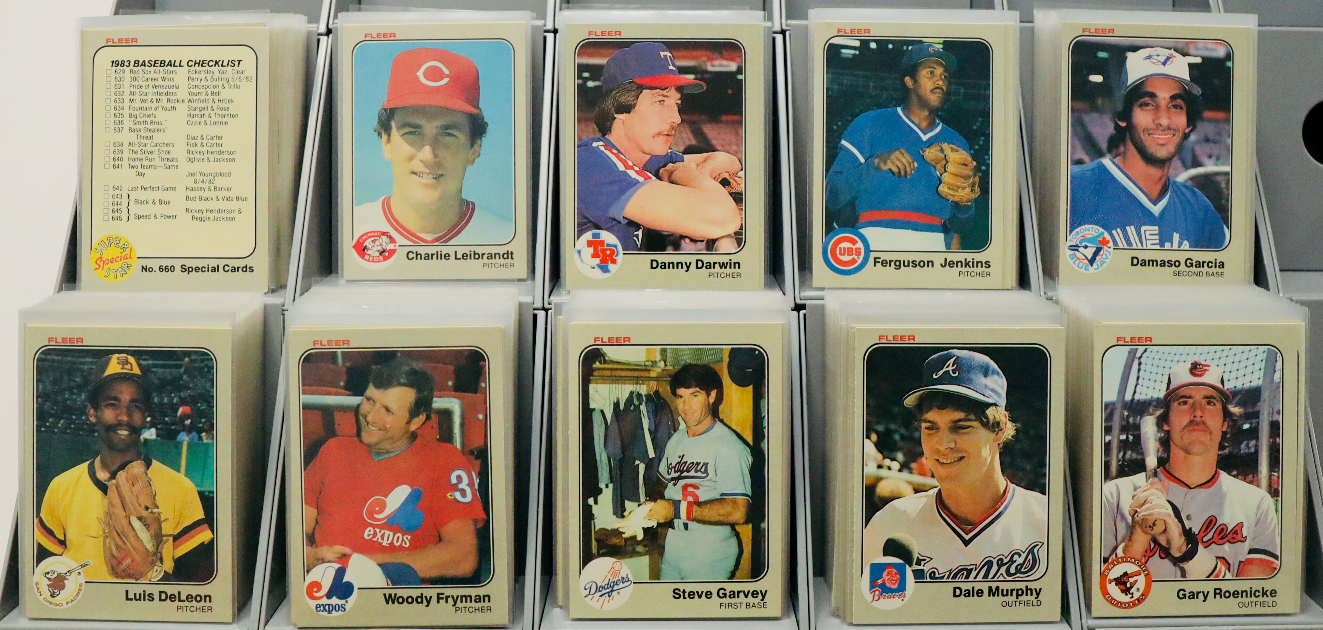 Full 1983 Fleer Baseball set (#1–660) with every card in a sleeve. The condition spans Poor to VG+, suitable for collectors looking for a complete set of this classic Fleer release. Notable players include Wade Boggs, Tony Gwynn, and Ryne Sandberg rookies.