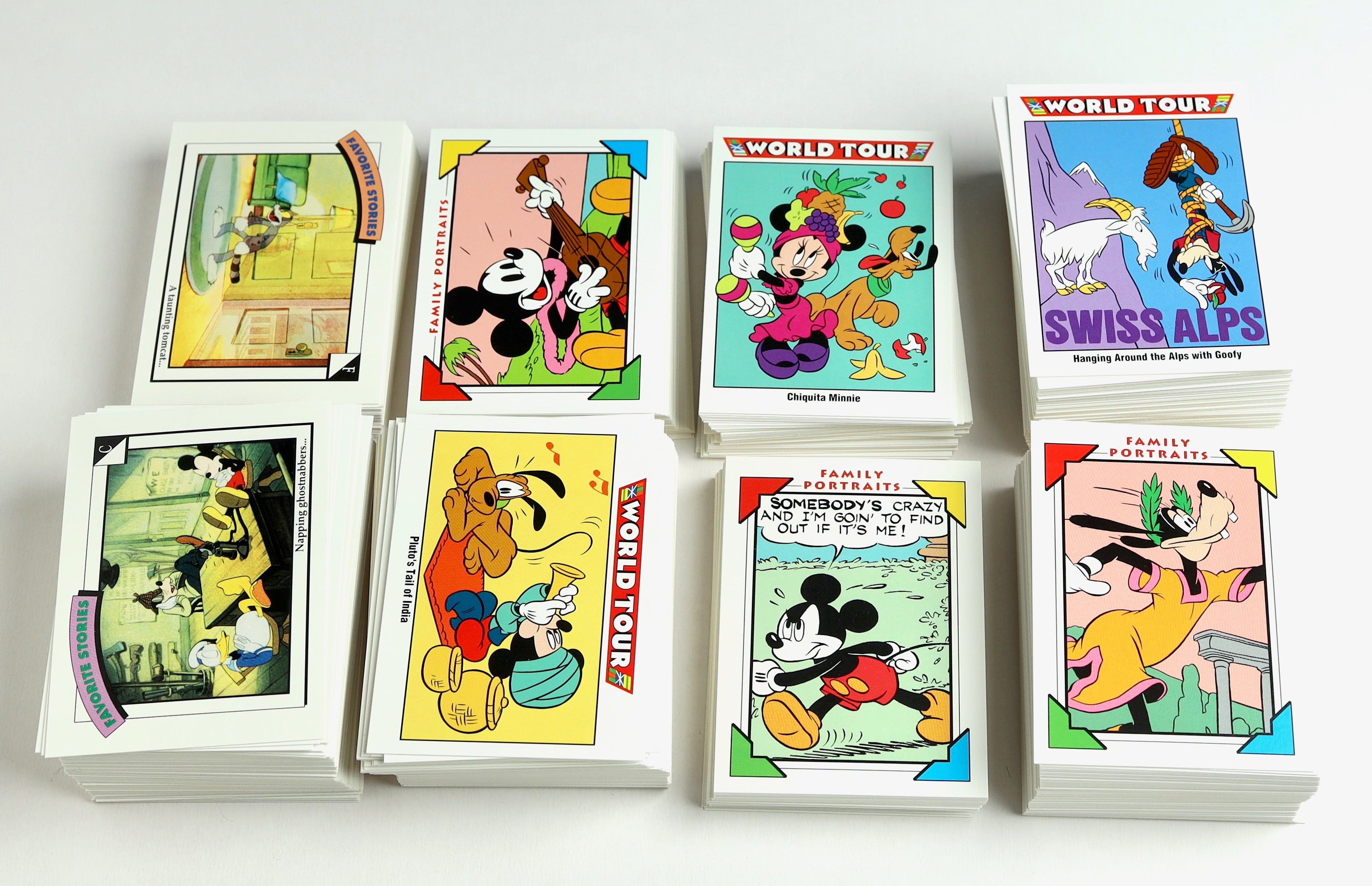 This listing is for a large lot of over 300 cards from the 1991 Disney Impel trading card set. These officially licensed cards feature vibrant artwork and classic scenes starring beloved characters such as Mickey Mouse, Goofy, Minnie, Donald Duck, and Pluto. Cards include subsets like World Tour, Family Portraits, and Favorite Stories. Great for collectors or Disney fans.