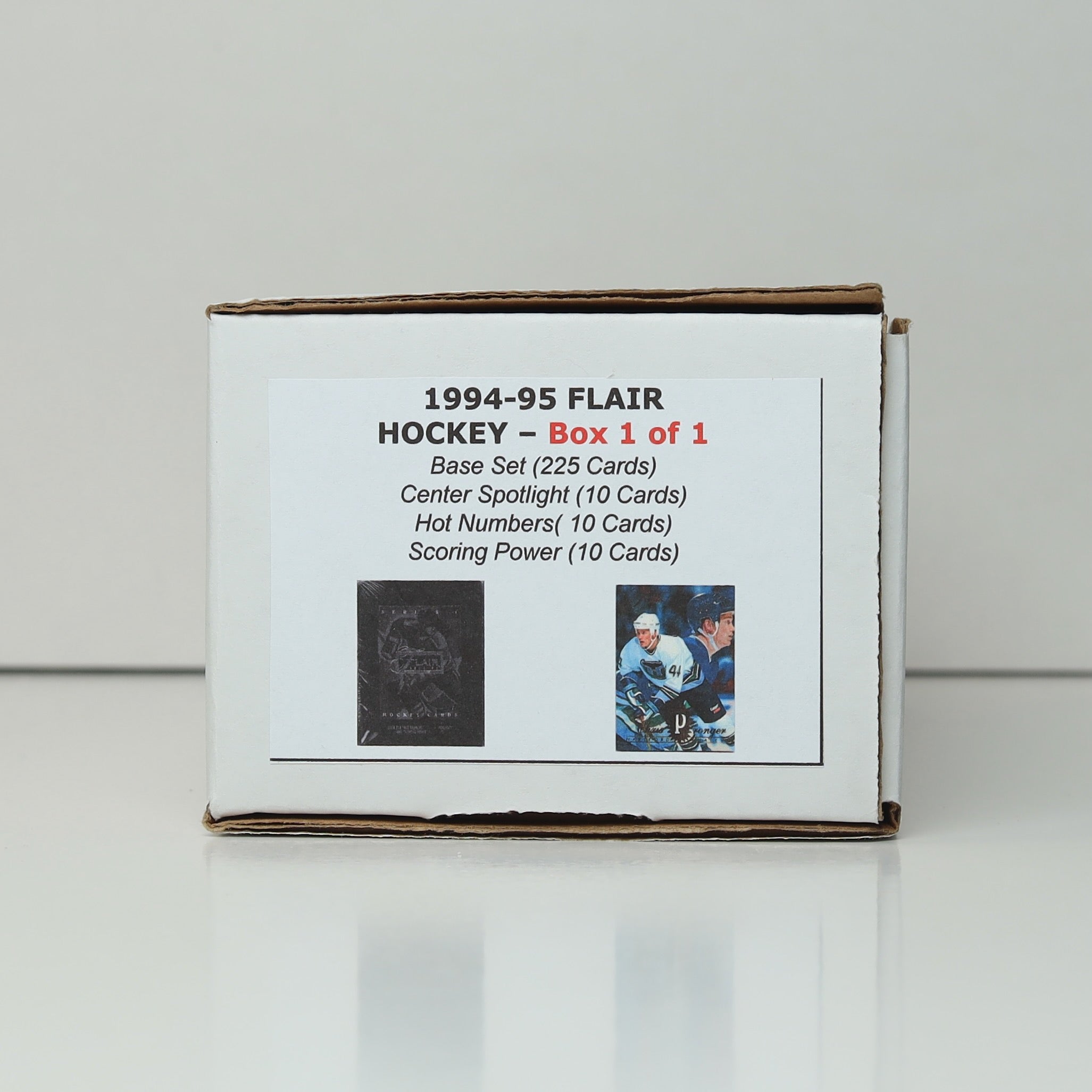 This listing includes the complete 1994-95 Flair Hockey card set in Near Mint condition. The box contains the full base set of 225 cards, along with all insert subsets: Center Spotlight (10 cards), Hot Numbers (10 cards), and Scoring Power (10 cards). A great addition for collectors of premium early '90s hockey cards.