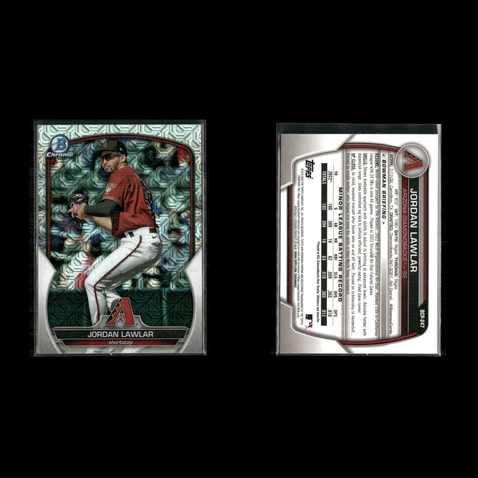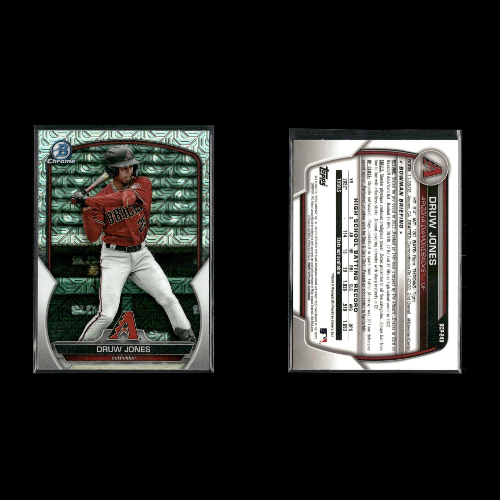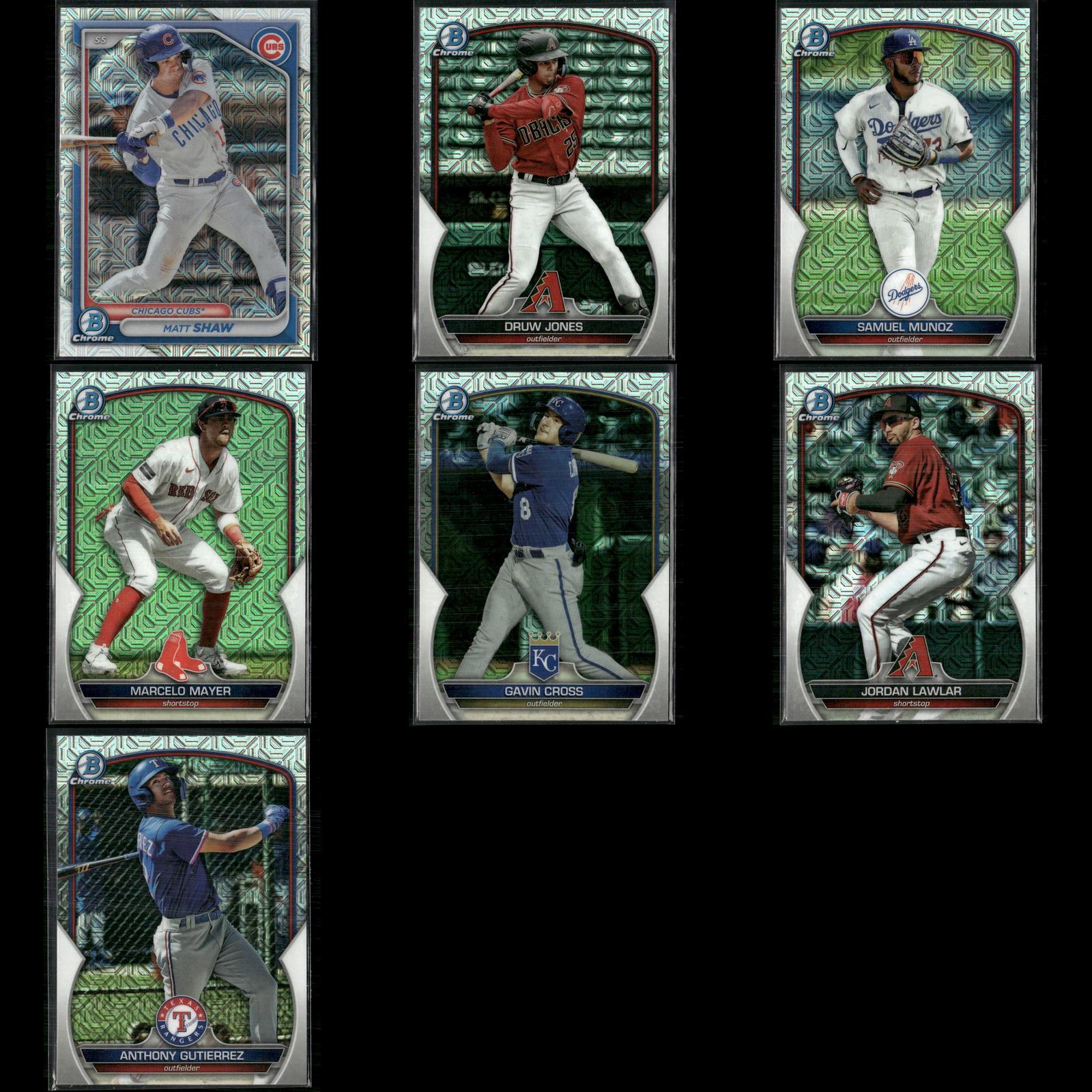 Matt Shaw #BCP-30 2024 Bowman Chrome Prospects Mojo Refractor Chicago Cubs Druw Jones #BCP-249 2023 Bowman Chrome Prospects Mojo Refractor Arizona Diamondbacks Samuel Munoz #BCP-182 2023 Bowman Chrome Prospects Mojo Refractor Los Angeles Dodgers Marcelo Mayer #BCP-210 2023 Bowman Chrome Prospects Mojo Refractor Boston Red Sox Gavin Cross #BCP-160 2023 Bowman Chrome Prospects Mojo Refractor Kansas City Royals Jordan Lawlar #BCP-247 2023 Bowman Chrome Prospects Mojo Refractor Arizona Diamondbacks Anthony Gutierrez #BCP-166 2023 Bowman Chrome Prospects Mojo Refractor Texas Rangers