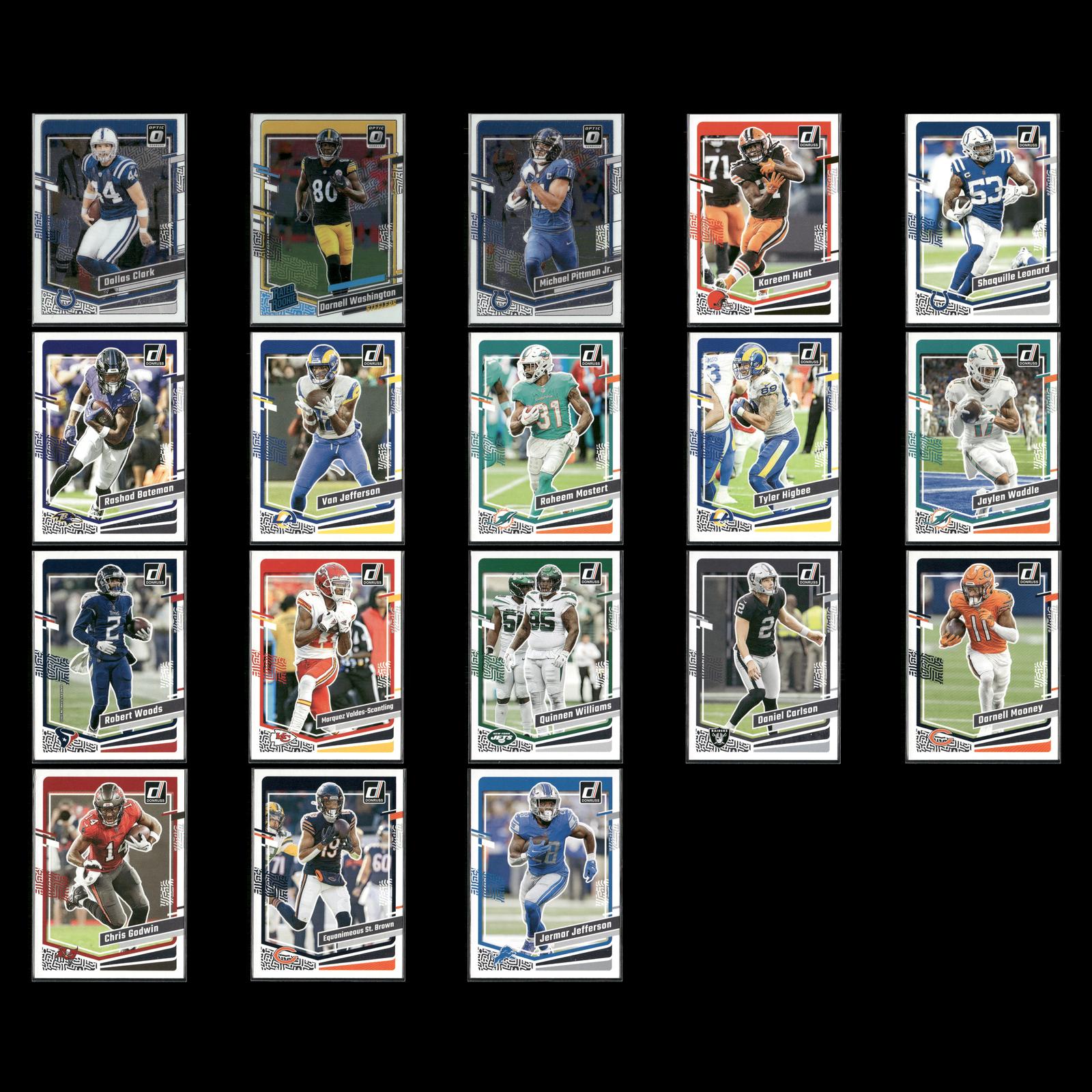 Dallas Clark #76 2023 Donruss Optic Indianapolis Colts Darnell Washington Rookie #286 2023 Donruss Optic Pittsburgh Steelers Michael Pittman Jr. #79 2023 Donruss Optic Indianapolis Colts Kareem Hunt #67 2023 Donruss Cleveland Browns Shaquille Leonard #131 2023 Donruss Indianapolis Colts Rashod Bateman #20 2023 Donruss Baltimore Ravens Van Jefferson #171 2023 Donruss Los Angeles Rams Raheem Mostert #189 2023 Donruss Miami Dolphins Tyler Higbee #170 2023 Donruss Los Angeles Rams Jaylen Waddle #185 2023 Donruss Miami Dolphins Robert Woods #123 2023 Donruss Houston Texans Marquez Valdes-Scantling #147 2023 Donruss Kansas City Chiefs Quinnen Williams #234 2023 Donruss New York Jets Daniel Carlson #173 2023 Donruss Las Vegas Raiders Darnell Mooney #50 2023 Donruss Chicago Bears Chris Godwin #277 2023 Donruss Tampa Bay Buccaneers Equanimeous St. Brown #53 2023 Donruss Chicago Bears Jermar Jefferson #100 2023 Donruss Detroit Lions