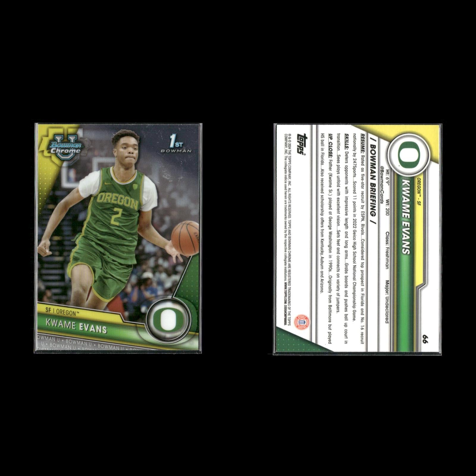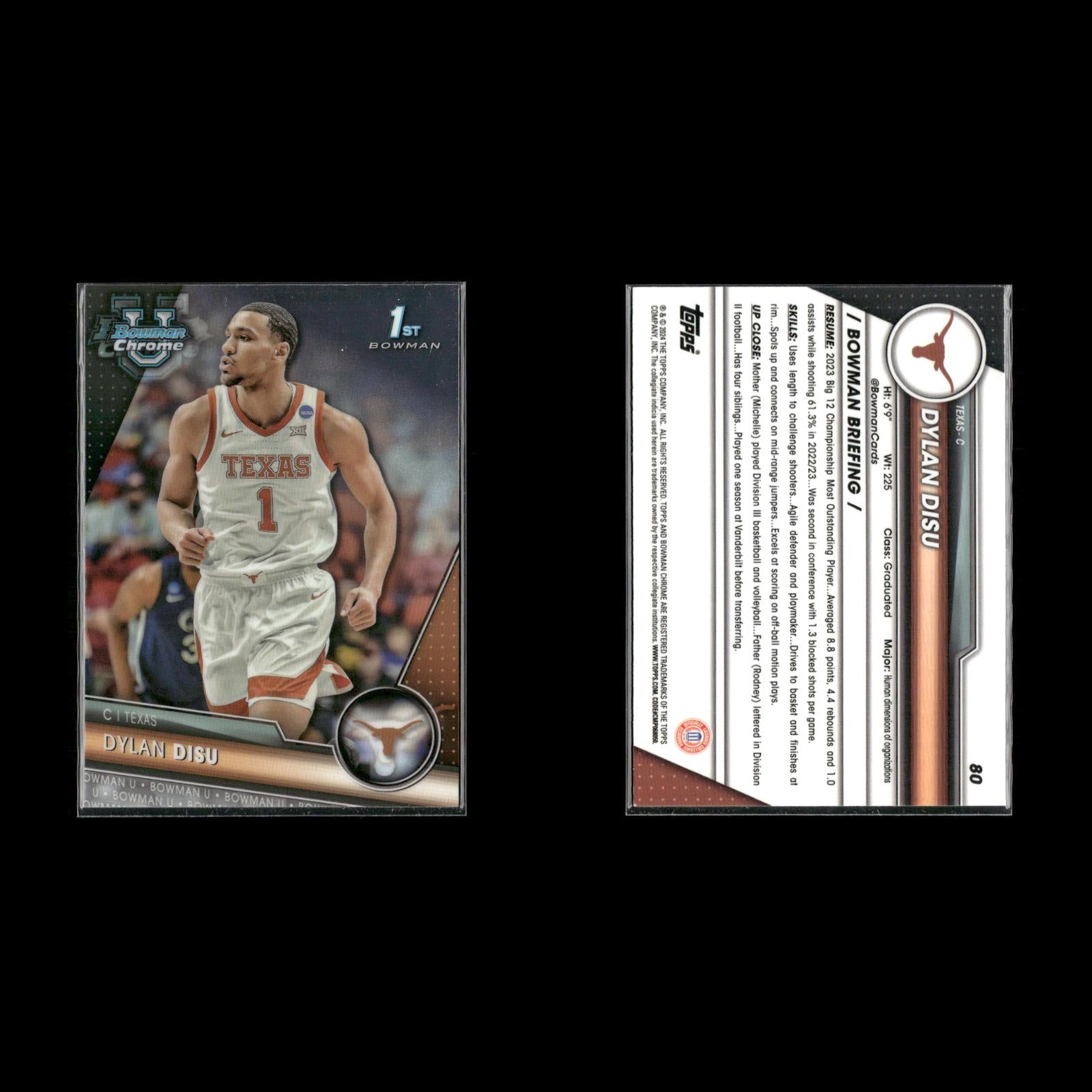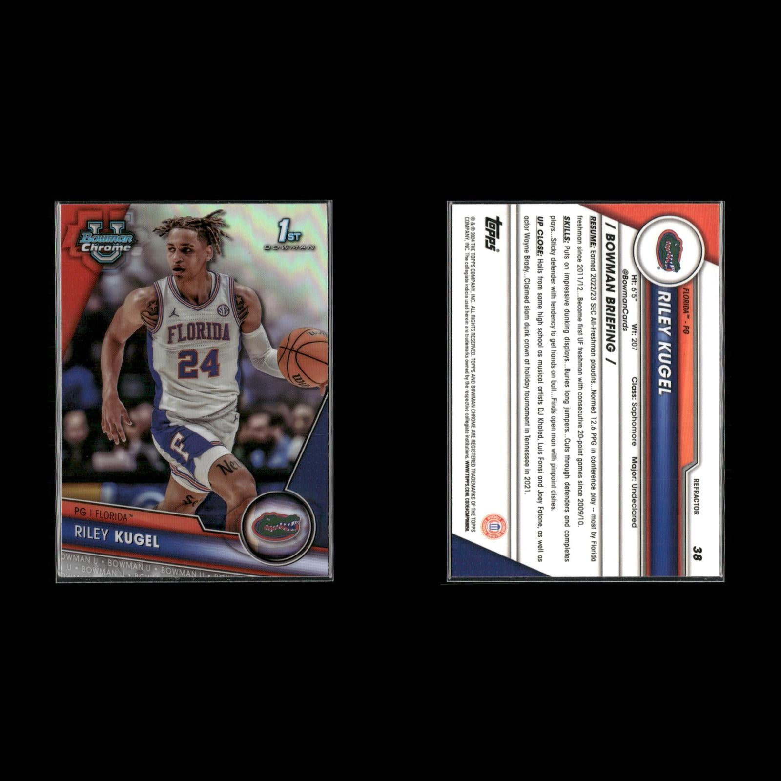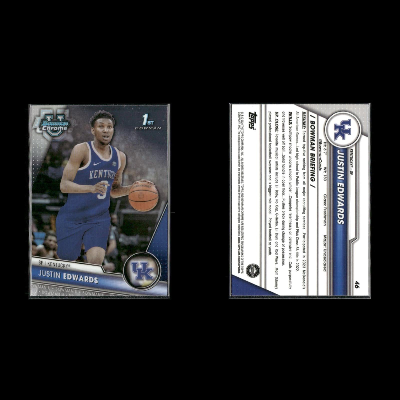 Colby Jones #69 2021-22 Bowman University Pink Xavier Musketeers David McCormack #BCPA-DM 2021-22 Bowman University Chrome Prospect Autographs Lava #/199 Kansas Jayhawks Miro Little #12 2023-24 Bowman University Chrome Baylor Bears Garwey Dual #69 2023-24 Bowman University Chrome Providence Friars Dylan Disu #80 2023-24 Bowman University Chrome Texas Longhorns Isaac McKneely #27 2023-24 Bowman University Chrome Virginia Cavaliers Justin Edwards #46 2023-24 Bowman University Chrome Kentucky Wildcats Rejean Ellis #29 2023-24 Bowman University Chrome USC Trojans Max Abmas #81 2023-24 Bowman University Chrome Texas Longhorns Malik Hall #55 2023-24 Bowman University Chrome Michigan State Spartans Aaron Bradshaw #42 2023-24 Bowman University Chrome Kentucky Wildcats Mark Sears #72 2023-24 Bowman University Chrome Refractor Alabama Crimson Tide Riley Kugel #38 2023-24 Bowman University Chrome Florida Gators RJ Jones #37 2023-24 Bowman University Chrome Kansas State Wildcats Solomon Ball #89 2023-24 Bowman University Chrome Connecticut Huskies Reed Sheppard #45 2023-24 Bowman University Chrome Kentucky Wildcats Kwame Evans #66 2023-24 Bowman University Chrome Oregon Ducks Omaha Biliew #32 2023-24 Bowman University Chrome Iowa State Cyclones Kyle Filipowski #23 2023-24 Bowman University Chrome Duke Blue Devils Zaccharie Risacher #9 2023-24 Bowman University Chrome Xavier Booker #57 2023-24 Bowman University Chrome Michigan State Spartans