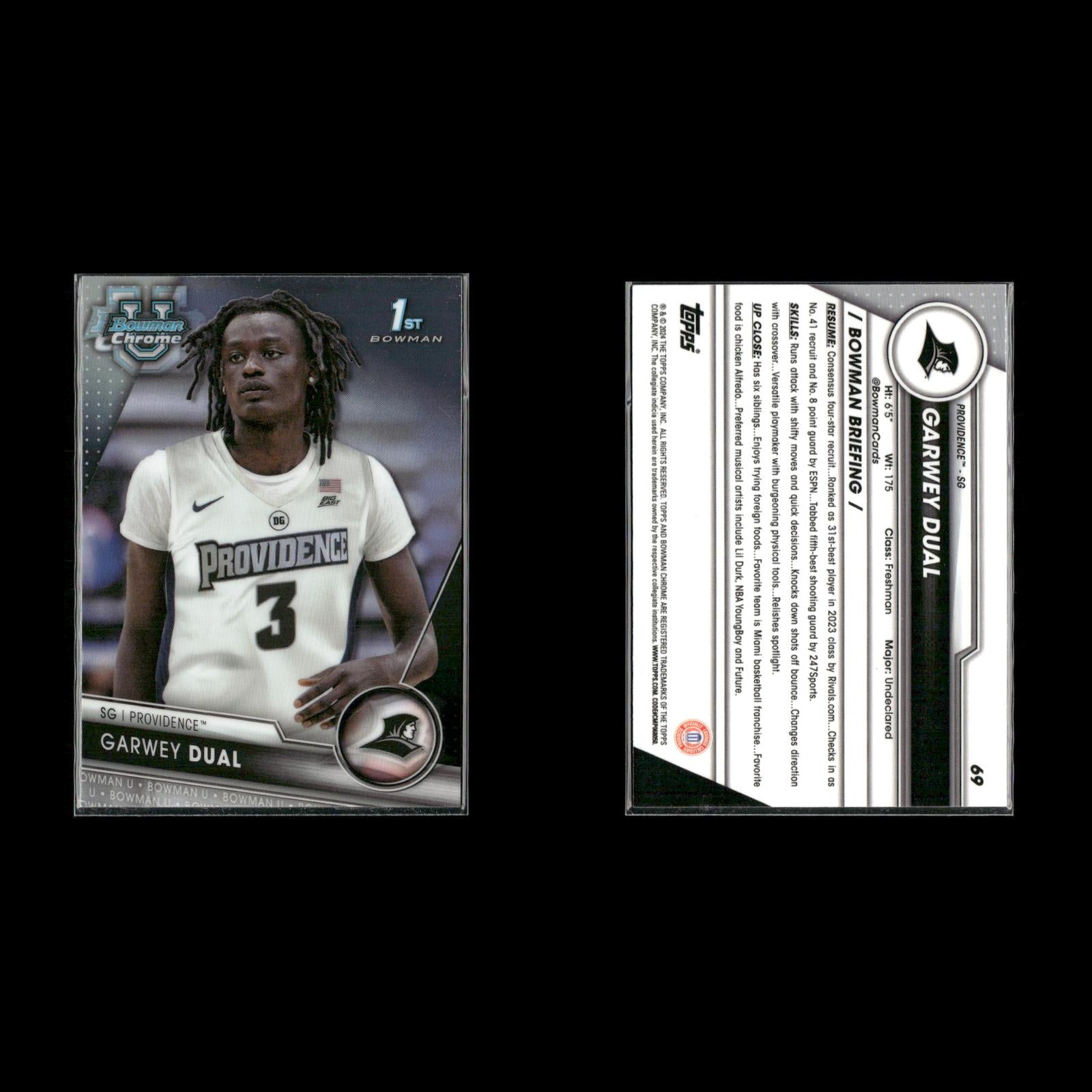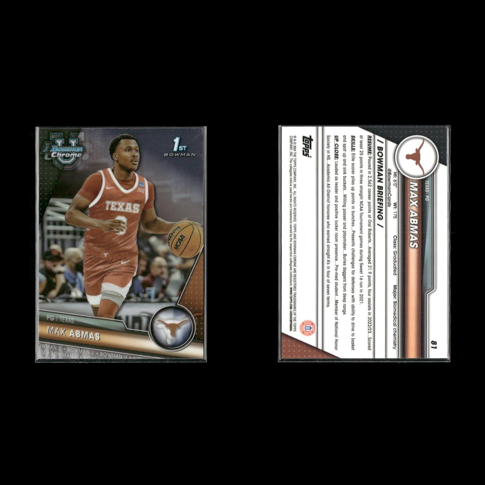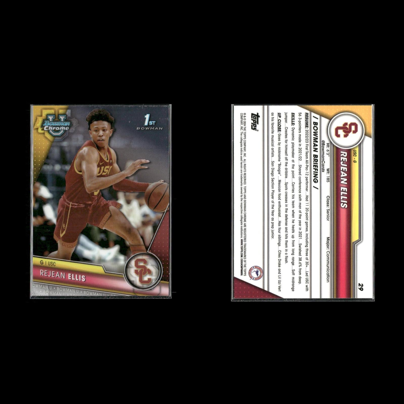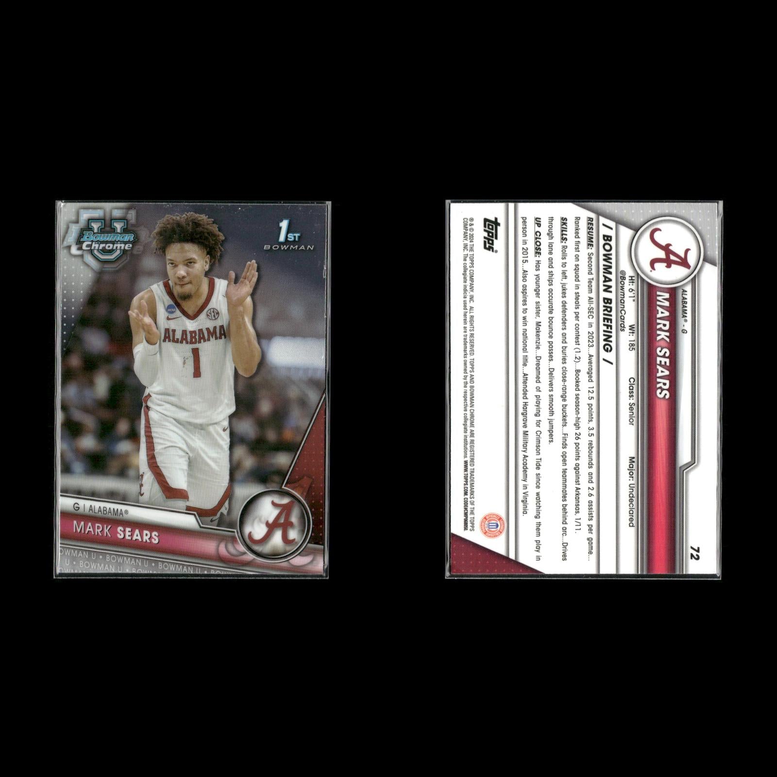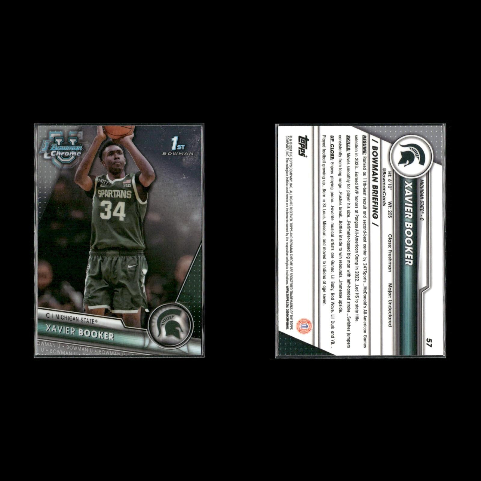 Colby Jones #69 2021-22 Bowman University Pink Xavier Musketeers David McCormack #BCPA-DM 2021-22 Bowman University Chrome Prospect Autographs Lava #/199 Kansas Jayhawks Miro Little #12 2023-24 Bowman University Chrome Baylor Bears Garwey Dual #69 2023-24 Bowman University Chrome Providence Friars Dylan Disu #80 2023-24 Bowman University Chrome Texas Longhorns Isaac McKneely #27 2023-24 Bowman University Chrome Virginia Cavaliers Justin Edwards #46 2023-24 Bowman University Chrome Kentucky Wildcats Rejean Ellis #29 2023-24 Bowman University Chrome USC Trojans Max Abmas #81 2023-24 Bowman University Chrome Texas Longhorns Malik Hall #55 2023-24 Bowman University Chrome Michigan State Spartans Aaron Bradshaw #42 2023-24 Bowman University Chrome Kentucky Wildcats Mark Sears #72 2023-24 Bowman University Chrome Refractor Alabama Crimson Tide Riley Kugel #38 2023-24 Bowman University Chrome Florida Gators RJ Jones #37 2023-24 Bowman University Chrome Kansas State Wildcats Solomon Ball #89 2023-24 Bowman University Chrome Connecticut Huskies Reed Sheppard #45 2023-24 Bowman University Chrome Kentucky Wildcats Kwame Evans #66 2023-24 Bowman University Chrome Oregon Ducks Omaha Biliew #32 2023-24 Bowman University Chrome Iowa State Cyclones Kyle Filipowski #23 2023-24 Bowman University Chrome Duke Blue Devils Zaccharie Risacher #9 2023-24 Bowman University Chrome Xavier Booker #57 2023-24 Bowman University Chrome Michigan State Spartans