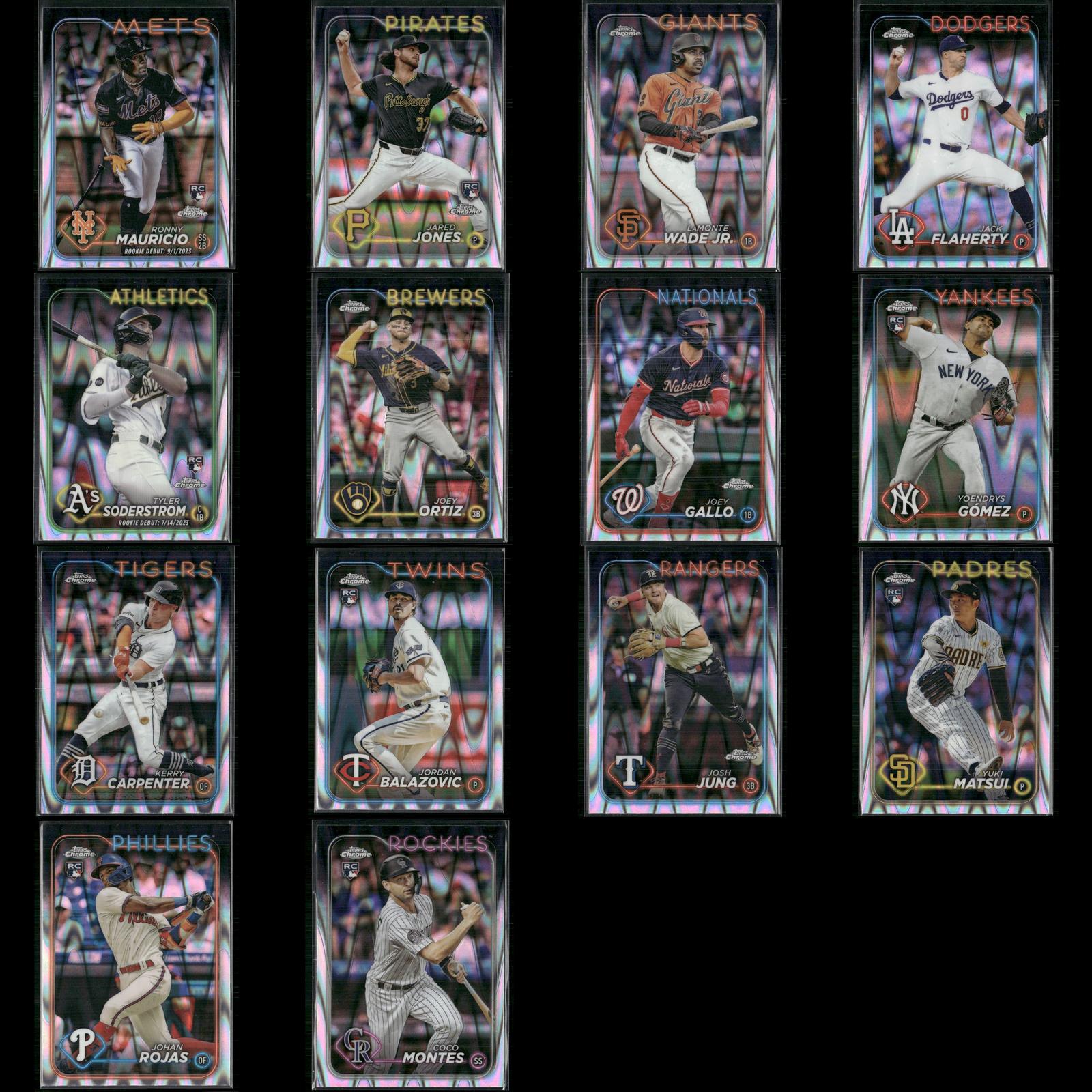 Ronny Mauricio #USC41 2024 Topps Chrome Update RayWave Refractors New York Mets Jared Jones Rookie #96 2024 Topps Chrome #96 Raywave Refractors Pittsburgh Pirates LaMonte Wade Jr. #222 2024 Topps Chrome Raywave Refractors San Francisco Giants Jack Flaherty #USC114 2024 Topps Chrome Update RayWave Refractors Los Angeles Dodgers Tyler Soderstrom #USC22 2024 Topps Chrome Update RayWave Refractors Oakland Athletics Joey Ortiz #US257 2024 Topps Update #US257 Raywave Refractors Milwaukee Brewers Joey Gallo #USC7 2024 Topps Chrome Update RayWave Refractors Washington Nationals Yoendrys Gómez Rookie #160 2024 Topps Chrome Raywave Refractors New York Yankees Kerry Carpenter #196 2024 Topps Chrome Raywave Refractors Detroit Tigers Jordan Balazovic Rookie #198 2024 Topps Chrome Raywave Refractors Minnesota Twins Josh Jung #214 2024 Topps Chrome Raywave Refractors Texas Rangers Yuki Matsui Rookie #116 2024 Topps Chrome Raywave Refractors San Diego Padres Johan Rojas Rookie #273 2024 Topps Chrome Raywave Refractors Philadelphia Phillies Coco Montes Rookie #182 2024 Topps Chrome Raywave Refractors Colorado Rockies