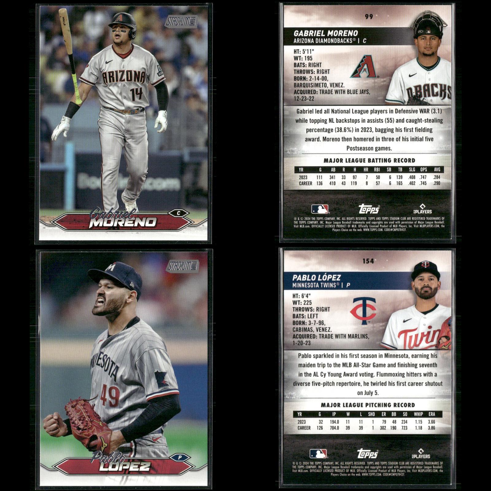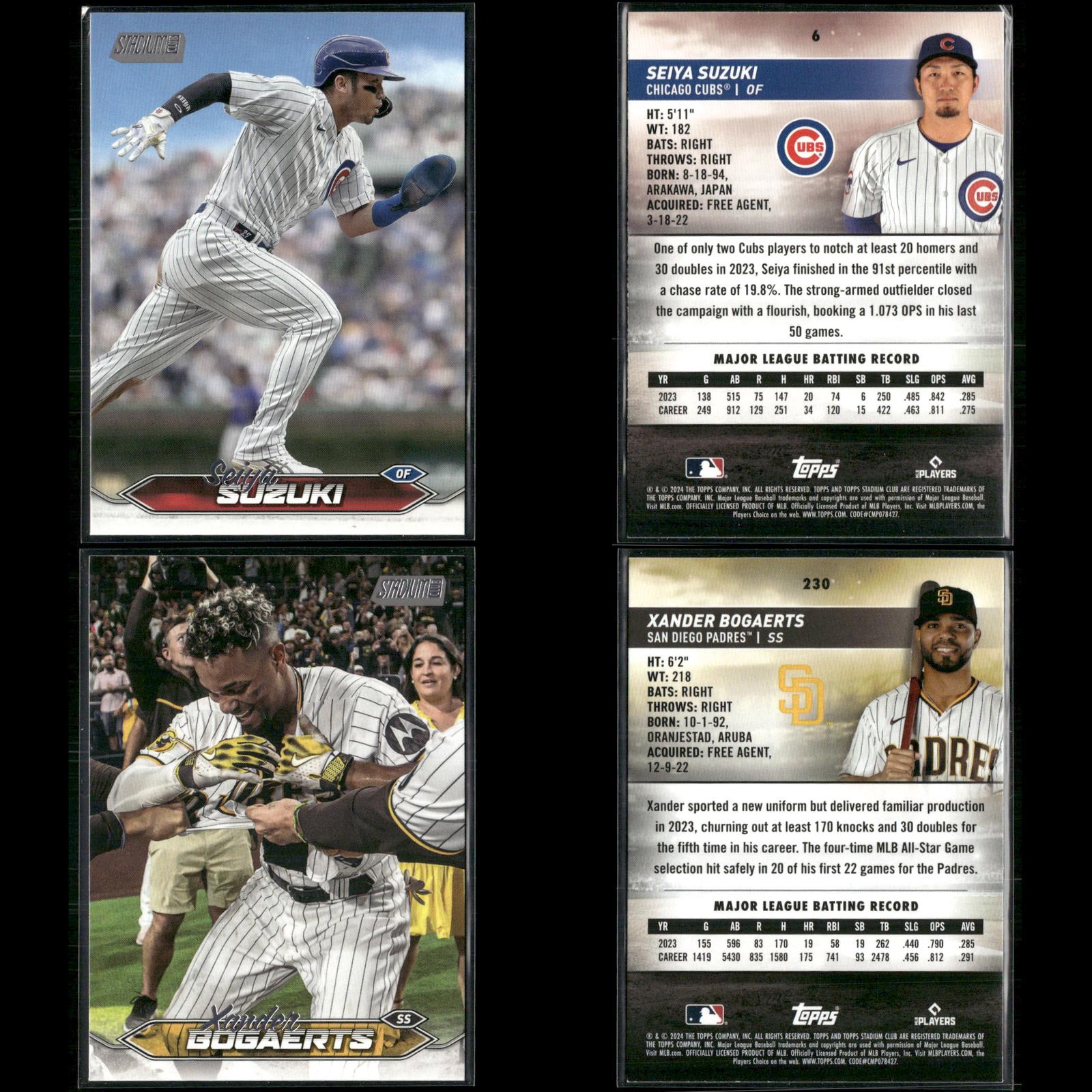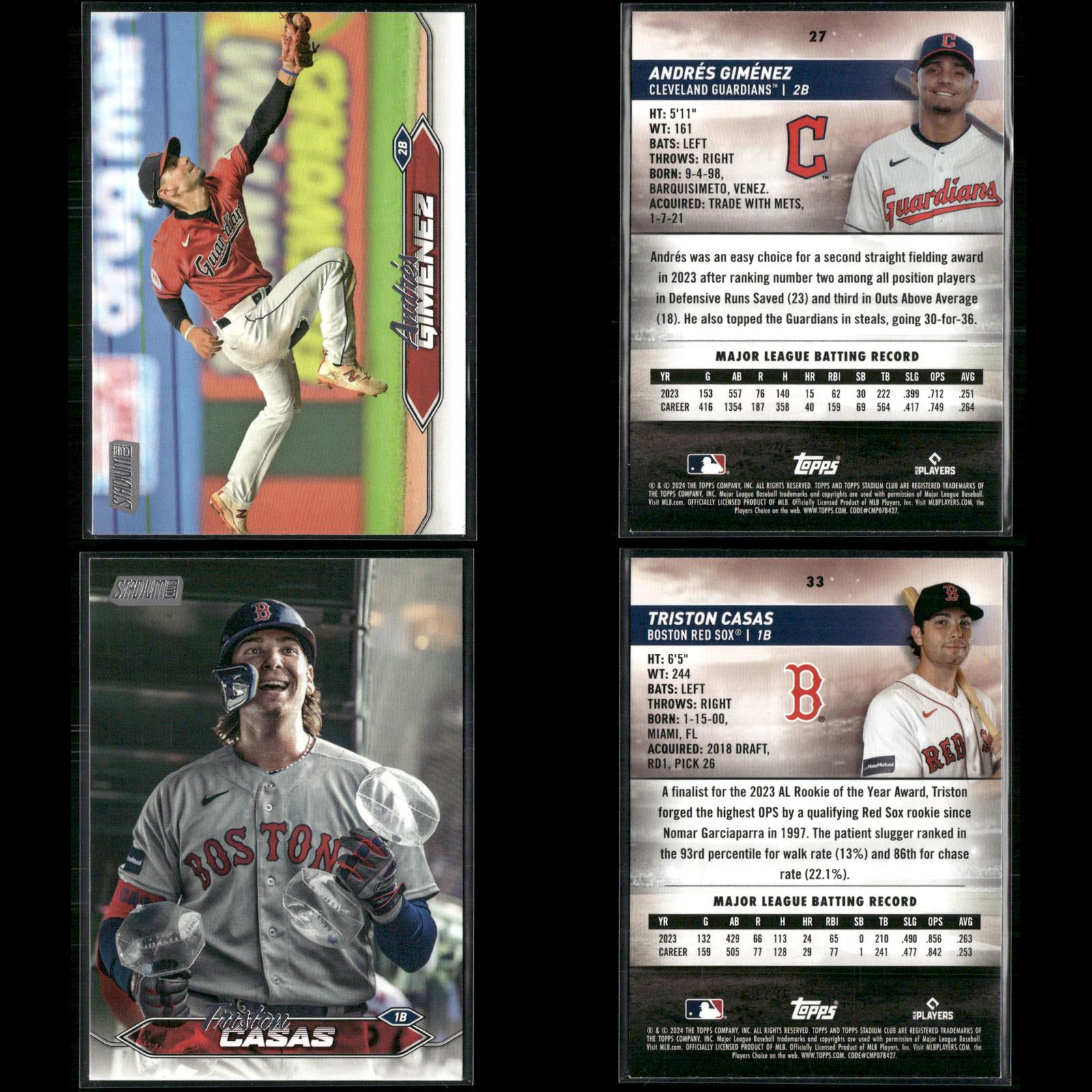 Willy Adames #115 2024 Stadium Club Milwaukee Brewers Tanner Bibee #89 2024 Stadium Club Cleveland Guardians Spencer Steer #76 2024 Stadium Club Cincinnati Reds Jarren Duran #9 2024 Stadium Club Boston Red Sox Félix Bautista #15 2024 Stadium Club Baltimore Orioles Riley Greene #153 2024 Stadium Club Detroit Tigers Willy Adames #115 2024 Stadium Club Milwaukee Brewers Gleyber Torres #161 2024 Stadium Club New York Yankees George Springer #282 2024 Stadium Club Toronto Blue Jays J.P. Crawford #289 2024 Stadium Club Seattle Mariners Bryson Stott #226 2024 Stadium Club Philadelphia Phillies Kerry Carpenter #141 2024 Stadium Club Detroit Tigers Freddy Peralta #140 2024 Stadium Club Milwaukee Brewers Bobby Miller #102 2024 Stadium Club Los Angeles Dodgers Seiya Suzuki #6 2024 Stadium Club Chicago Cubs Jesús Luzardo #134 2024 Stadium Club Miami Marlins Sonny Gray #298 2024 Stadium Club St. Louis Cardinals Nolan Jones #179 2024 Stadium Club Colorado Rockies Gabriel Moreno #99 2024 Stadium Club Arizona Diamondbacks Pablo López #154 2024 Stadium Club Minnesota Twins Zack Wheeler #214 2024 Stadium Club Philadelphia Phillies Nick Castellanos #219 2024 Stadium Club Philadelphia Phillies Andrés Giménez #27 2024 Stadium Club Cleveland Guardians Triston Casas #33 2024 Stadium Club Boston Red Sox Bo Naylor #38 2024 Stadium Club Cleveland Guardians Austin Riley #18 2024 Stadium Club Atlanta Braves José Berríos #210 2024 Stadium Club Toronto Blue Jays Ryan Mountcastle #97 2024 Stadium Club Baltimore Orioles Anthony Volpe #236 2024 Stadium Club New York Yankees Bryson Stott #226 2024 Stadium Club Philadelphia Phillies Seiya Suzuki #6 2024 Stadium Club Chicago Cubs Xander Bogaerts #230 2024 Stadium Club San Diego Padres J.T. Realmuto #279 2024 Stadium Club Philadelphia Phillies Triston Casas #33 2024 Stadium Club Boston Red Sox
