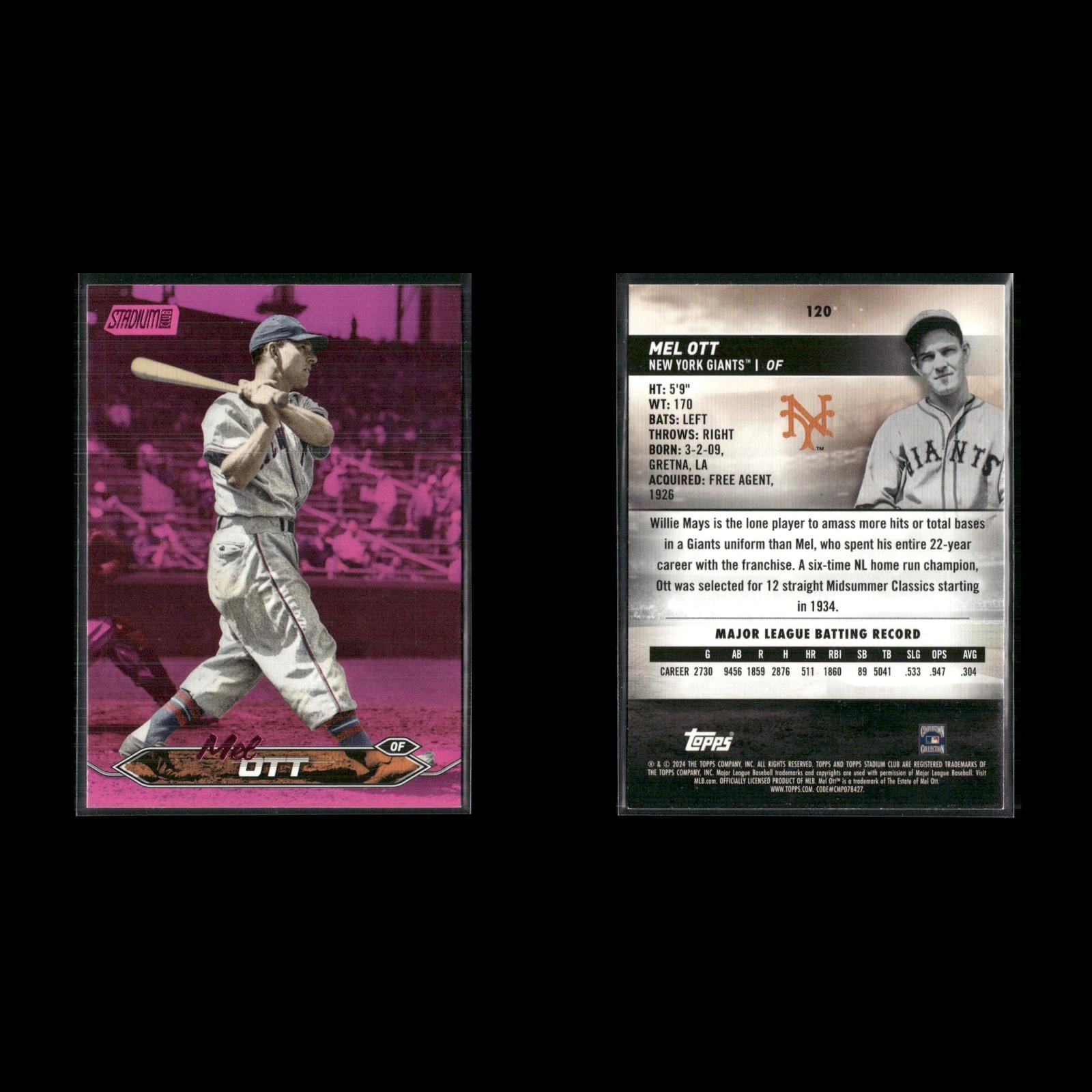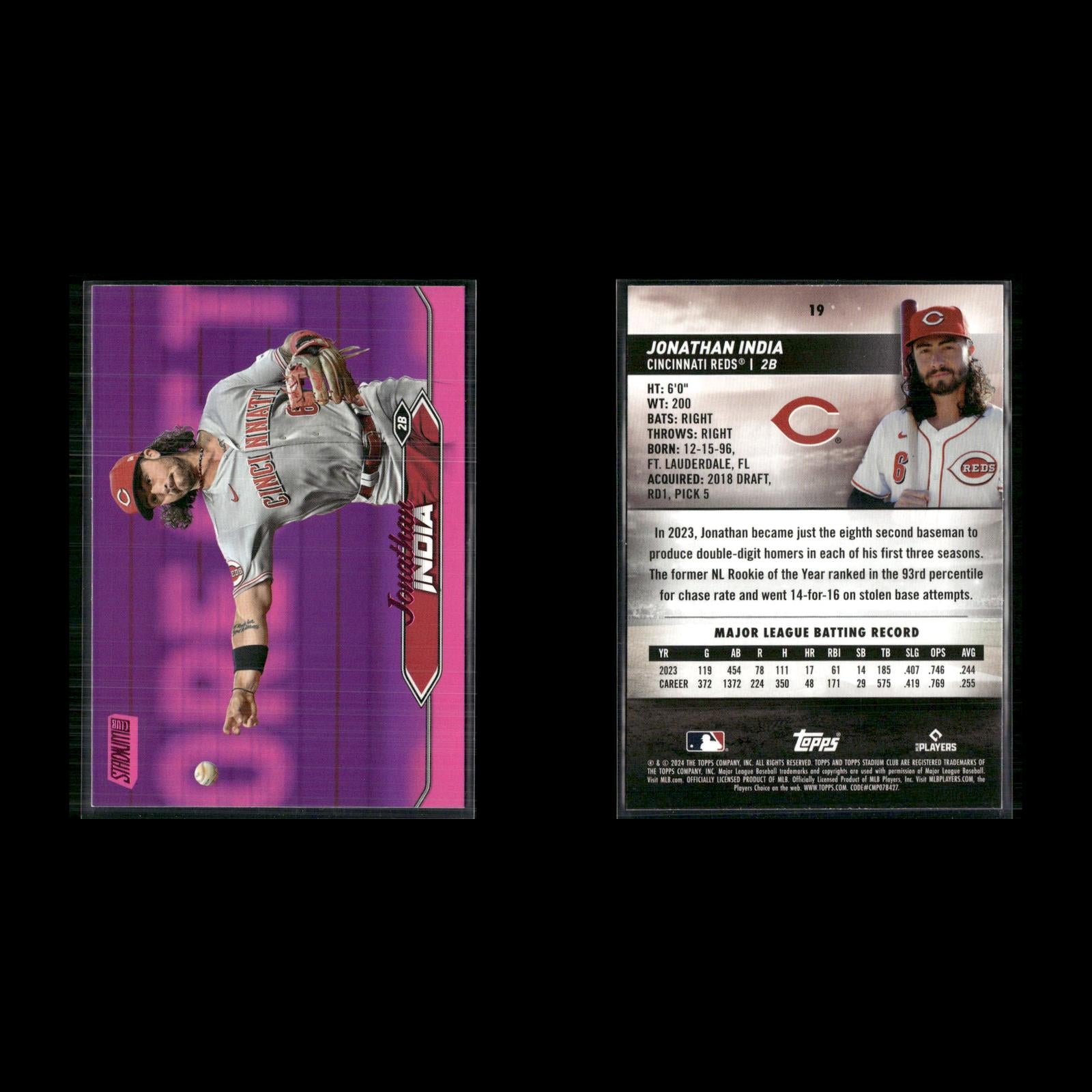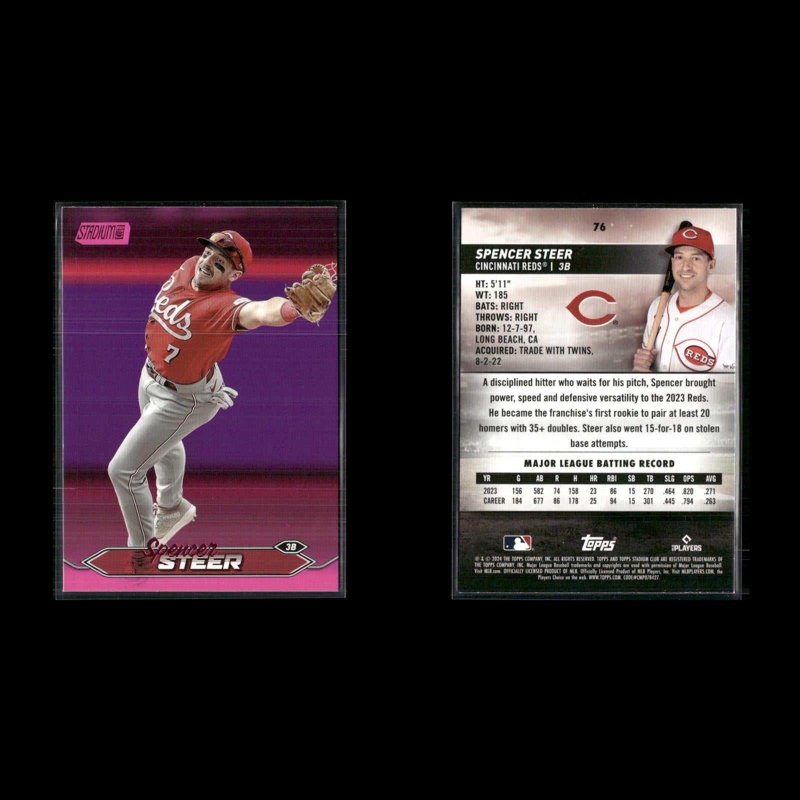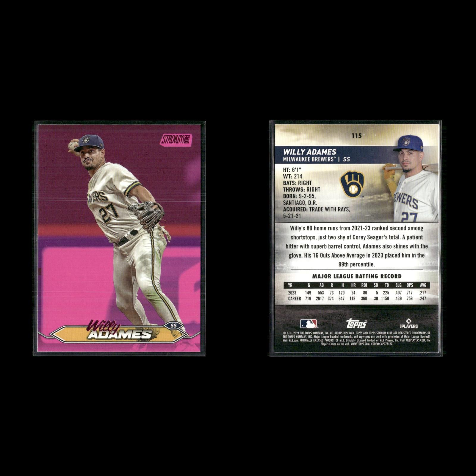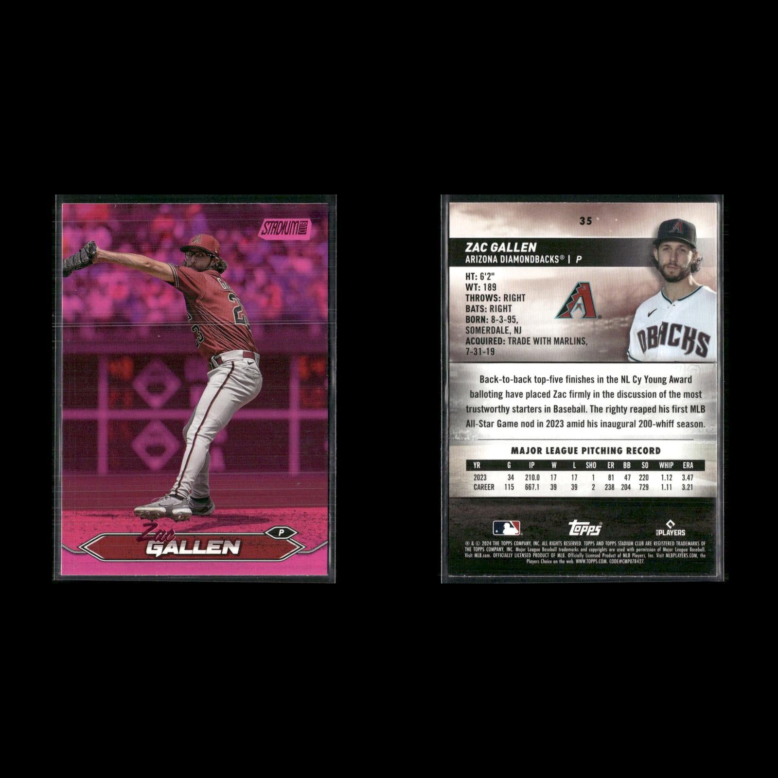 Endy Rodríguez #249 2024 Stadium Club Pink Foil Pittsburgh Pirates Henry Davis #207 2024 Stadium Club Pink Foil Pittsburgh Pirates Cole Ragans #199 2024 Stadium Club Pink Foil Kansas City Royals Christy Mathewson #169 2024 Stadium Club Pink Foil New York Giants Lane Thomas #152 2024 Stadium Club Pink Foil Washington Nationals Salvador Perez #149 2024 Stadium Club Pink Foil Kansas City Royals Mel Ott #120 2024 Stadium Club Pink Foil New York Giants Zac Gallen #35 2024 Stadium Club Pink Foil Arizona Diamondbacks Ketel Marte #24 2024 Stadium Club Pink Foil Arizona Diamondbacks Hunter Greene #92 2024 Stadium Club Pink Foil Cincinnati Reds Jonathan India #19 2024 Stadium Club Pink Foil Cincinnati Reds Spencer Steer #76 2024 Stadium Club Pink Foil Cincinnati Reds George Kirby #254 2024 Stadium Club Pink Foil Seattle Mariners Luis Castillo #268 2024 Stadium Club Pink Foil Seattle Mariners Gabriel Moreno #99 2024 Stadium Club Pink Foil Arizona Diamondbacks Willy Adames #115 2024 Stadium Club Pink Foil Milwaukee Brewers
