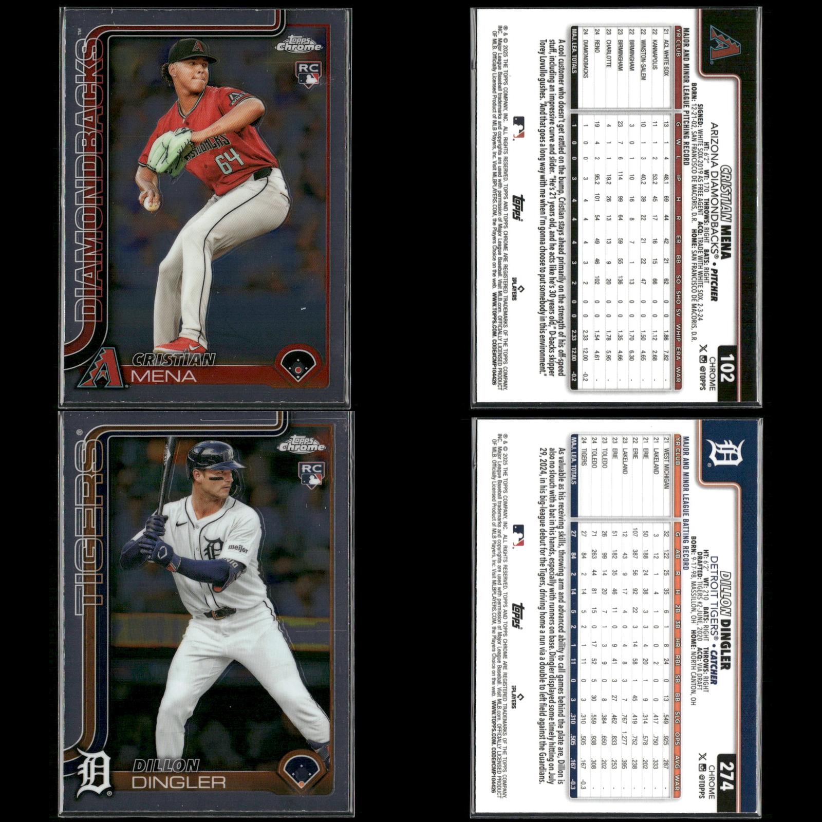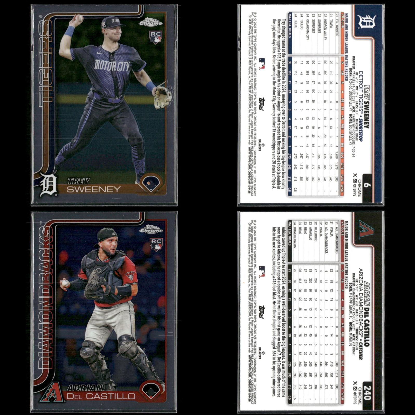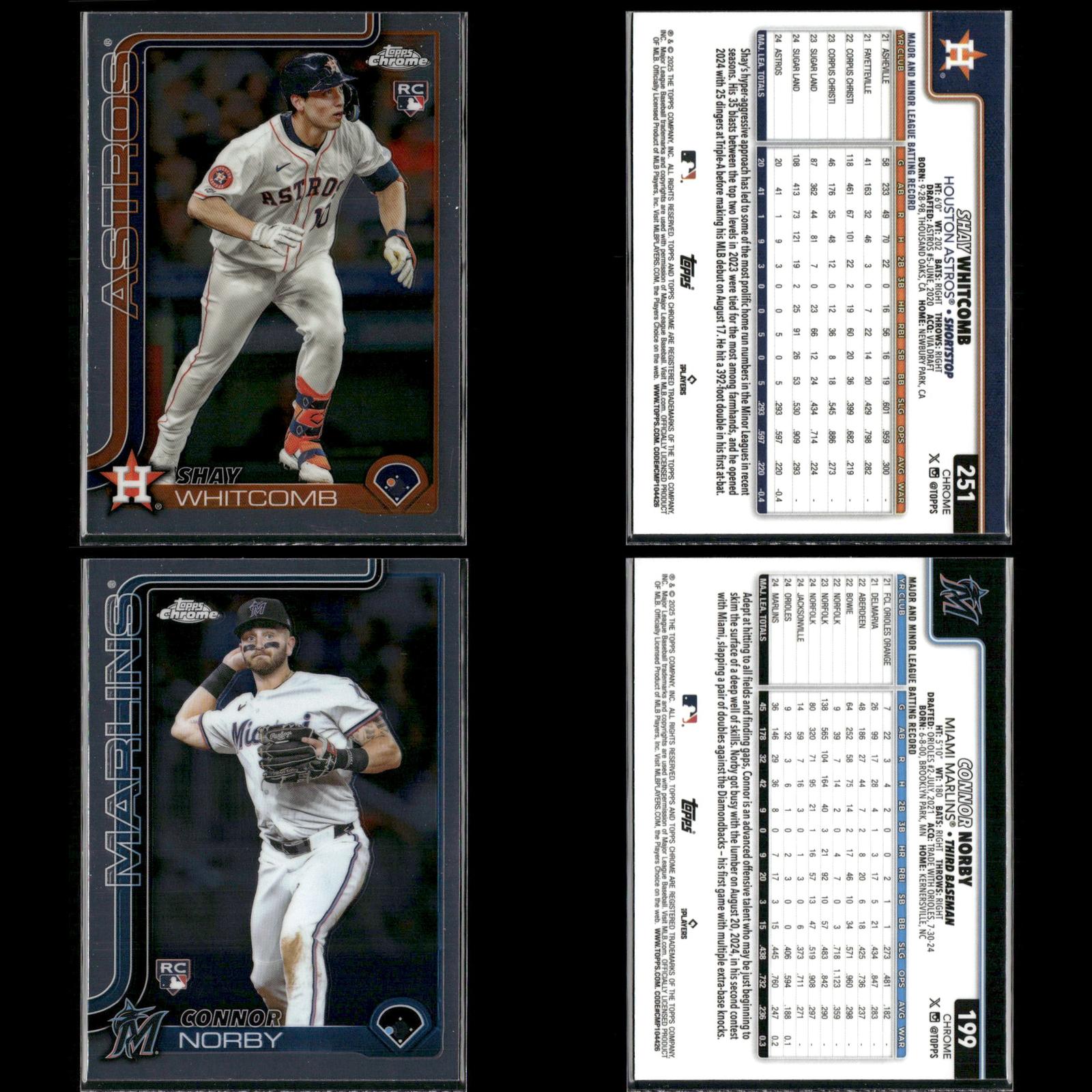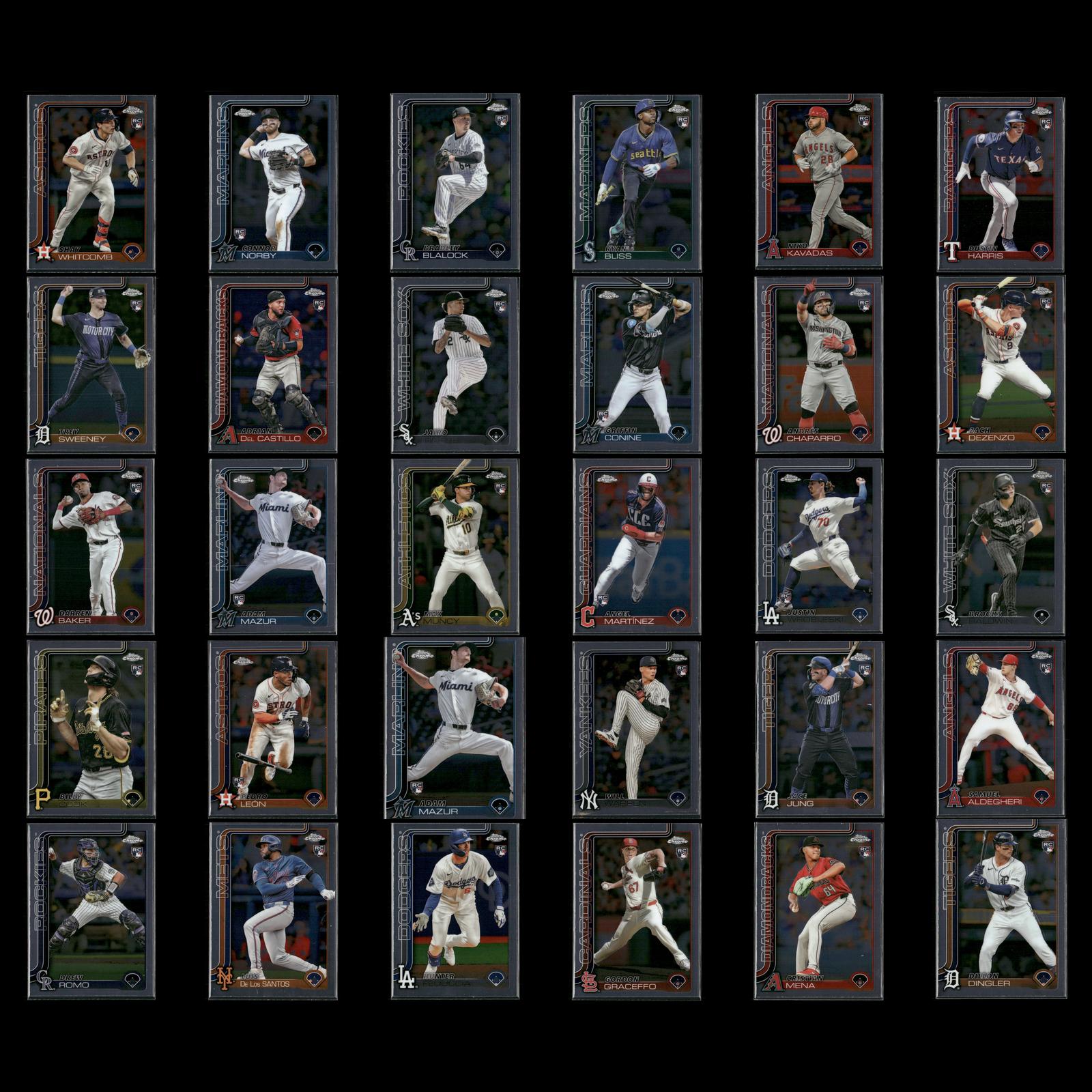 Shay Whitcomb Rookie #251 2025 Topps Chrome Houston Astros Connor Norby Rookie #199 2025 Topps Chrome Miami Marlins Bradley Blalock Rookie #289 2025 Topps Chrome Colorado Rockies Ryan Bliss Rookie #37 2025 Topps Chrome Seattle Mariners Niko Kavadas Rookie #20 2025 Topps Chrome Los Angeles Angels Dustin Harris Rookie #131 2025 Topps Chrome Texas Rangers Trey Sweeney Rookie #6 2025 Topps Chrome Detroit Tigers Adrian Del Castillo Rookie #240 2025 Topps Chrome Refractors Arizona Diamondbacks Jairo Iriarte Rookie #145 2025 Topps Chrome Chicago White Sox Griffin Conine Rookie #86 2025 Topps Chrome Miami Marlins Andrés Chaparro Rookie #187 2025 Topps Chrome Washington Nationals Zach Dezenzo Rookie #294 2025 Topps Chrome Houston Astros Darren Baker Rookie #231 2025 Topps Chrome Washington Nationals Adam Mazur Rookie #157 2025 Topps Chrome Miami Marlins Max Muncy Rookie #221 2025 Topps Chrome Athletics Angel Martínez Rookie #155 2025 Topps Chrome Cleveland Guardians Justin Wrobleski Rookie #38 2025 Topps Chrome Los Angeles Dodgers Brooks Baldwin Rookie #3 2025 Topps Chrome Chicago White Sox Billy Cook Rookie #273 2025 Topps Chrome Pittsburgh Pirates Pedro León Rookie #97 2025 Topps Chrome Houston Astros Adam Mazur Rookie #157 2025 Topps Chrome Miami Marlins Will Warren Rookie #81 2025 Topps Chrome New York Yankees Jace Jung Rookie #225 2025 Topps Chrome Detroit Tigers Samuel Aldegheri Rookie #59 2025 Topps Chrome Los Angeles Angels Drew Romo Rookie #124 2025 Topps Chrome Colorado Rockies Luis De Los Santos Rookie #74 2025 Topps Chrome New York Mets Hunter Feduccia Rookie #288 2025 Topps Chrome Los Angeles Dodgers Gordon Graceffo Rookie #256 2025 Topps Chrome St. Louis Cardinals Cristian Mena Rookie #102 2025 Topps Chrome Arizona Diamondbacks Dillon Dingler Rookie #274 2025 Topps Chrome Detroit Tigers