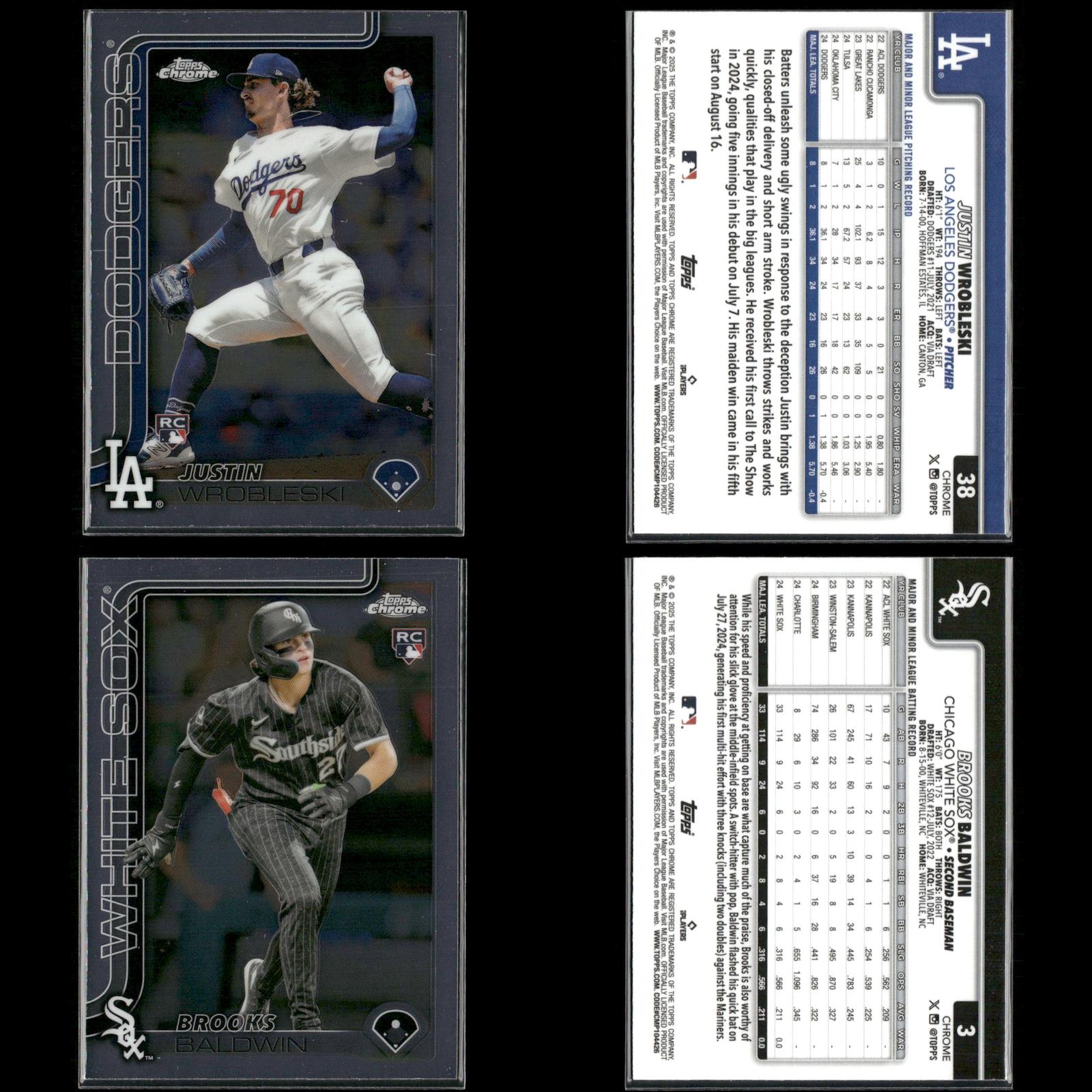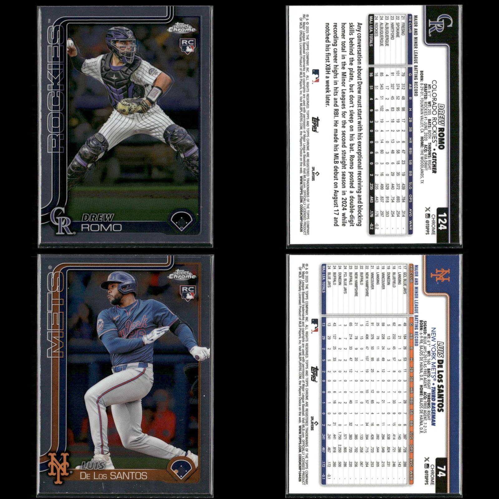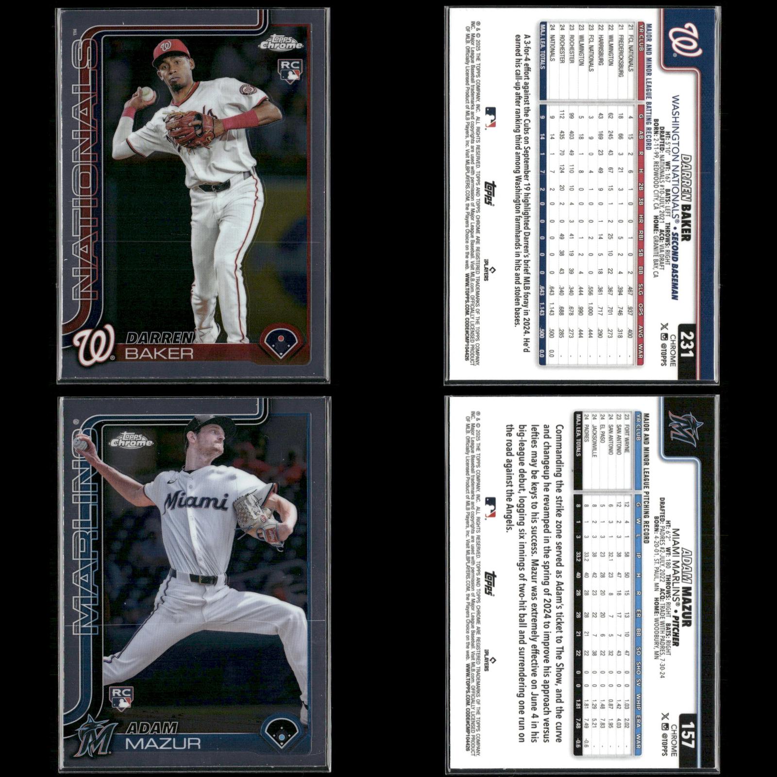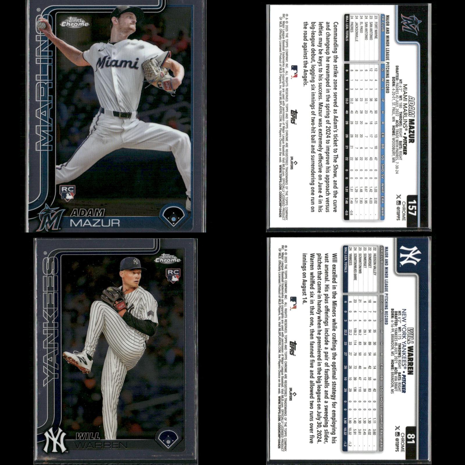 Shay Whitcomb Rookie #251 2025 Topps Chrome Houston Astros Connor Norby Rookie #199 2025 Topps Chrome Miami Marlins Bradley Blalock Rookie #289 2025 Topps Chrome Colorado Rockies Ryan Bliss Rookie #37 2025 Topps Chrome Seattle Mariners Niko Kavadas Rookie #20 2025 Topps Chrome Los Angeles Angels Dustin Harris Rookie #131 2025 Topps Chrome Texas Rangers Trey Sweeney Rookie #6 2025 Topps Chrome Detroit Tigers Adrian Del Castillo Rookie #240 2025 Topps Chrome Refractors Arizona Diamondbacks Jairo Iriarte Rookie #145 2025 Topps Chrome Chicago White Sox Griffin Conine Rookie #86 2025 Topps Chrome Miami Marlins Andrés Chaparro Rookie #187 2025 Topps Chrome Washington Nationals Zach Dezenzo Rookie #294 2025 Topps Chrome Houston Astros Darren Baker Rookie #231 2025 Topps Chrome Washington Nationals Adam Mazur Rookie #157 2025 Topps Chrome Miami Marlins Max Muncy Rookie #221 2025 Topps Chrome Athletics Angel Martínez Rookie #155 2025 Topps Chrome Cleveland Guardians Justin Wrobleski Rookie #38 2025 Topps Chrome Los Angeles Dodgers Brooks Baldwin Rookie #3 2025 Topps Chrome Chicago White Sox Billy Cook Rookie #273 2025 Topps Chrome Pittsburgh Pirates Pedro León Rookie #97 2025 Topps Chrome Houston Astros Adam Mazur Rookie #157 2025 Topps Chrome Miami Marlins Will Warren Rookie #81 2025 Topps Chrome New York Yankees Jace Jung Rookie #225 2025 Topps Chrome Detroit Tigers Samuel Aldegheri Rookie #59 2025 Topps Chrome Los Angeles Angels Drew Romo Rookie #124 2025 Topps Chrome Colorado Rockies Luis De Los Santos Rookie #74 2025 Topps Chrome New York Mets Hunter Feduccia Rookie #288 2025 Topps Chrome Los Angeles Dodgers Gordon Graceffo Rookie #256 2025 Topps Chrome St. Louis Cardinals Cristian Mena Rookie #102 2025 Topps Chrome Arizona Diamondbacks Dillon Dingler Rookie #274 2025 Topps Chrome Detroit Tigers