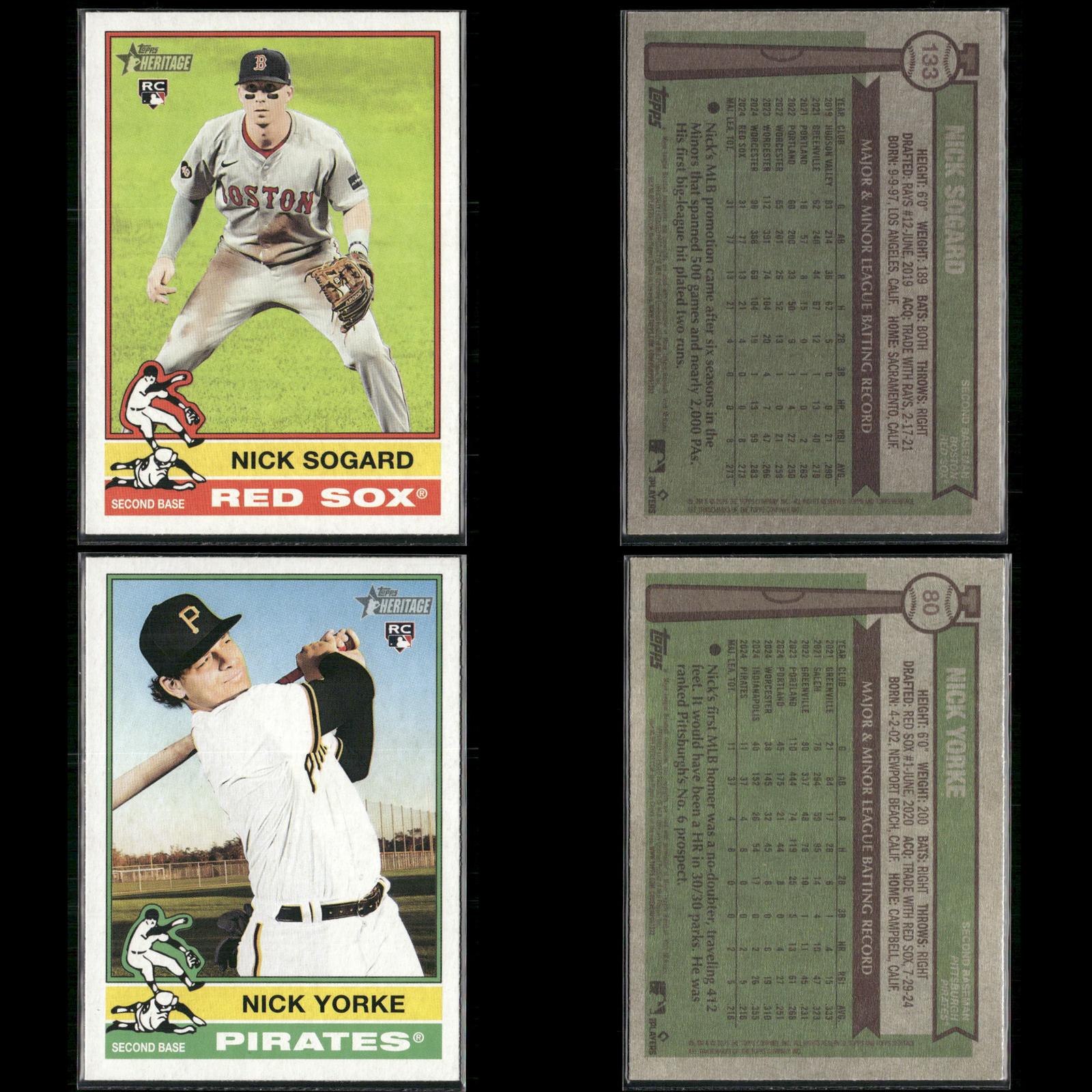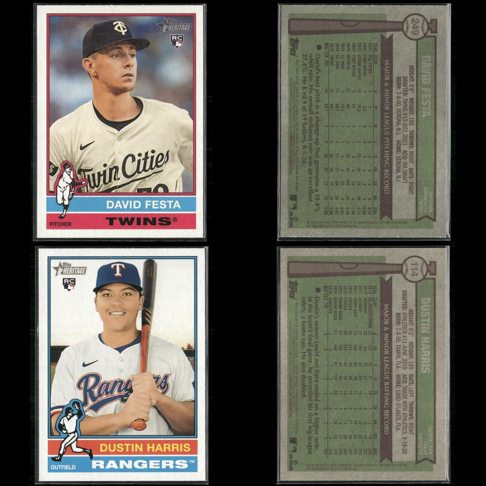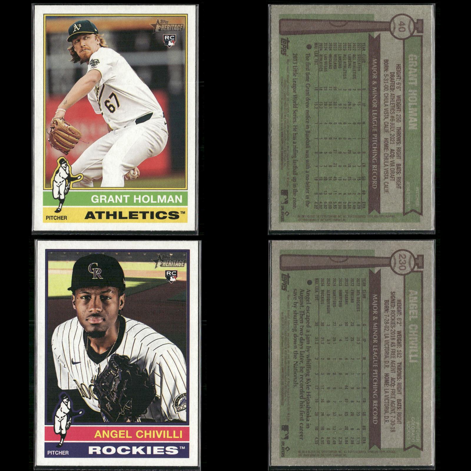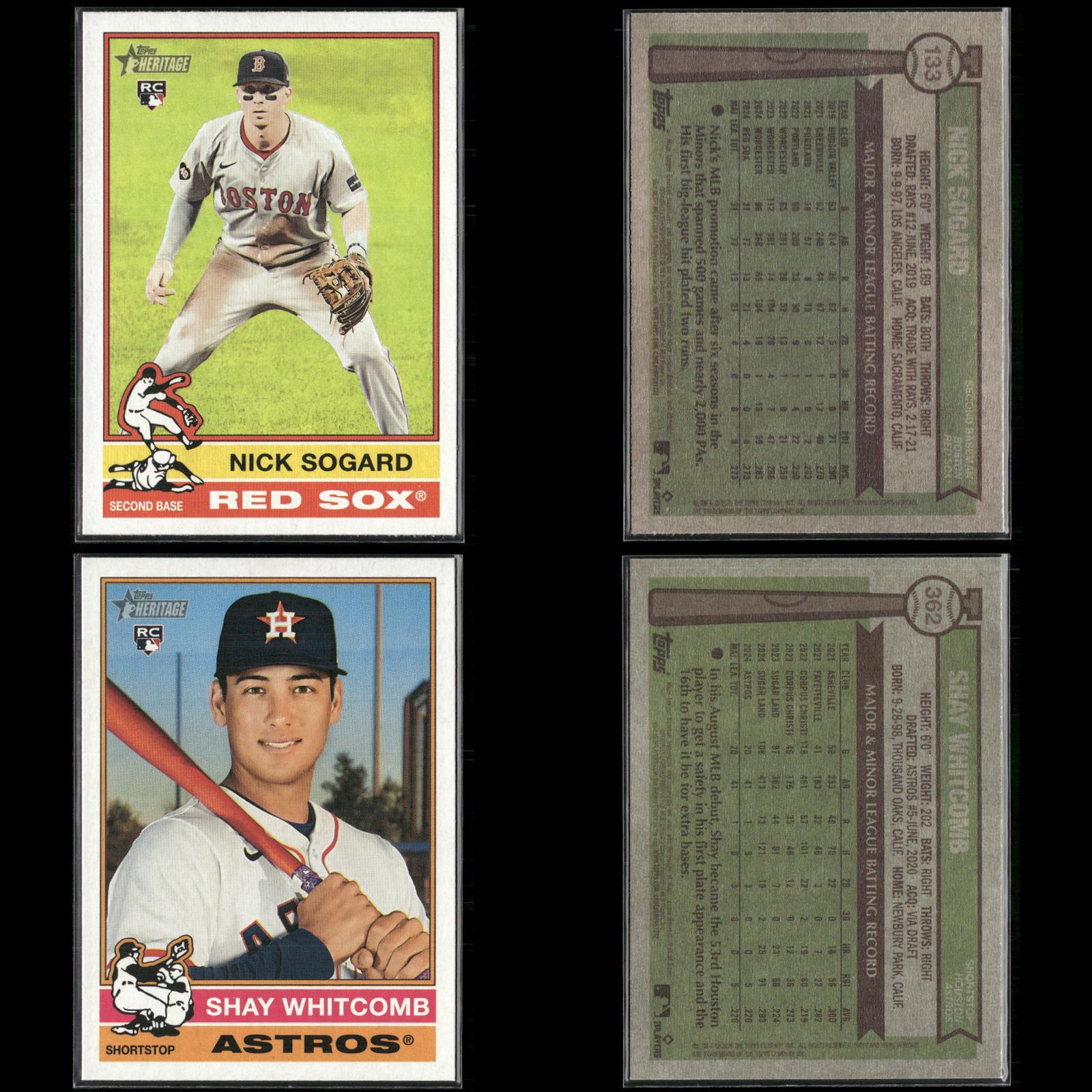 Nick Sogard Rookie #133 2025 Topps Heritage Boston Red Sox Levi Jordan Rookie #88 2025 Topps Heritage Cincinnati Reds Caden Dana Rookie #378 2025 Topps Heritage Los Angeles Angels Justin Wrobleski Rookie #319 2025 Topps Heritage Los Angeles Dodgers David Festa Rookie #249 2025 Topps Heritage Minnesota Twins Cade Povich Rookie #219 2025 Topps Heritage Baltimore Orioles Nick Sogard Rookie #133 2025 Topps Heritage Boston Red Sox Shay Whitcomb Rookie #362 2025 Topps Heritage Houston Astros Mike Burrows Rookie #328 2025 Topps Heritage Pittsburgh Pirates Darren Baker Rookie #301 2025 Topps Heritage Washington Nationals David Festa Rookie #249 2025 Topps Heritage Minnesota Twins Dustin Harris Rookie #114 2025 Topps Heritage Texas Rangers Dusty Baker / Darren Baker FS #70 2025 Topps Heritage Jhonkensy Noel Rookie #79 2025 Topps Heritage Cleveland Guardians Adrian Del Castillo Rookie #270 2025 Topps Heritage Arizona Diamondbacks DJ Herz Rookie #289 2025 Topps Heritage Washington Nationals Aaron Schunk Rookie #90 2025 Topps Heritage Colorado Rockies Justin Wrobleski Rookie #319 2025 Topps Heritage Los Angeles Dodgers Grant Holmes Rookie #22 2025 Topps Heritage Atlanta Braves Walter Pennington Rookie #101 2025 Topps Heritage Texas Rangers Lake Bachar Rookie #254 2025 Topps Heritage Miami Marlins Spencer Schwellenbach Rookie #58 2025 Topps Heritage Atlanta Braves Will Wagner Rookie #35 2025 Topps Heritage Toronto Blue Jays Connor Norby Rookie #136 2025 Topps Heritage Miami Marlins Dillon Dingler Rookie #130 2025 Topps Heritage Detroit Tigers Edgardo Henriquez Rookie #180 2025 Topps Heritage Los Angeles Dodgers Nick Sogard Rookie #133 2025 Topps Heritage Boston Red Sox Nick Yorke Rookie #80 2025 Topps Heritage Pittsburgh Pirates Niko Kavadas Rookie #320 2025 Topps Heritage Los Angeles Angels Jaden Hill Rookie #398 2025 Topps Heritage Colorado Rockies Grant Holman Rookie #40 2025 Topps Heritage Athletics Angel Chivilli Rookie #230 2025 Topps Heritage Colorado Rockies Jace Jung Rookie #71 2025 Topps Heritage Detroit Tigers Coby Mayo Rookie #340 2025 Topps Heritage Baltimore Orioles Duke Ellis Rookie #266 2025 Topps Heritage New York Yankees Pedro León Rookie #271 2025 Topps Heritage Houston Astros Bradley Blalock Rookie #351 2025 Topps Heritage Colorado Rockies Jacob Hurtubise #124 2025 Topps Heritage Cincinnati Reds Cristian Mena Rookie #134 2025 Topps Heritage Arizona Diamondbacks Joey Cantillo Rookie #104 2025 Topps Heritage Cleveland Guardians