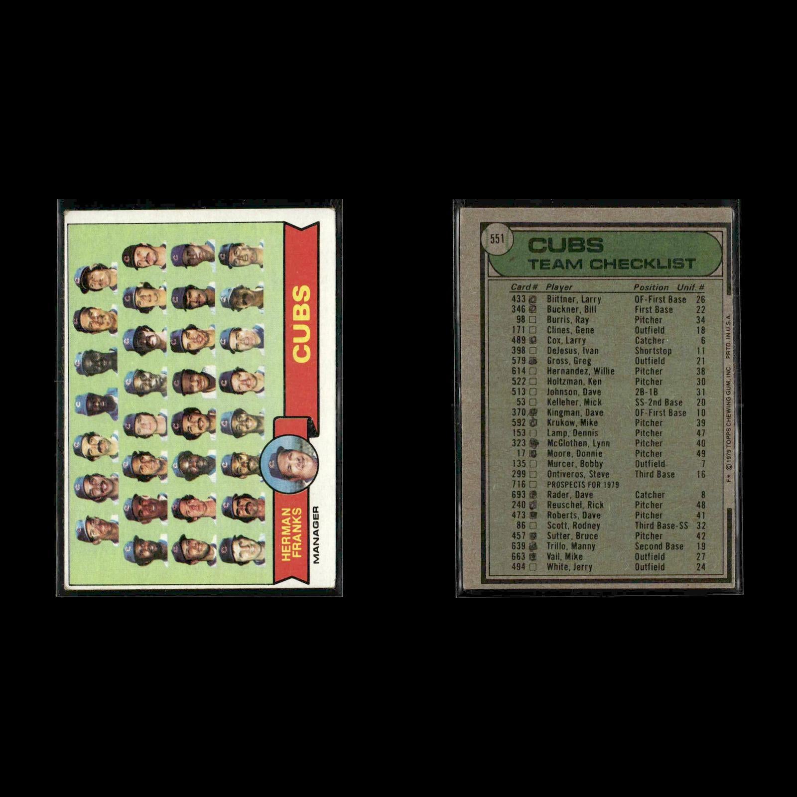 Chicago Cubs / Herman Franks TC, MGR, CL #551 1979 Topps Chicago Cubs Cubs 1979 Prospects (Dave Geisel / Karl Pagel / Scot Thompson) PROS, RC Rookie #716 1979 Topps Chicago Cubs Larry Biittner #433 1979 Topps Chicago Cubs Larry Biittner #433 1979 Topps Chicago Cubs Larry Biittner #433 1979 Topps Chicago Cubs Rodney Scott #86 1979 Topps Chicago Cubs Rodney Scott #86 1979 Topps Chicago Cubs Bill Buckner #346 1979 Topps Chicago Cubs Mike Krukow #592 1979 Topps Chicago Cubs Greg Gross #579 1979 Topps Chicago Cubs Greg Gross #579 1979 Topps Chicago Cubs Bobby Murcer #135 1979 Topps Chicago Cubs Dennis Lamp #153 1979 Topps Chicago Cubs Rick Reuschel #240 1979 Topps Chicago Cubs Rick Reuschel #240 1979 Topps Chicago Cubs Ivan DeJesus #398 1979 Topps Chicago Cubs Willie Hernandez #614 1979 Topps Chicago Cubs Dave Kingman #370 1979 Topps Chicago Cubs Steve Ontiveros #299 1979 Topps Chicago Cubs Steve Ontiveros #299 1979 Topps Chicago Cubs Larry Cox #489 1979 Topps Chicago Cubs Larry Cox #489 1979 Topps Chicago Cubs Dave Roberts #473 1979 Topps Chicago Cubs Ken Holtzman #522 1979 Topps Chicago Cubs Ken Holtzman #522 1979 Topps Chicago Cubs Dave Johnson #513 1979 Topps Chicago Cubs Cubs 1979 Prospects (Dave Geisel / Karl Pagel / Scot Thompson) PROS, RC Rookie #716 1979 Topps Chicago Cubs