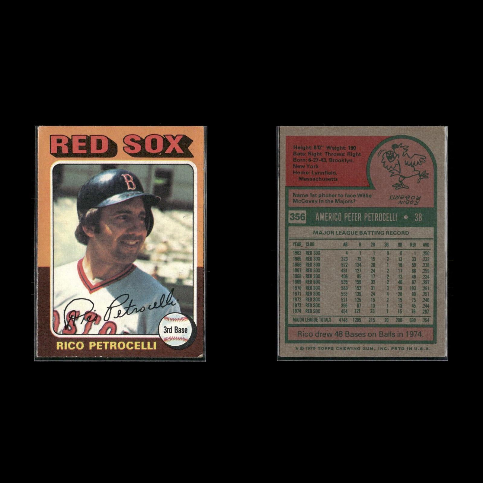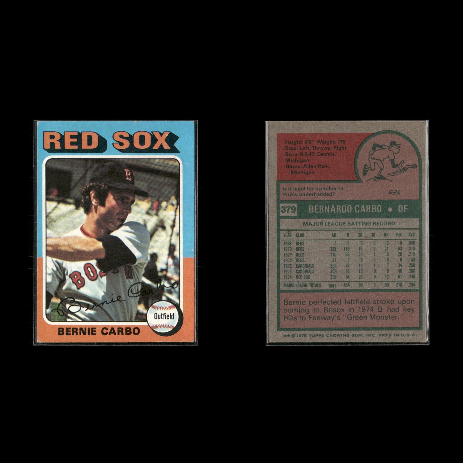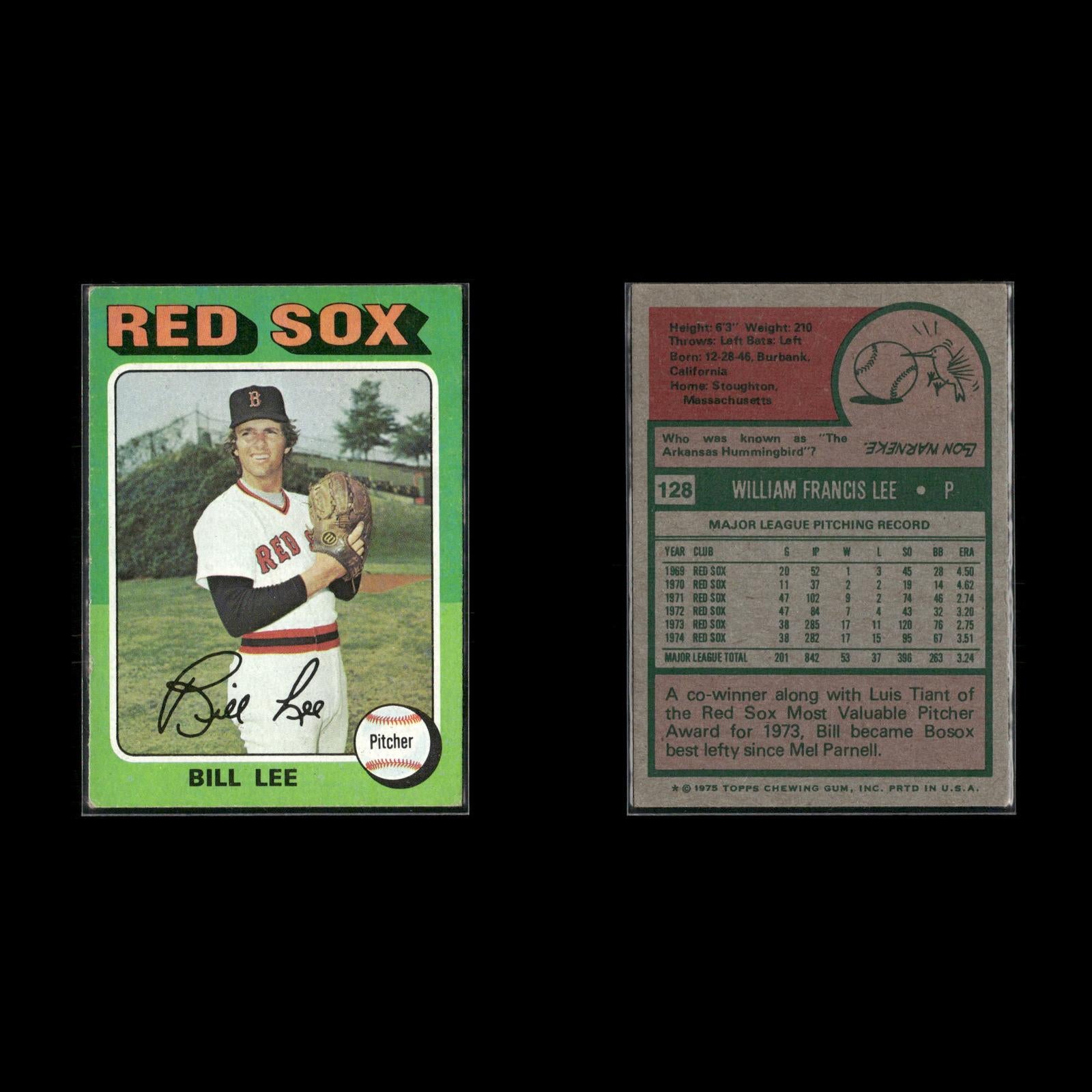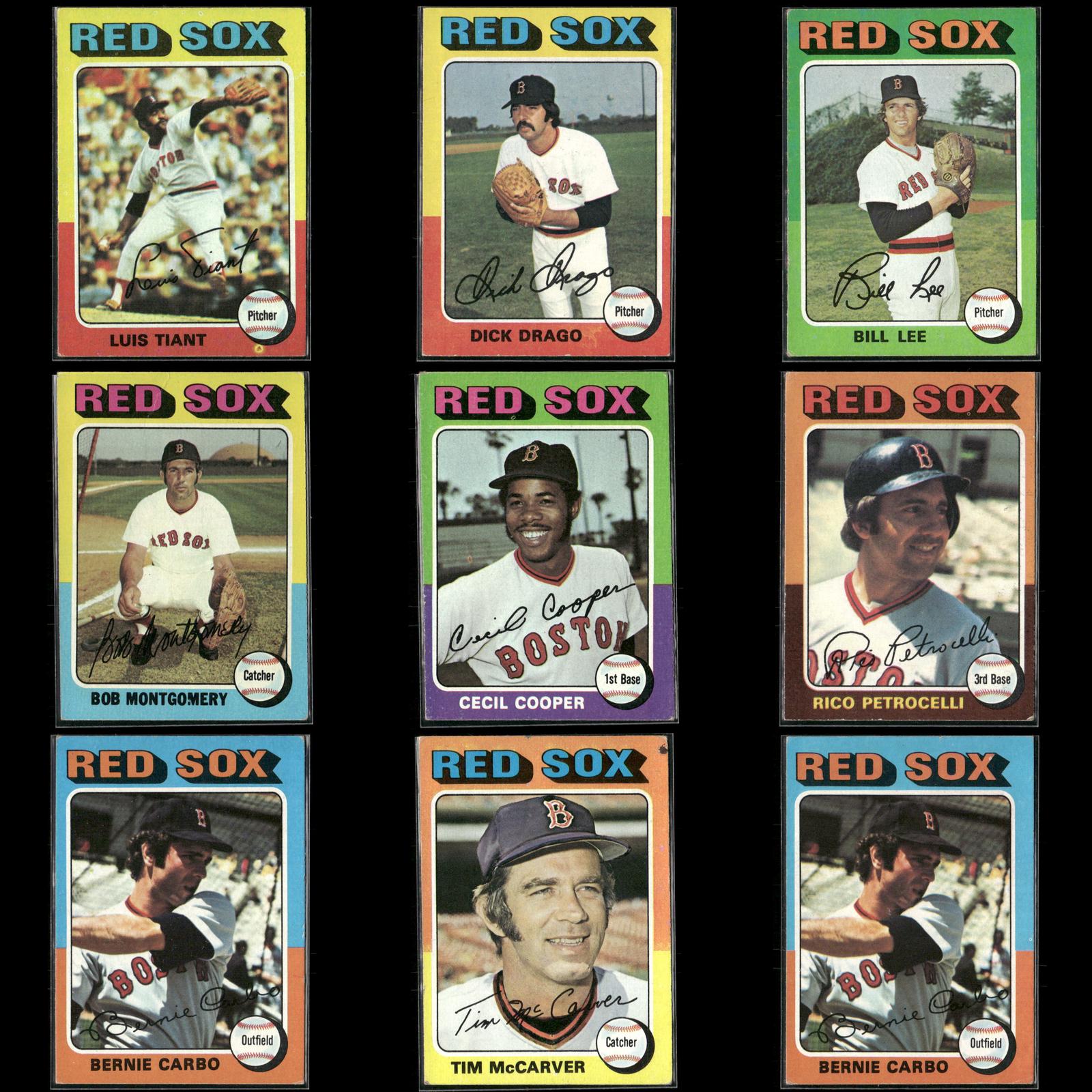 Luis Tiant #430 1975 Topps Boston Red Sox Dick Drago #333 1975 Topps Boston Red Sox Bill Lee #128 1975 Topps Boston Red Sox Bob Montgomery #559 1975 Topps Boston Red Sox Cecil Cooper #489 1975 Topps Boston Red Sox Rico Petrocelli #356 1975 Topps Boston Red Sox Bernie Carbo #379 1975 Topps Boston Red Sox Tim McCarver #586 1975 Topps Boston Red Sox Bernie Carbo #379 1975 Topps Boston Red Sox
