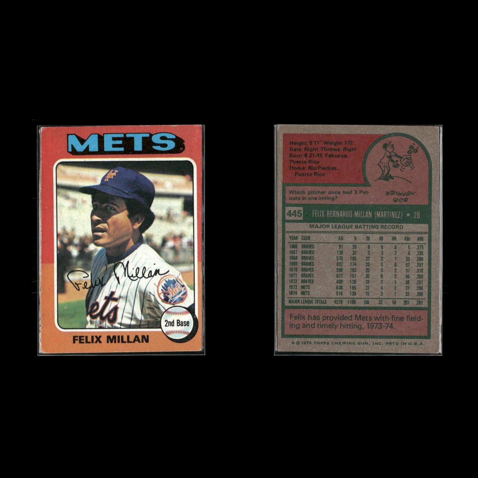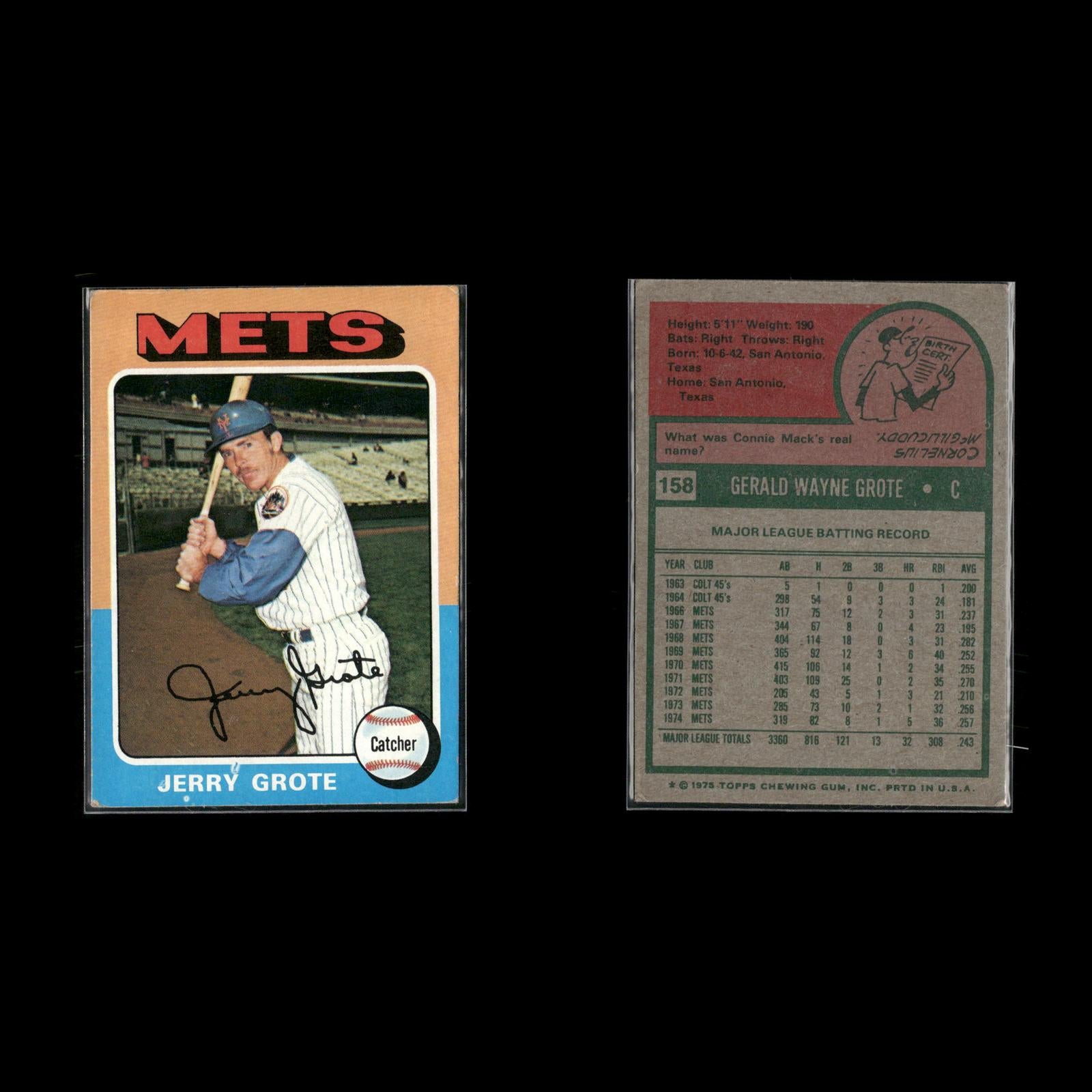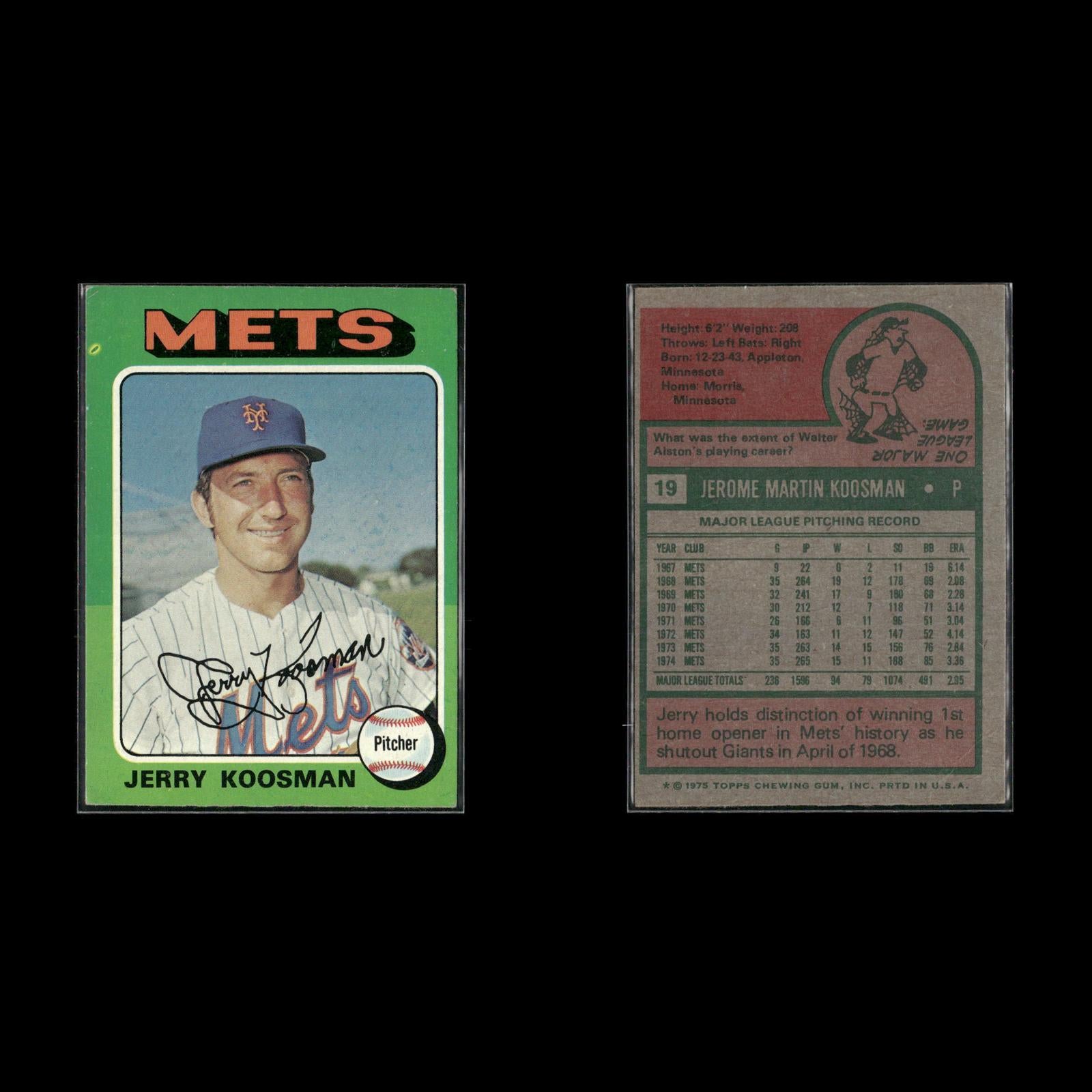 Don Hahn #182 1975 Topps New York Mets Felix Millan #445 1975 Topps New York Mets Jerry Grote #158 1975 Topps New York Mets Jerry Koosman #19 1975 Topps New York Mets