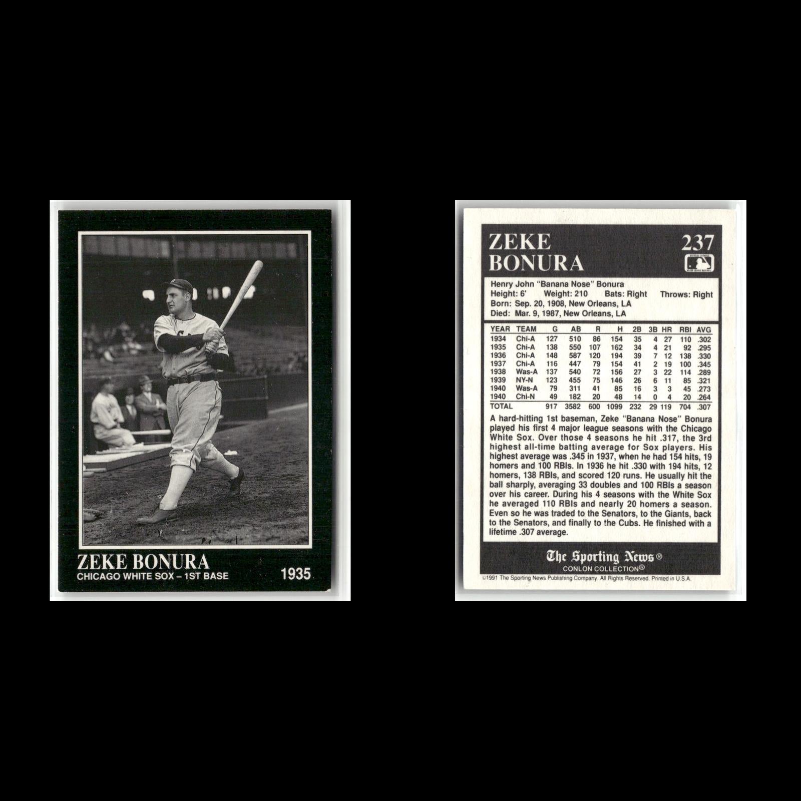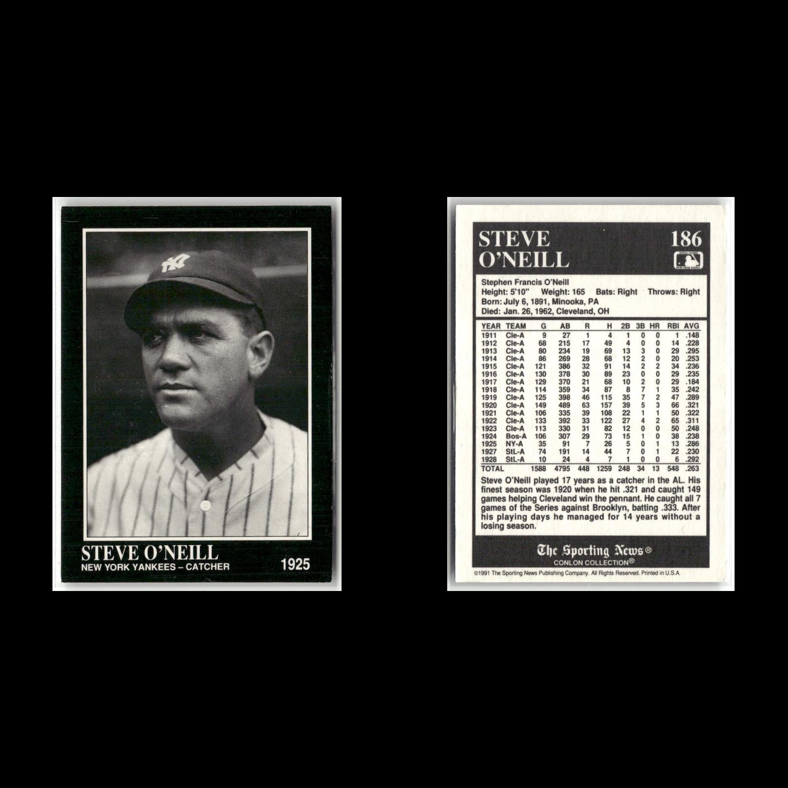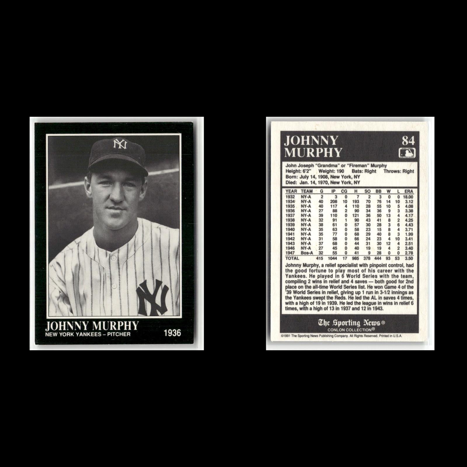 Christy Mathewson #1220 1994 Conlon Collection TSN Burgundy New York Giants Zeke Bonura #237 1991 Conlon Collection TSN Chicago White Sox Babe Herman #169 1991 Conlon Collection TSN Cincinnati Reds Pat Collins #118 1991 Conlon Collection TSN New York Yankees Miller Huggins #101 1991 Conlon Collection TSN New York Yankees Burt Shotton #152 1991 Conlon Collection TSN St. Louis Browns Steve O'Neill #186 1991 Conlon Collection TSN New York Yankees Harry Hooper #135 1991 Conlon Collection TSN Boston Red Sox Johnny Murphy #84 1991 Conlon Collection TSN New York Yankees