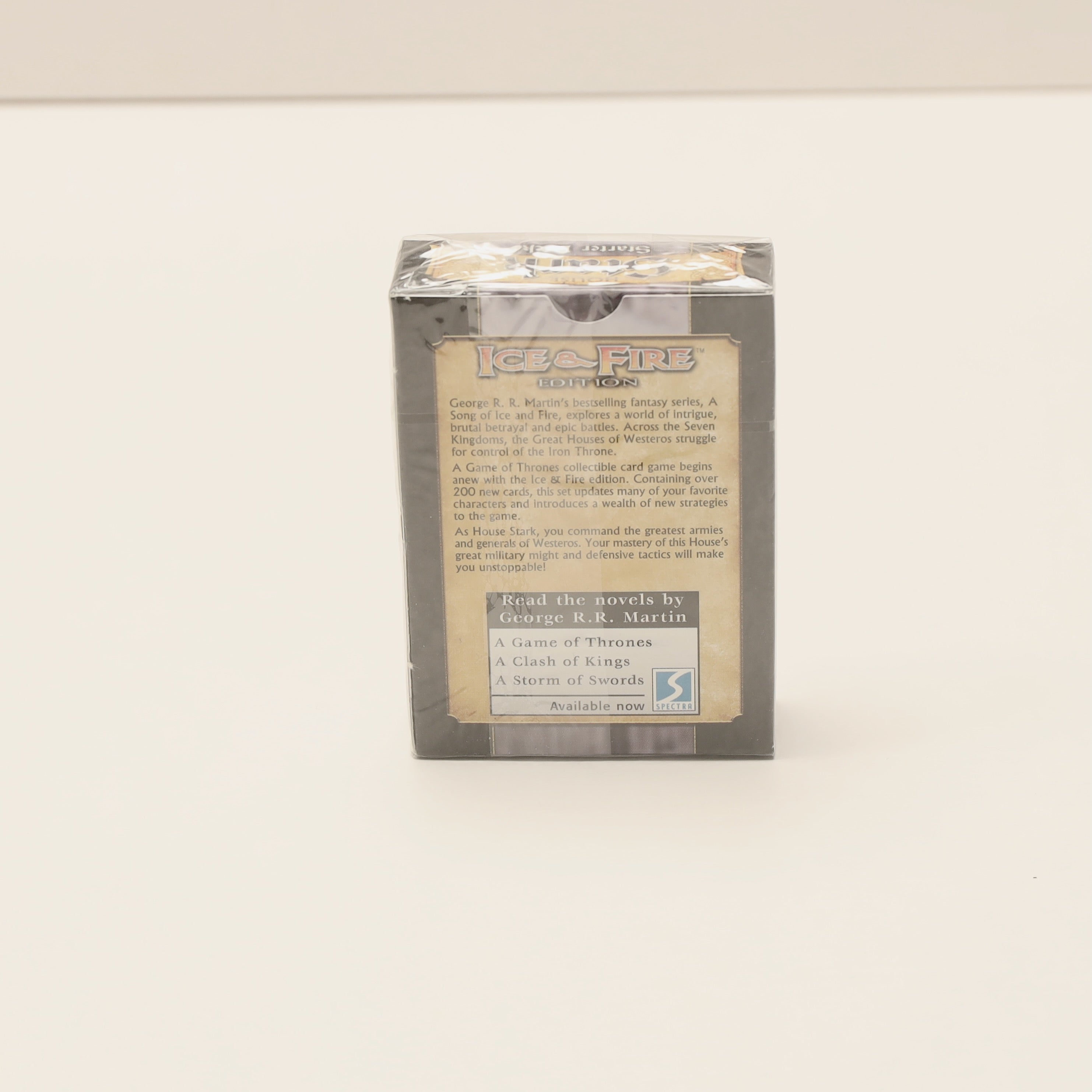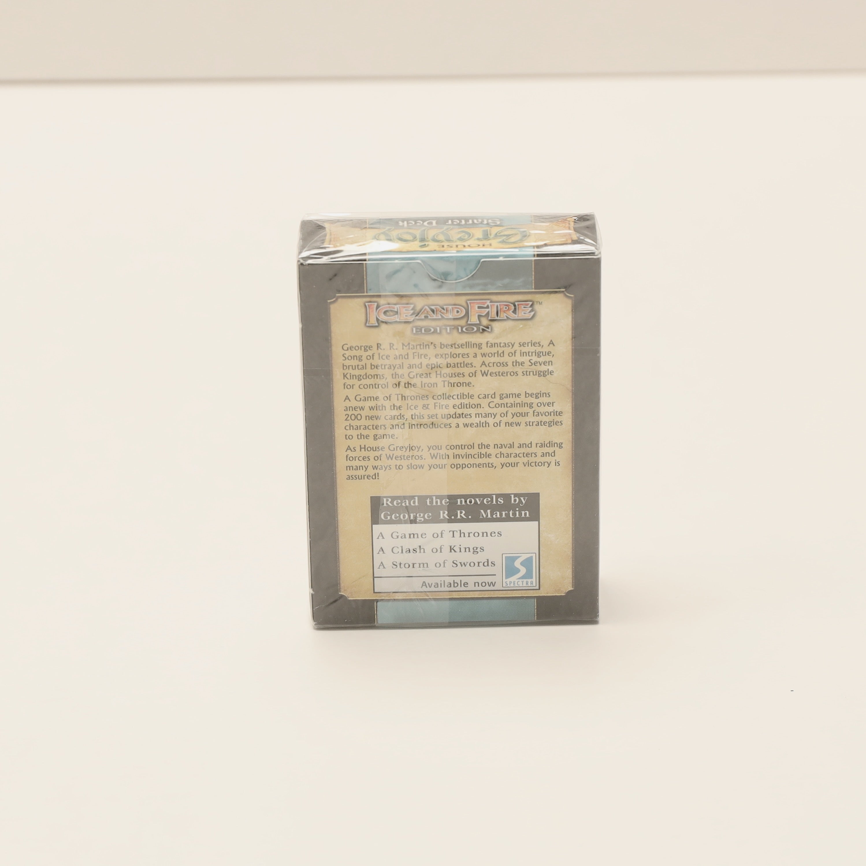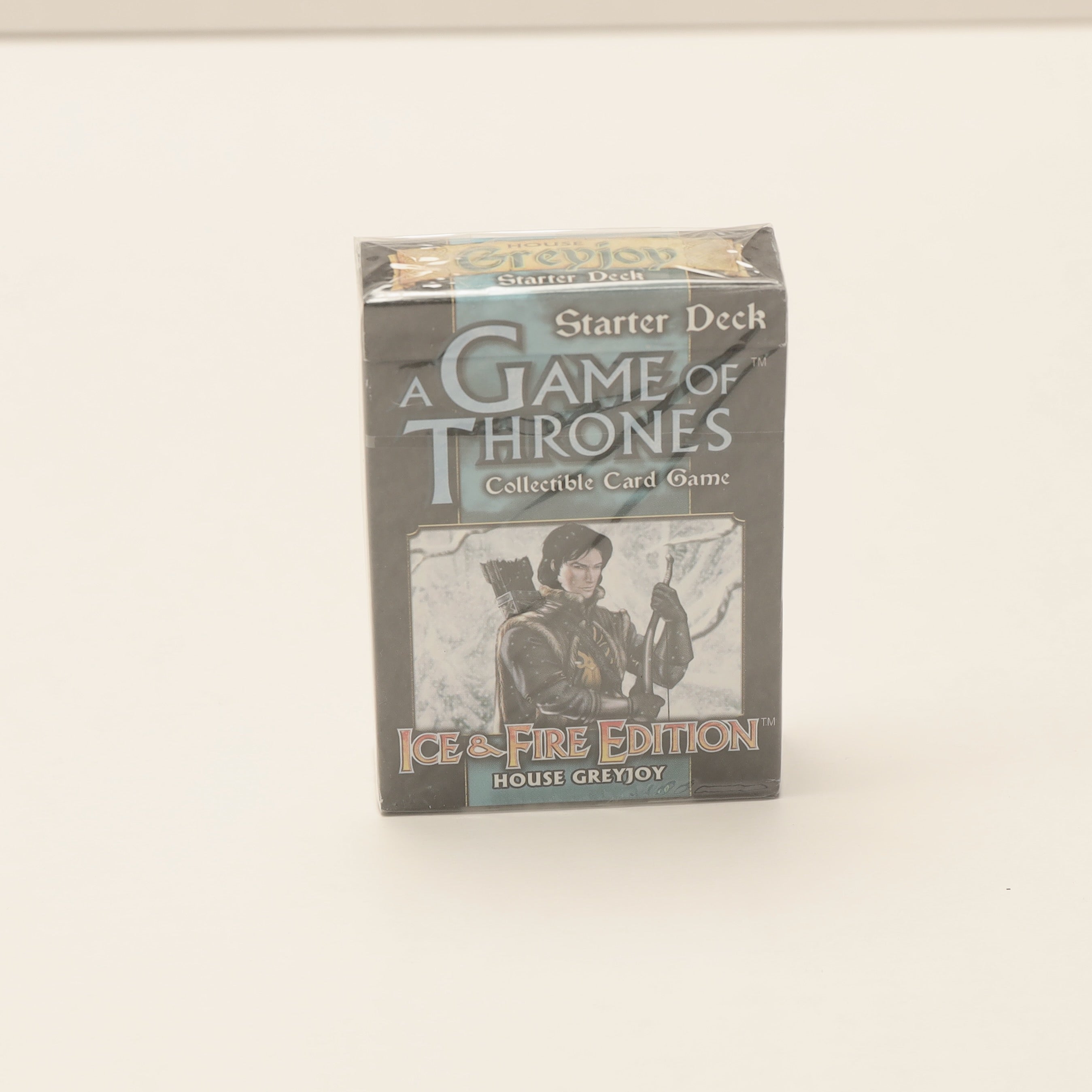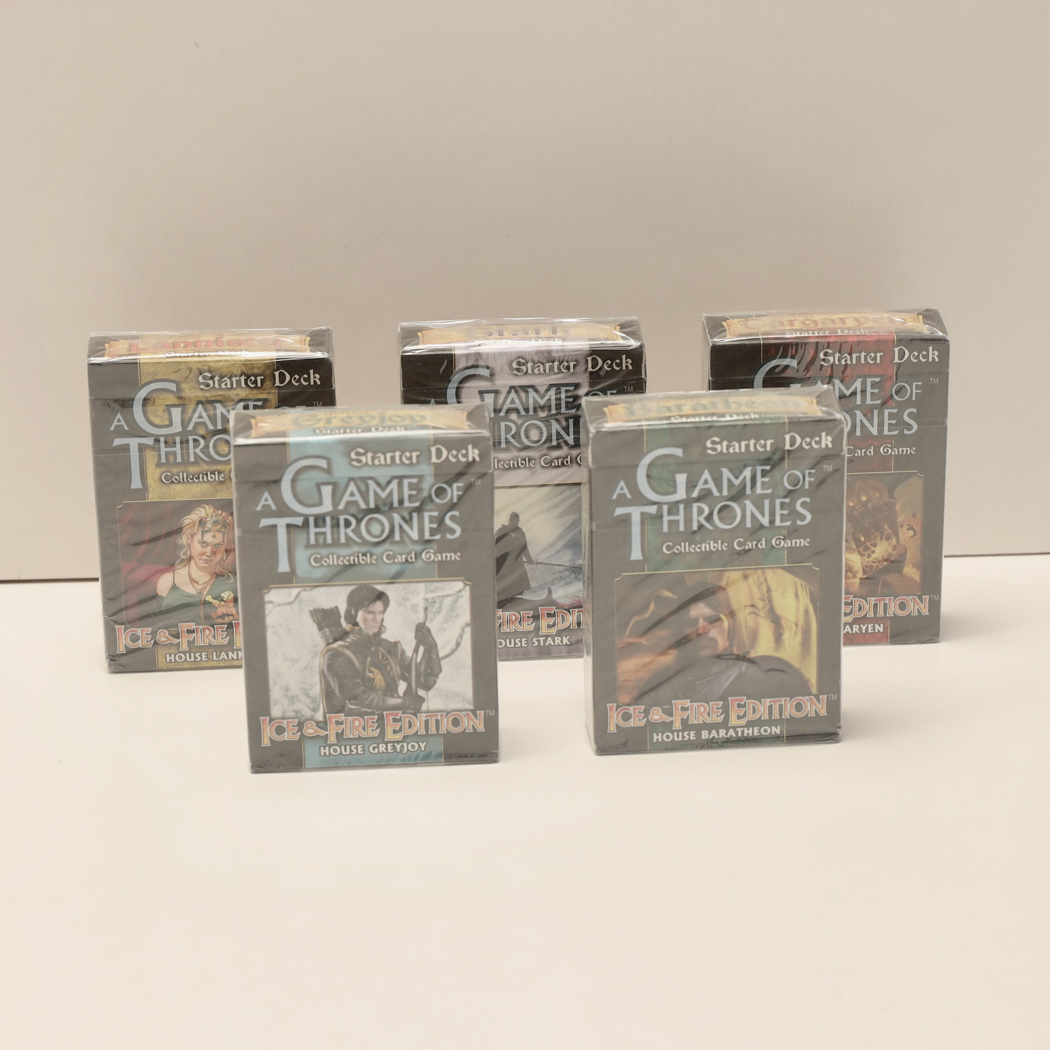 Complete set of five factory-sealed starter decks from the Ice & Fire Edition of the A Game of Thrones Collectible Card Game by Fantasy Flight Games. Each deck represents one of the iconic Great Houses of Westeros, making this lot perfect for collectors, fans, or CCG players looking to dive into the game or complete their collection.