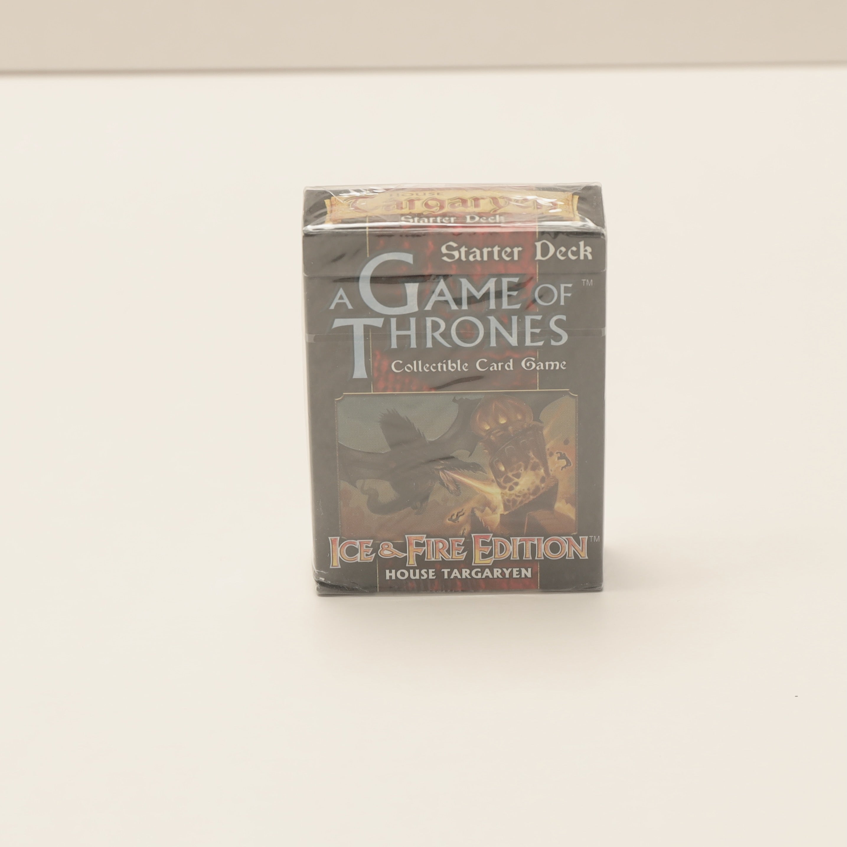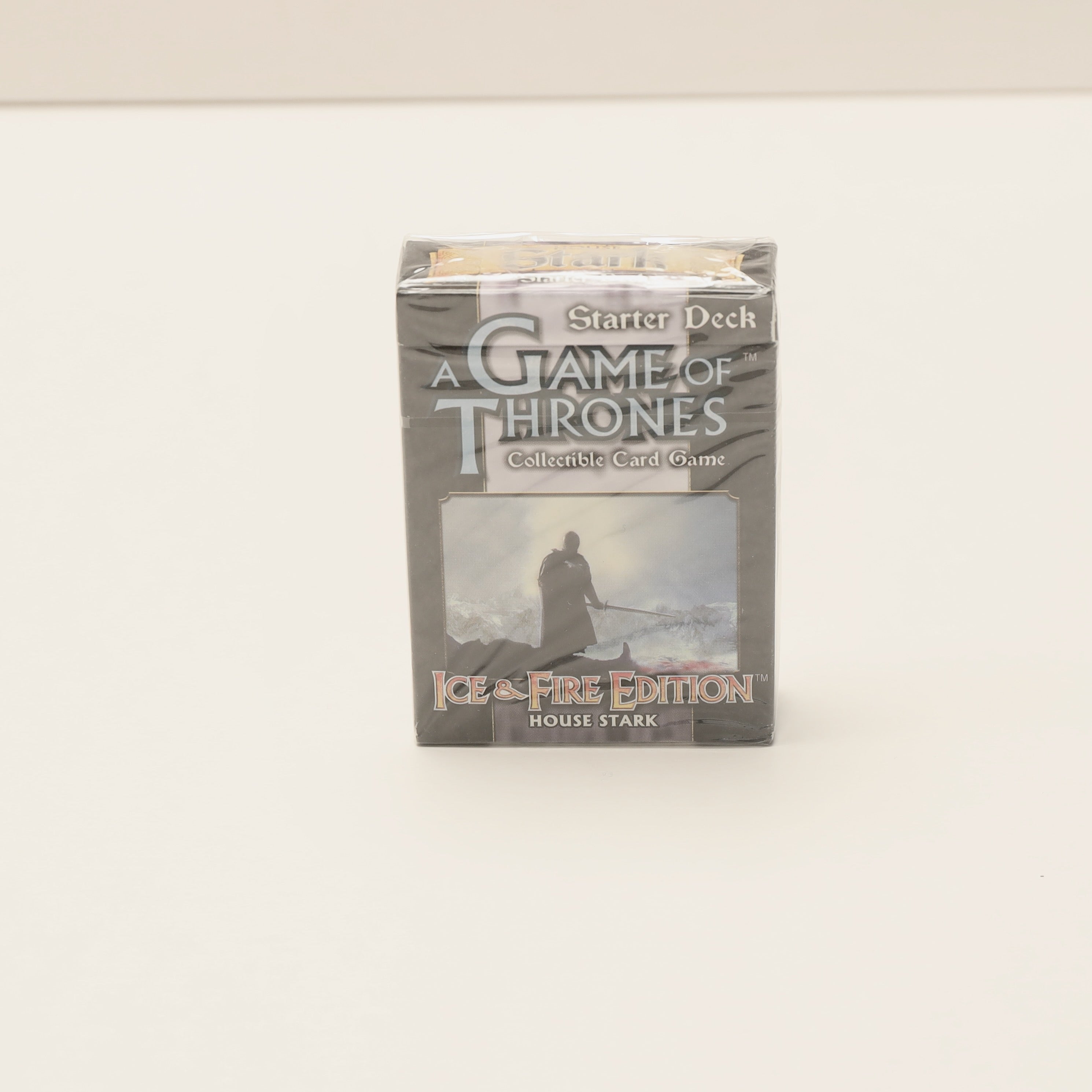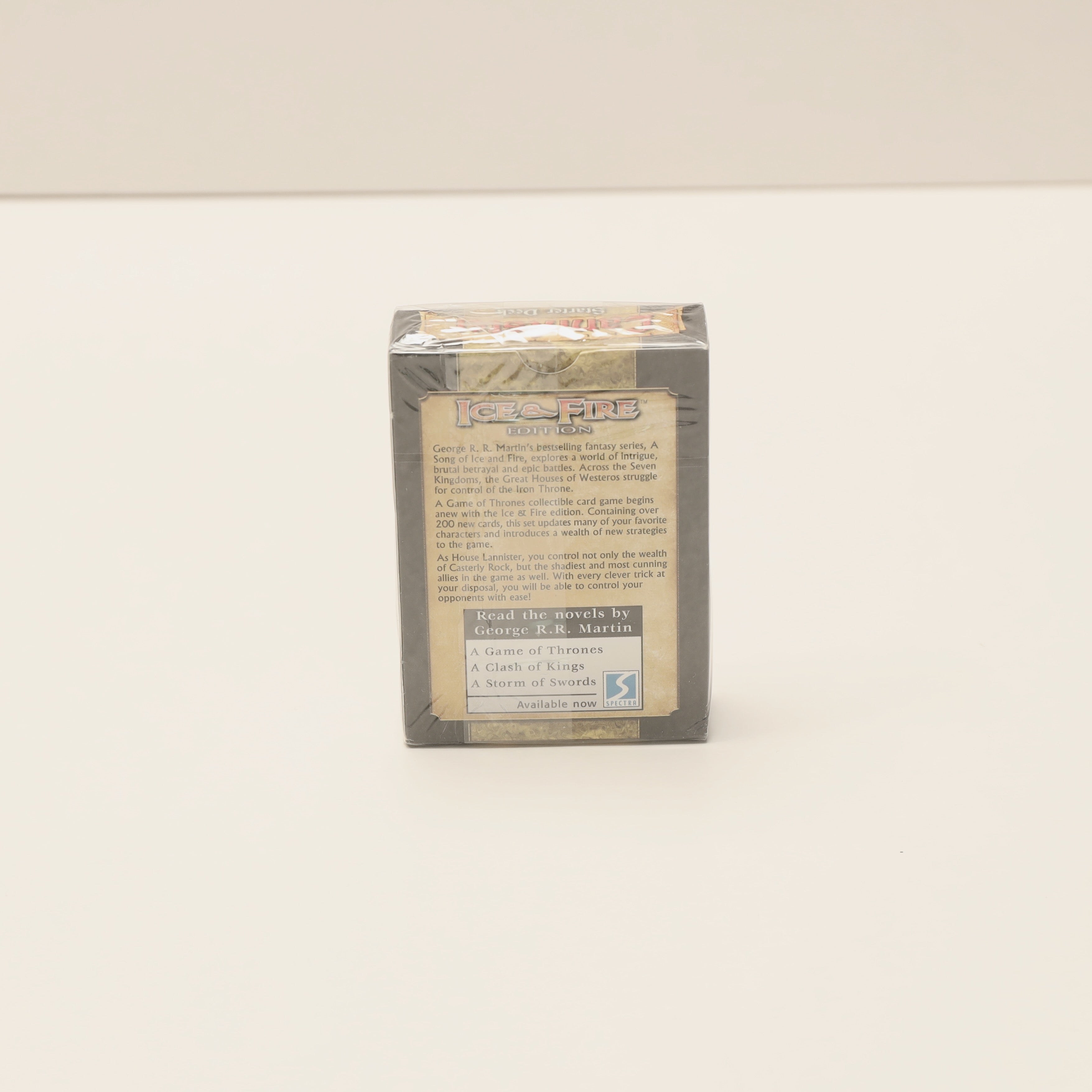 Complete set of five factory-sealed starter decks from the Ice & Fire Edition of the A Game of Thrones Collectible Card Game by Fantasy Flight Games. Each deck represents one of the iconic Great Houses of Westeros, making this lot perfect for collectors, fans, or CCG players looking to dive into the game or complete their collection.