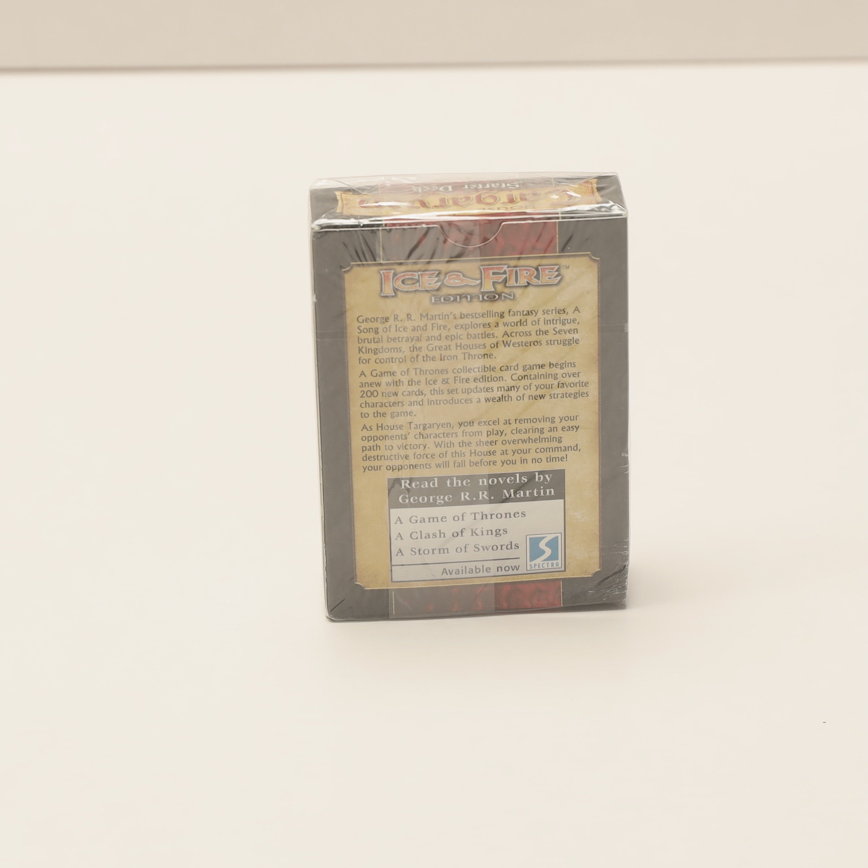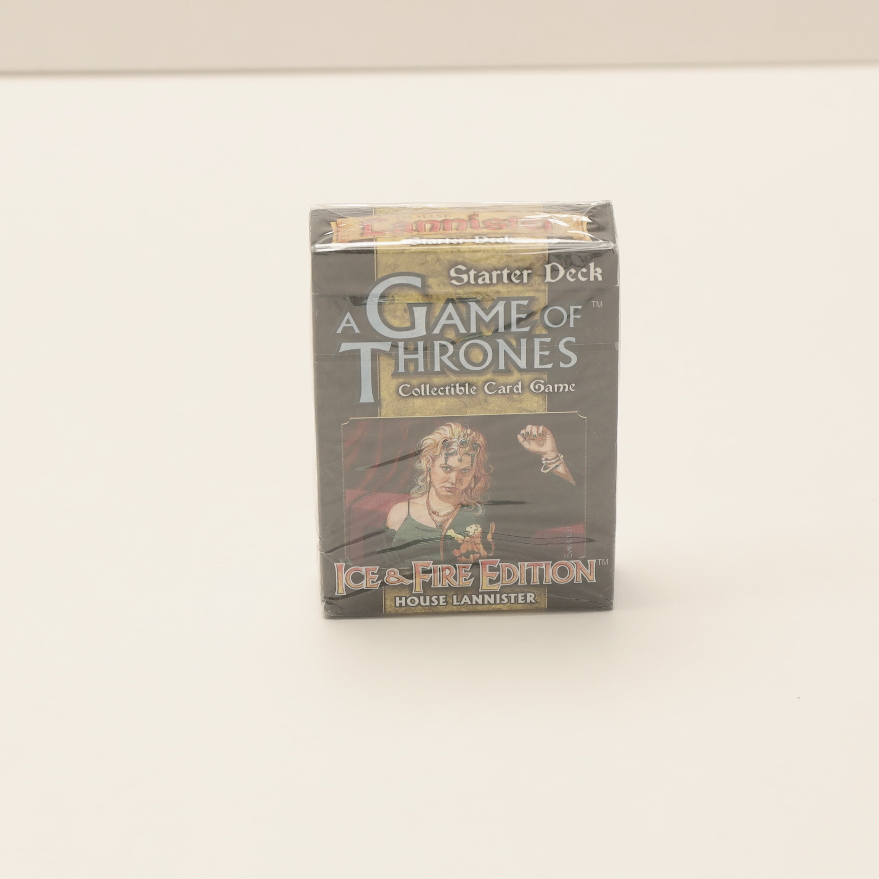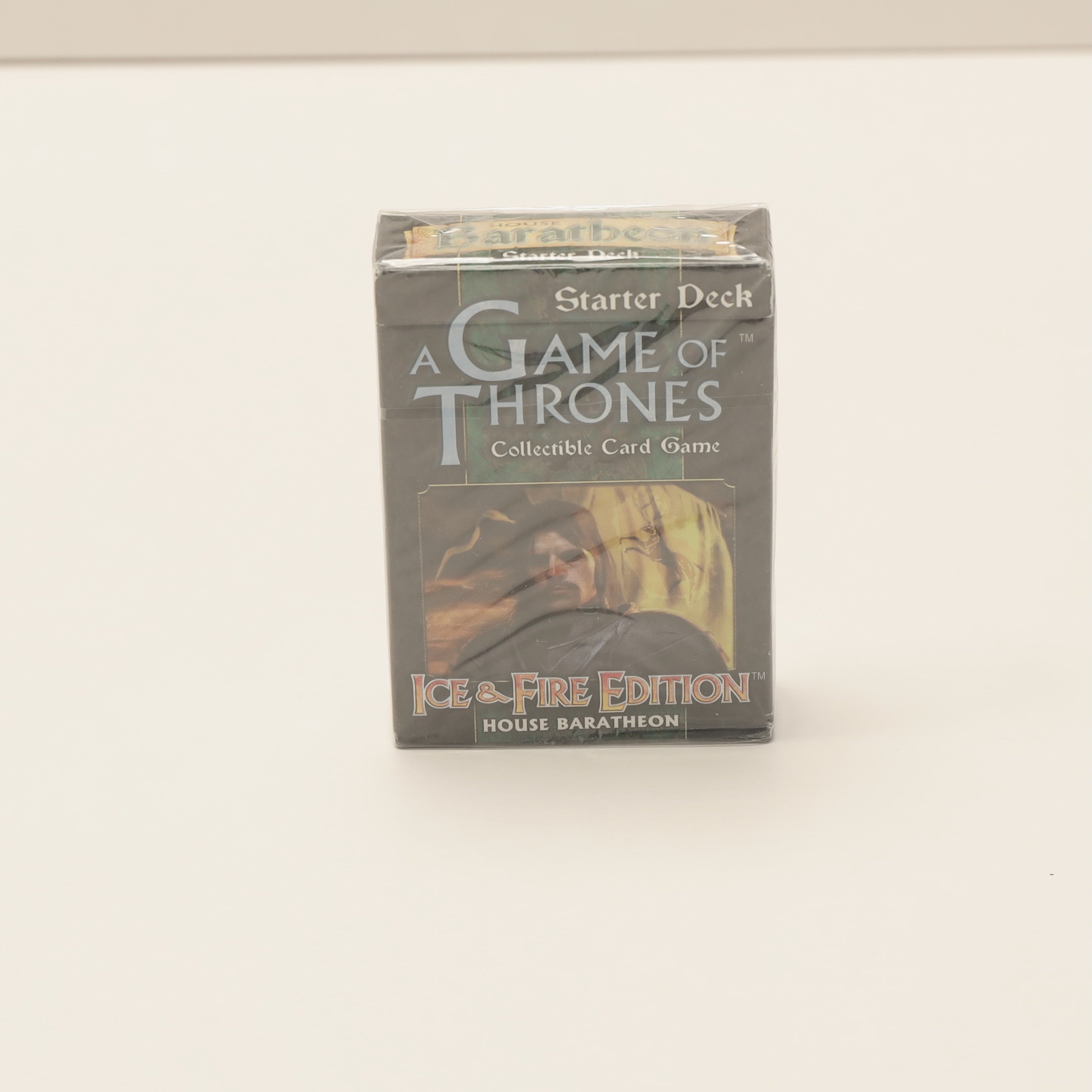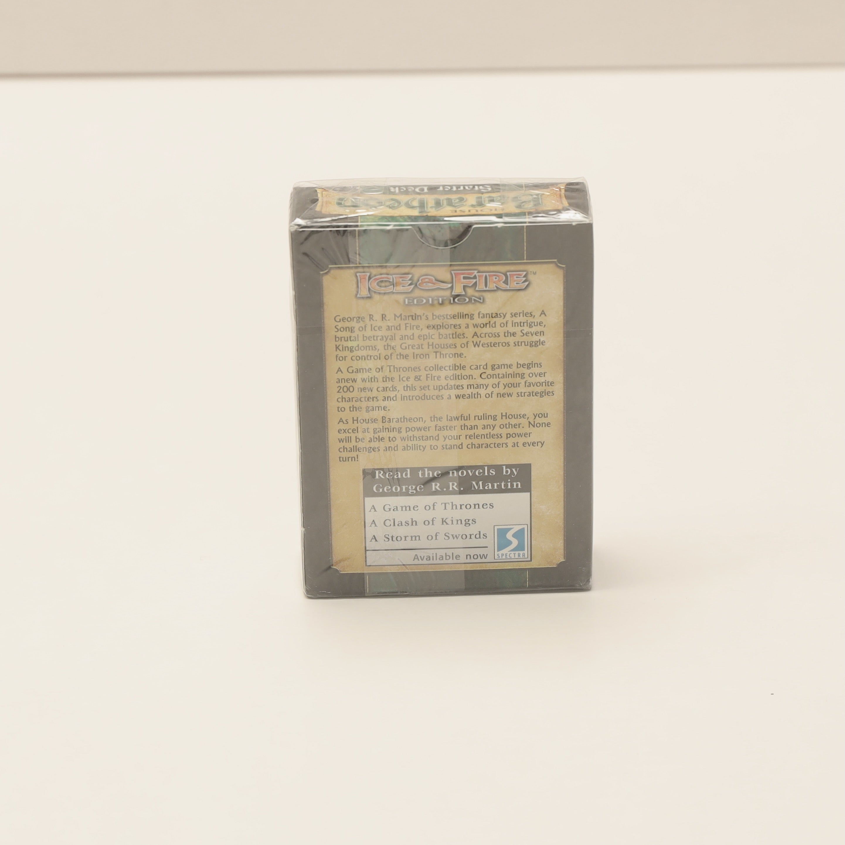 Complete set of five factory-sealed starter decks from the Ice & Fire Edition of the A Game of Thrones Collectible Card Game by Fantasy Flight Games. Each deck represents one of the iconic Great Houses of Westeros, making this lot perfect for collectors, fans, or CCG players looking to dive into the game or complete their collection.