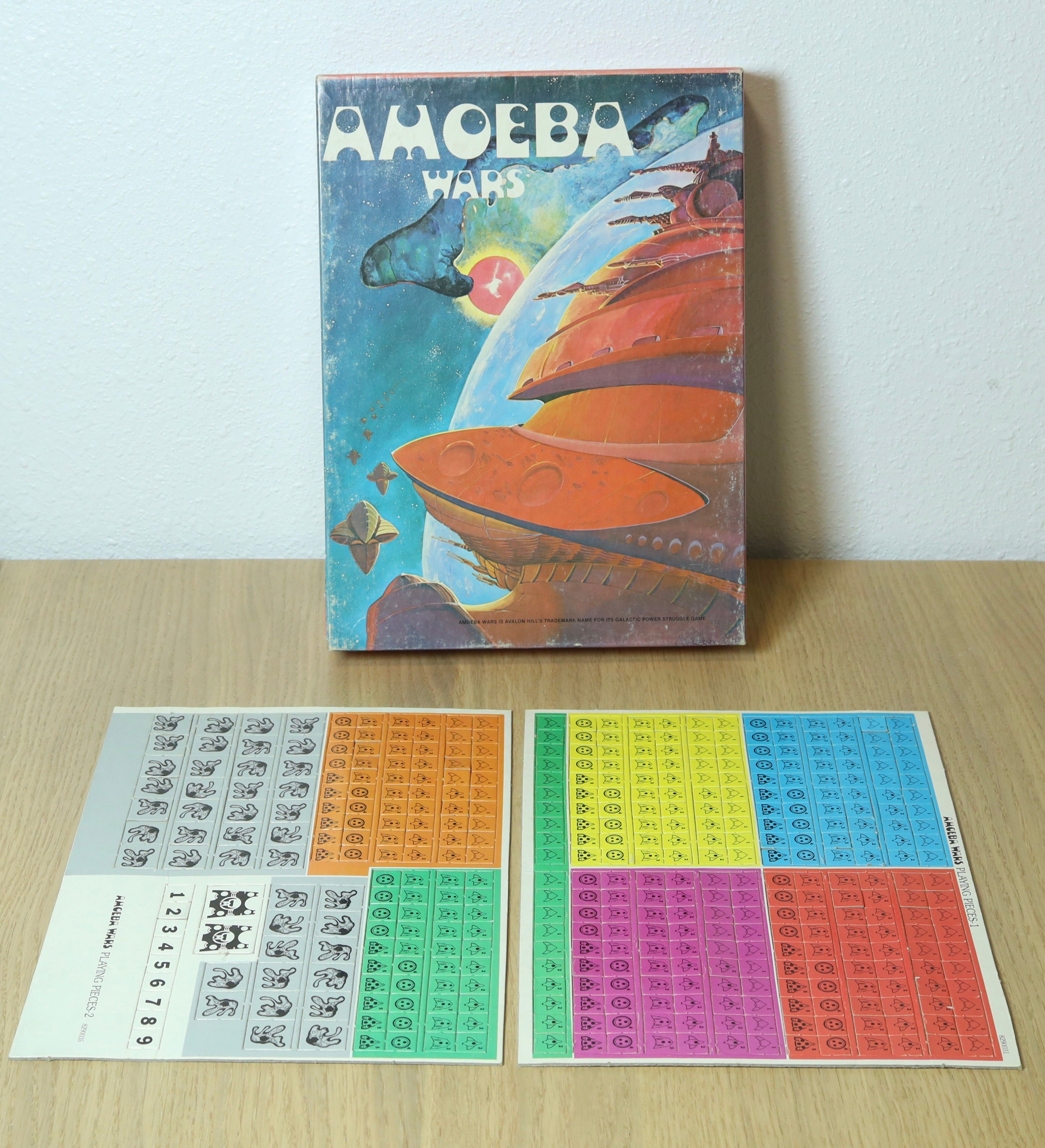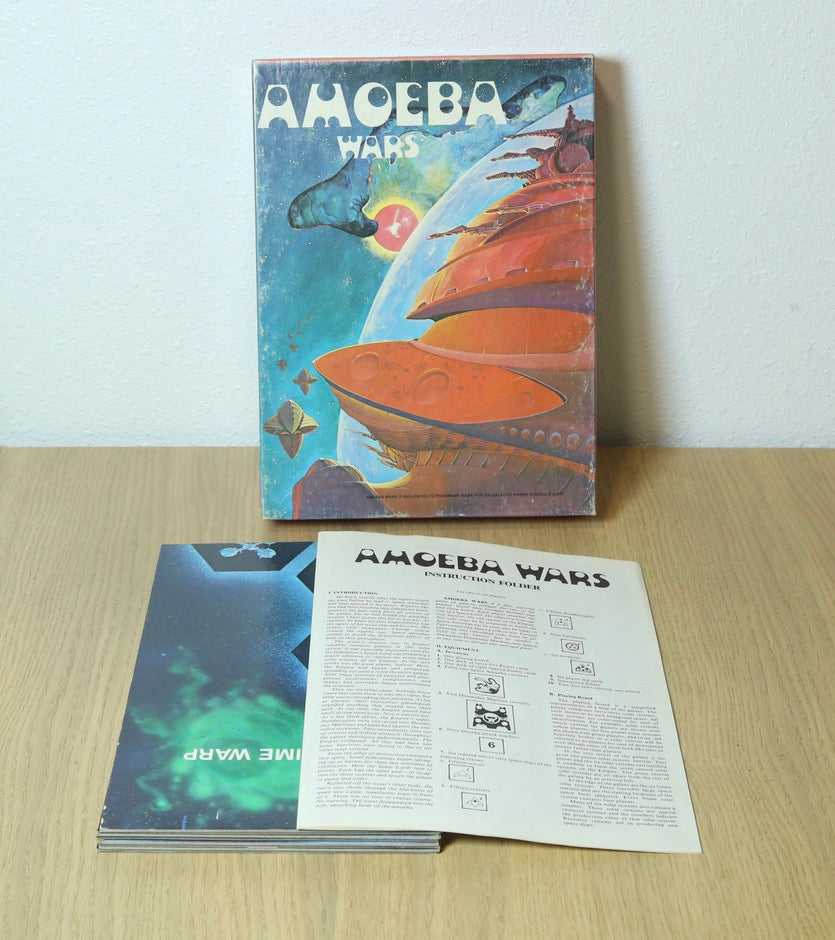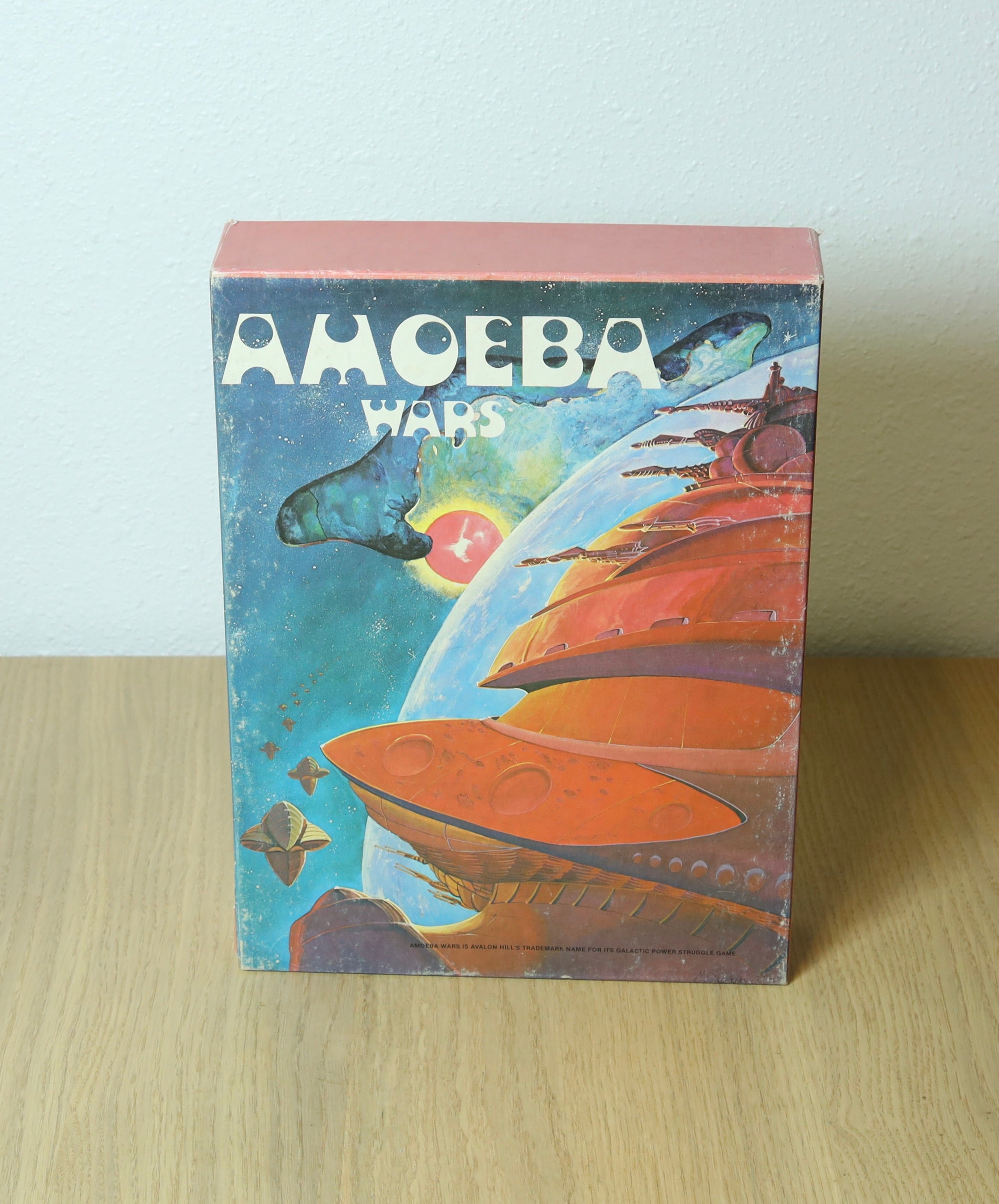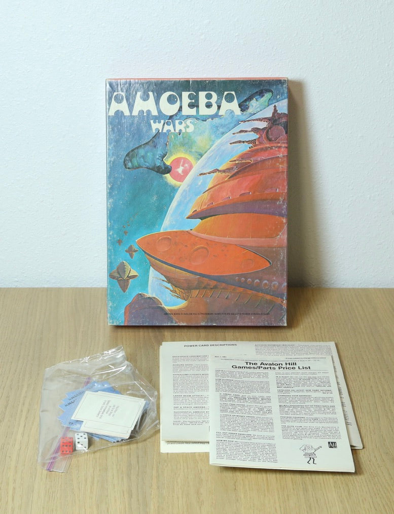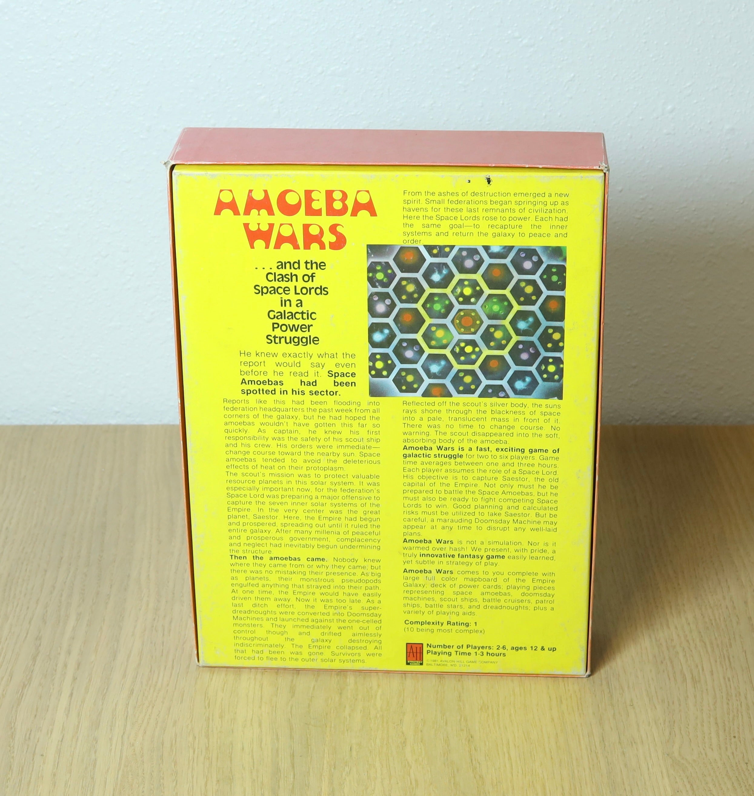 Vintage 1981 edition ofAmoeba Warsby Avalon Hill, a science fiction strategy game of galactic conquest and survival. Players compete for dominance against rival space lords while defending the galaxy from massive, unpredictable space amoebas. Includes original box, rules, dice, counters, and game components.