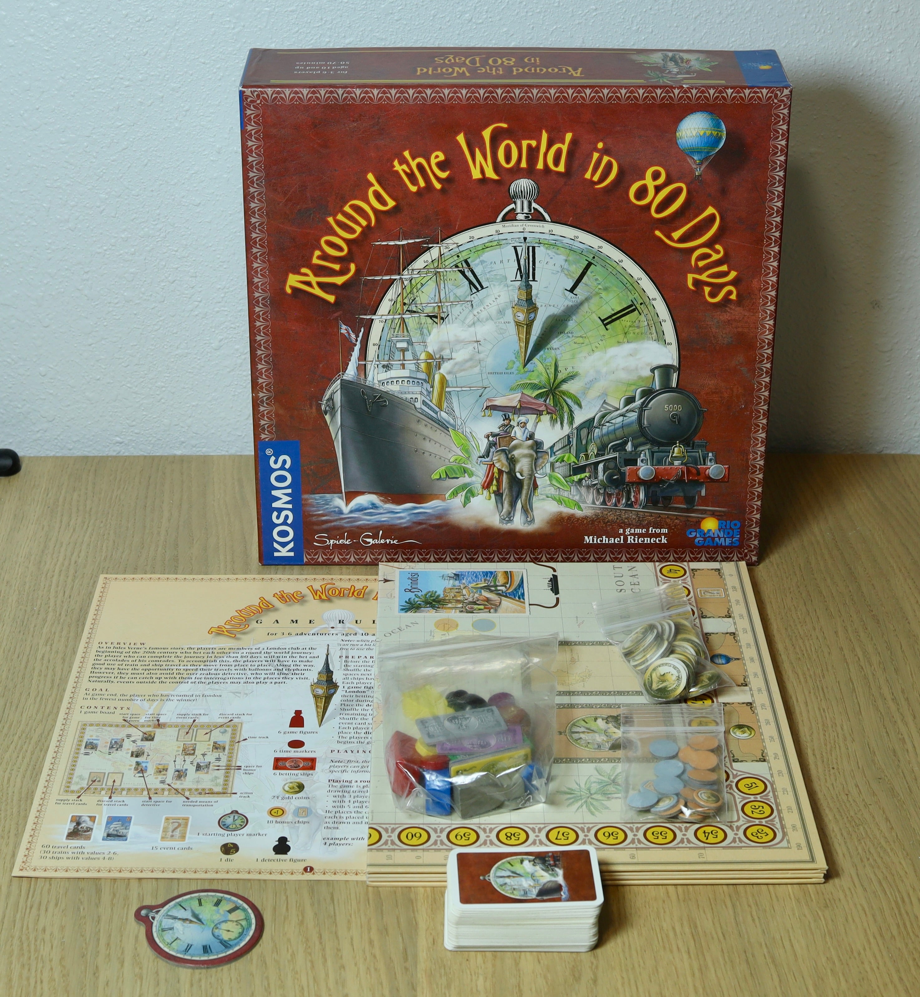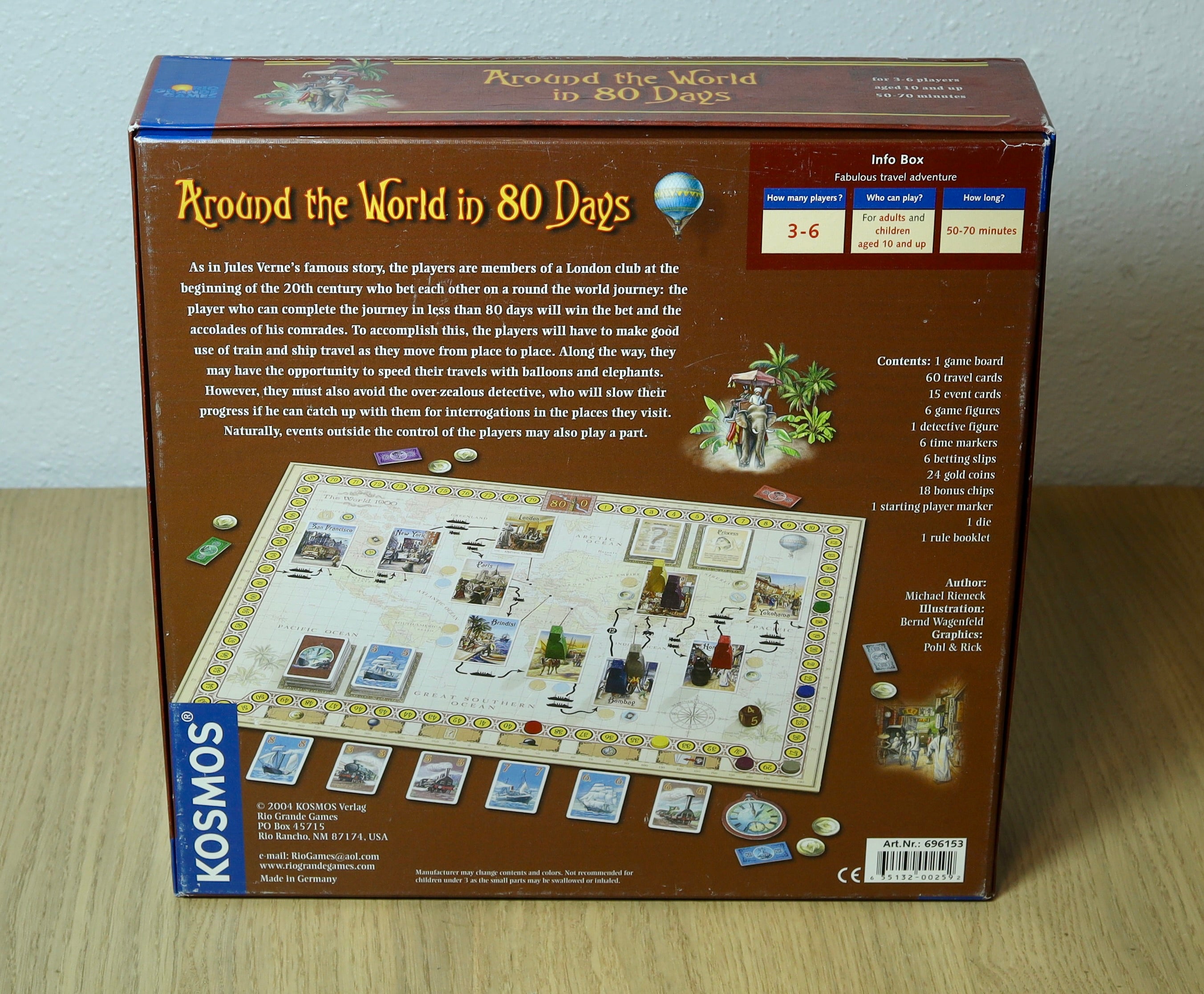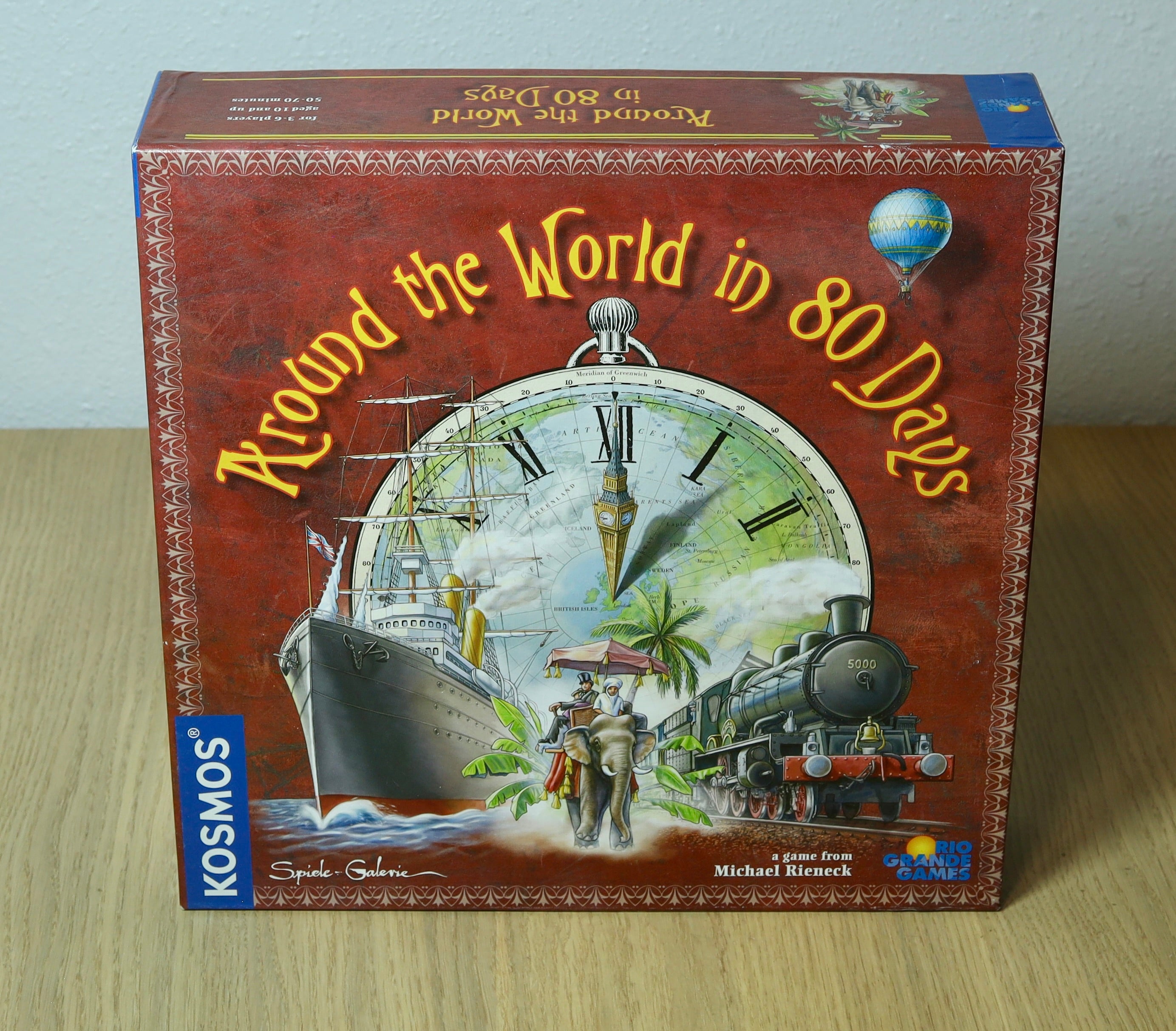 This listing is forAround the World in 80 Days, the 2004 edition published by Kosmos and Rio Grande Games. Inspired by Jules Verne’s classic novel, this family-friendly game has players racing across the globe to complete a journey in fewer than 80 days.