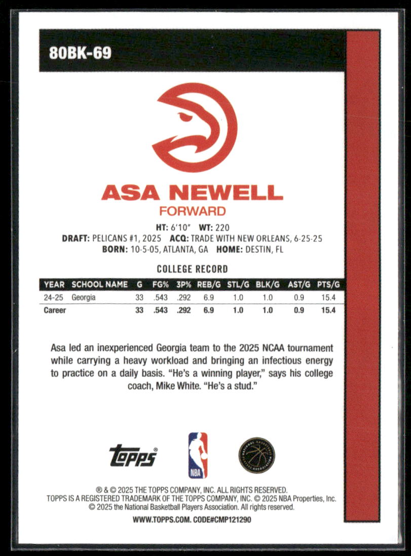 Asa Newell #80BK-69 2025-26 Topps 1980-81 Topps Basketball Atlanta Hawks