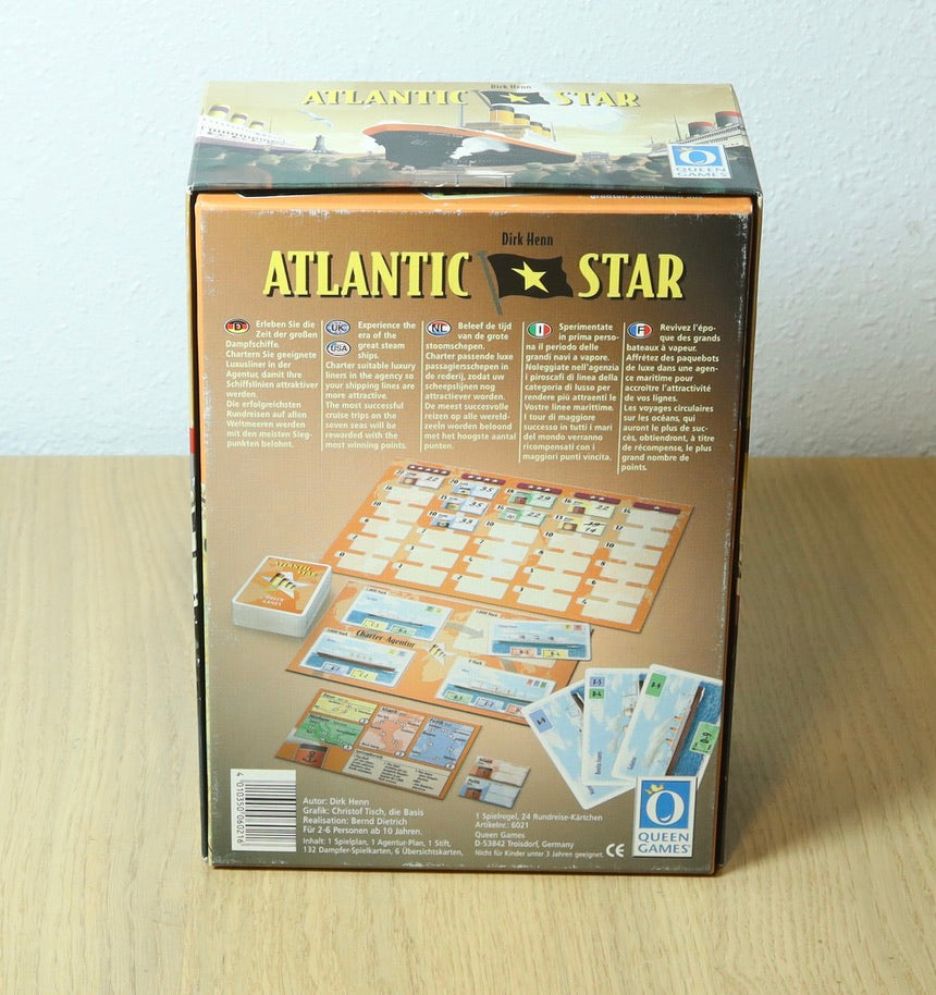 Atlantic Staris a reimplementation of the classicShowmanagerby Dirk Henn, published by Queen Games in 2001. Players take on the role of luxury cruise line managers during the golden age of steamships, chartering the best ships for prestigious routes while balancing cost, timing, and competition. Strategic planning and adaptability are key to securing the most lucrative voyages.
