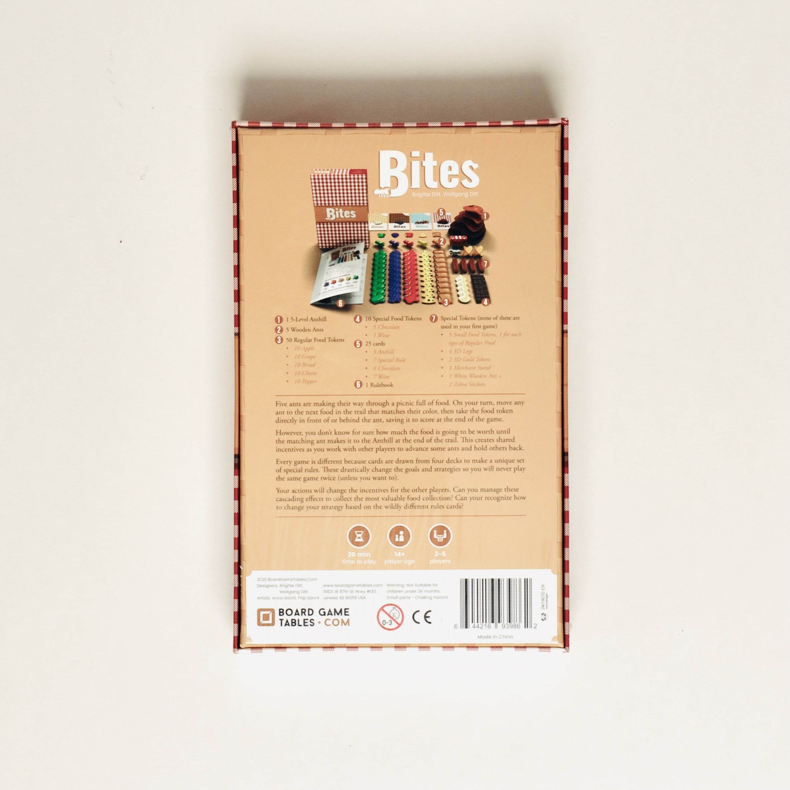 Factory sealed Bites (2020) Kickstarter Edition by BoardGameTables.com. This upgraded edition features premium components and unique Kickstarter extras. A quick and engaging family game where ants race to collect food, featuring variable scoring and playful strategy.