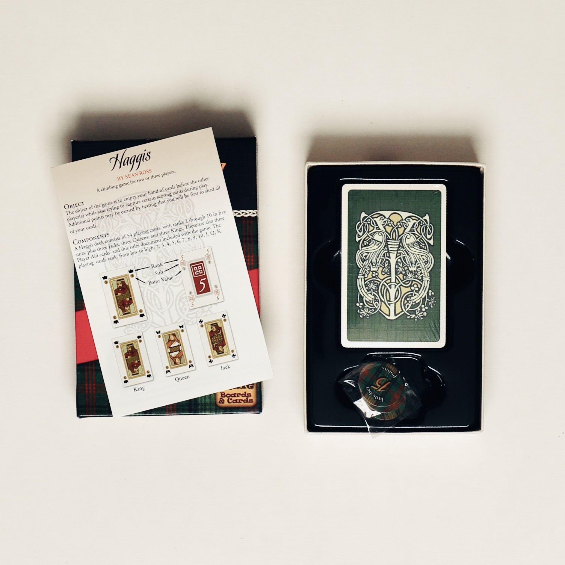 About the Game: Haggis is a strategic trick-taking game that builds on the traditions of games like Tichu, but is specifically balanced for 2 or 3 players. With special face cards and hidden bets, it offers both tactical play and replayability.
