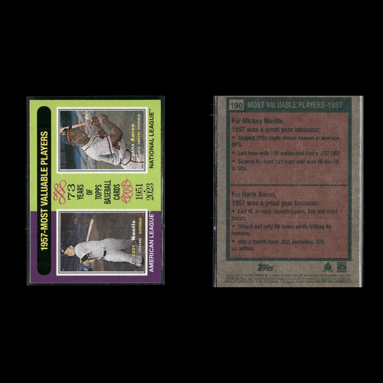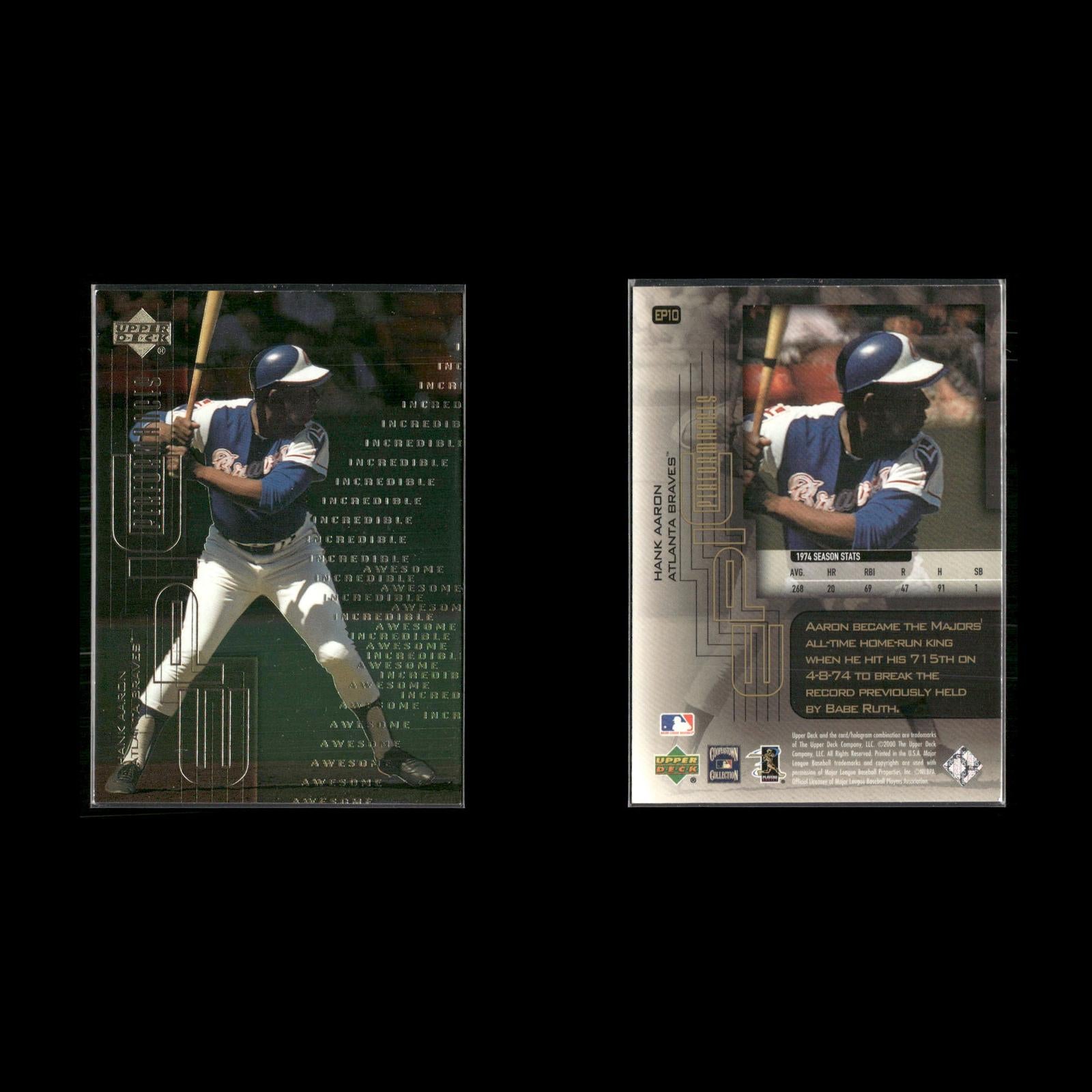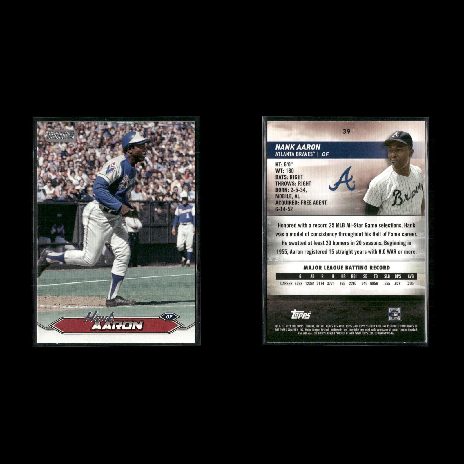 Hank Aaron #5 2000 Topps Hank Aaron Chrome Milwaukee Braves Hank Aaron #EP10 2000 Upper Deck Hitter's Club Epic Performances Atlanta Braves 1957 MVPs (Mickey Mantle / Hank Aaron) MVP #190 2024 Topps Heritage Hank Aaron #39 2024 Stadium Club Members Only Atlanta Braves