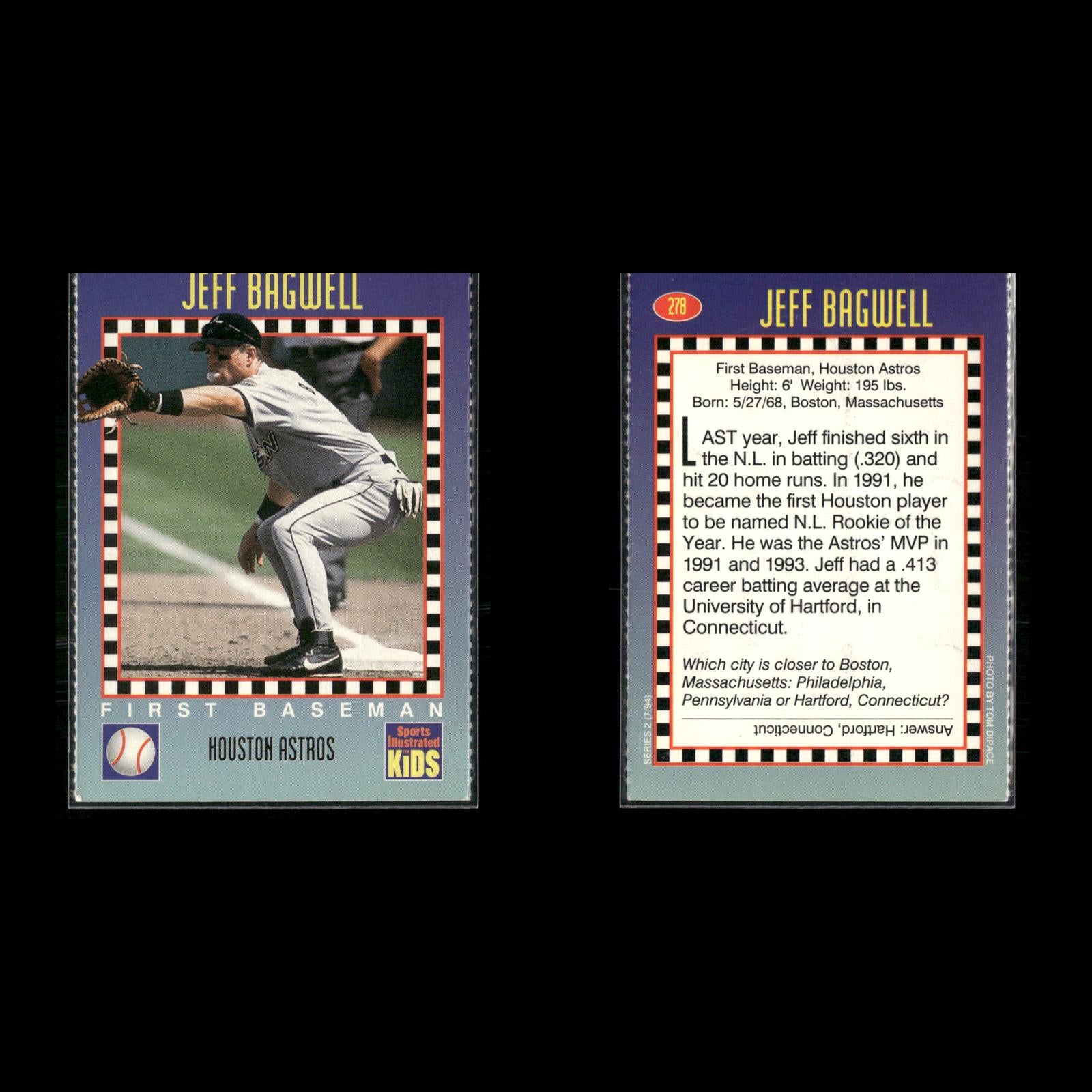 Jeff Bagwell #243 2001 Fleer Tradition Houston Astros Jeff Bagwell #278 1994 Sports Illustrated for Kids Houston Astros Jeff Bagwell #227 1993 Topps Houston Astros Jeff Bagwell #29 1996 SPx Houston Astros Jeff Bagwell #P10 2000 Topps Limited Power Players Houston Astros 1994 MVPs (Frank Thomas / Jeff Bagwell) MVP #198 2024 Topps Heritage