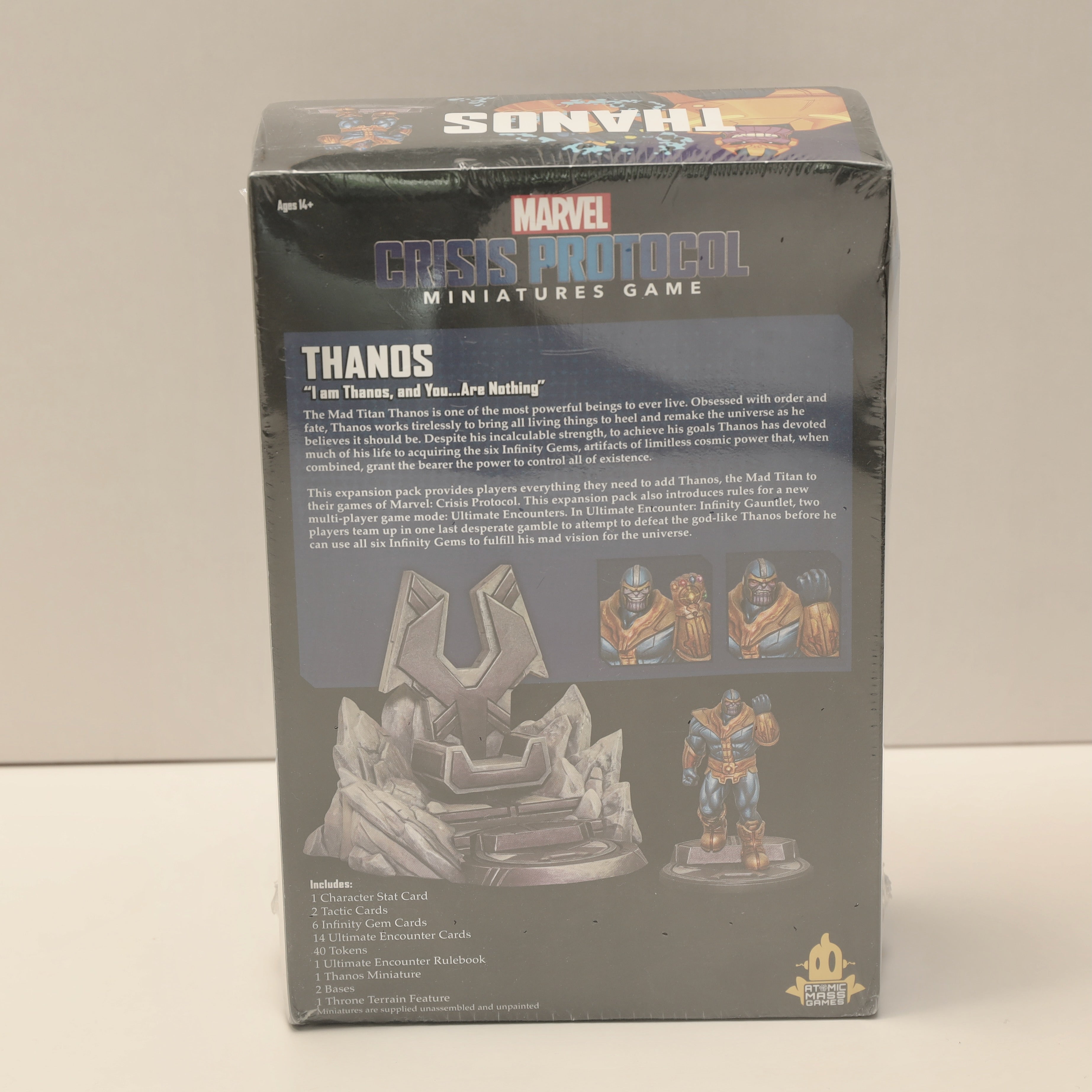 About the Game: Marvel Crisis Protocol is a tabletop miniatures skirmish game where players form squads of iconic Marvel characters. With this expansion, players can use Thanos with the Infinity Gems for standard play or stage a high-stakes boss battle in the unique Ultimate Encounter mode. Balance the fate of the universe—or threaten it.