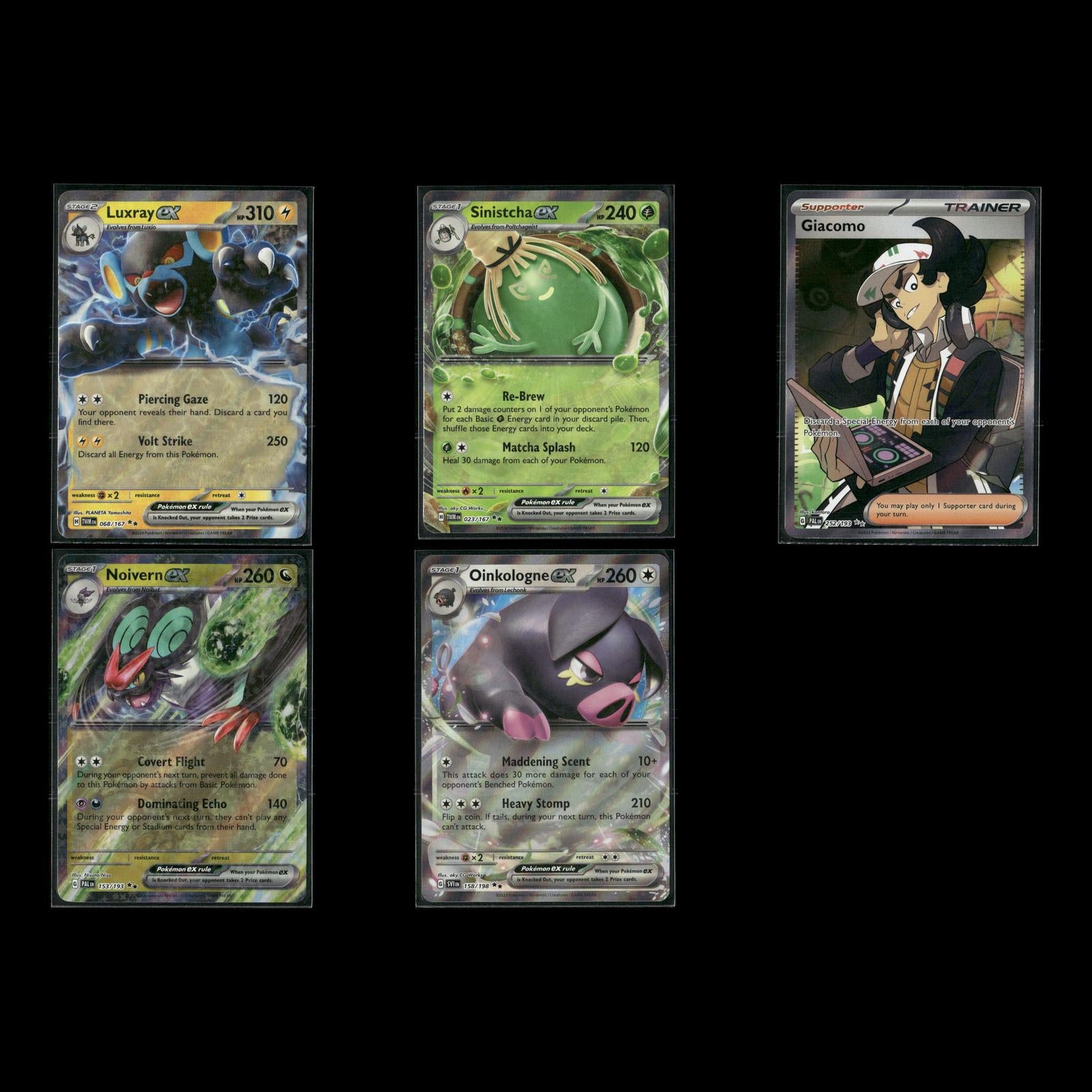 Luxray ex #068/167 SV06: Twilight Masquerade Sinistcha ex #023/167 SV06: Twilight Masquerade Giacomo #252/193 SV02: Paldea Evolved Noivern ex #058/071 SV2D: Clay Burst Oinkologne ex #158/198 SV01: Scarlet & Violet Base Set