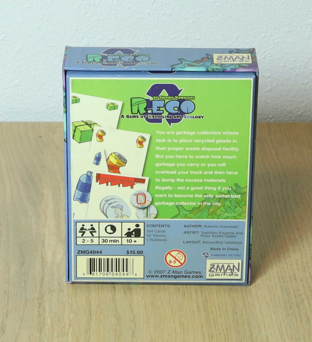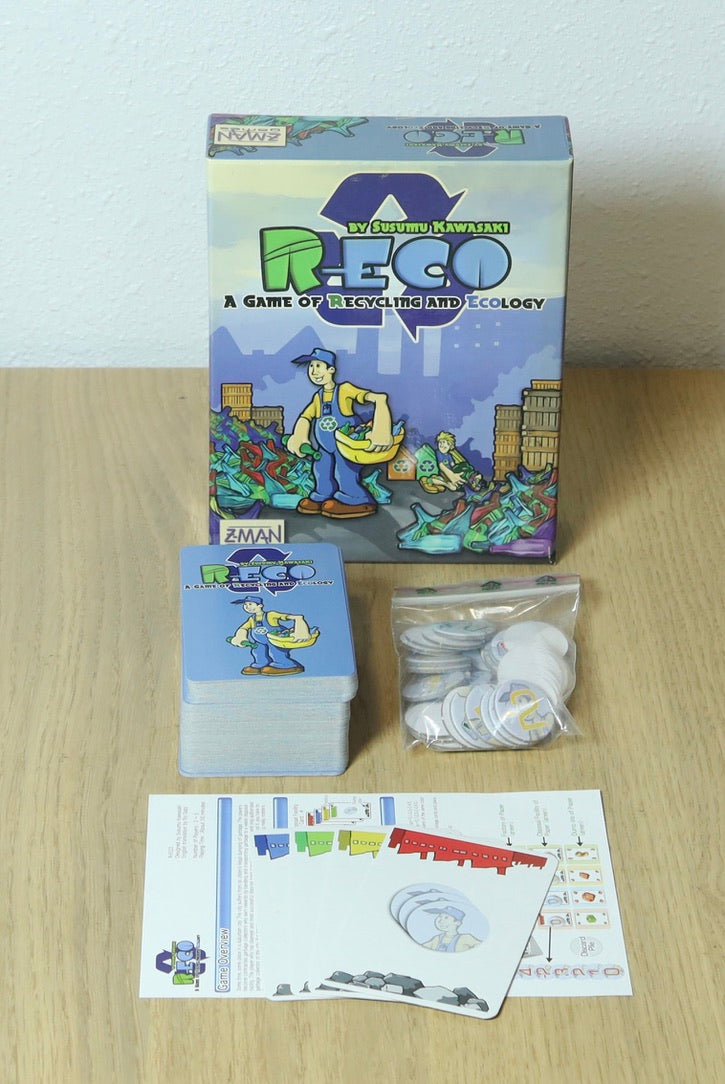 R-Eco (2007), designed by Susumu Kawasaki, is a fast-paced card game about recycling and waste management. Players act as garbage collectors, aiming to properly dispose of recyclable goods without overloading their trucks or resorting to illegal dumping.