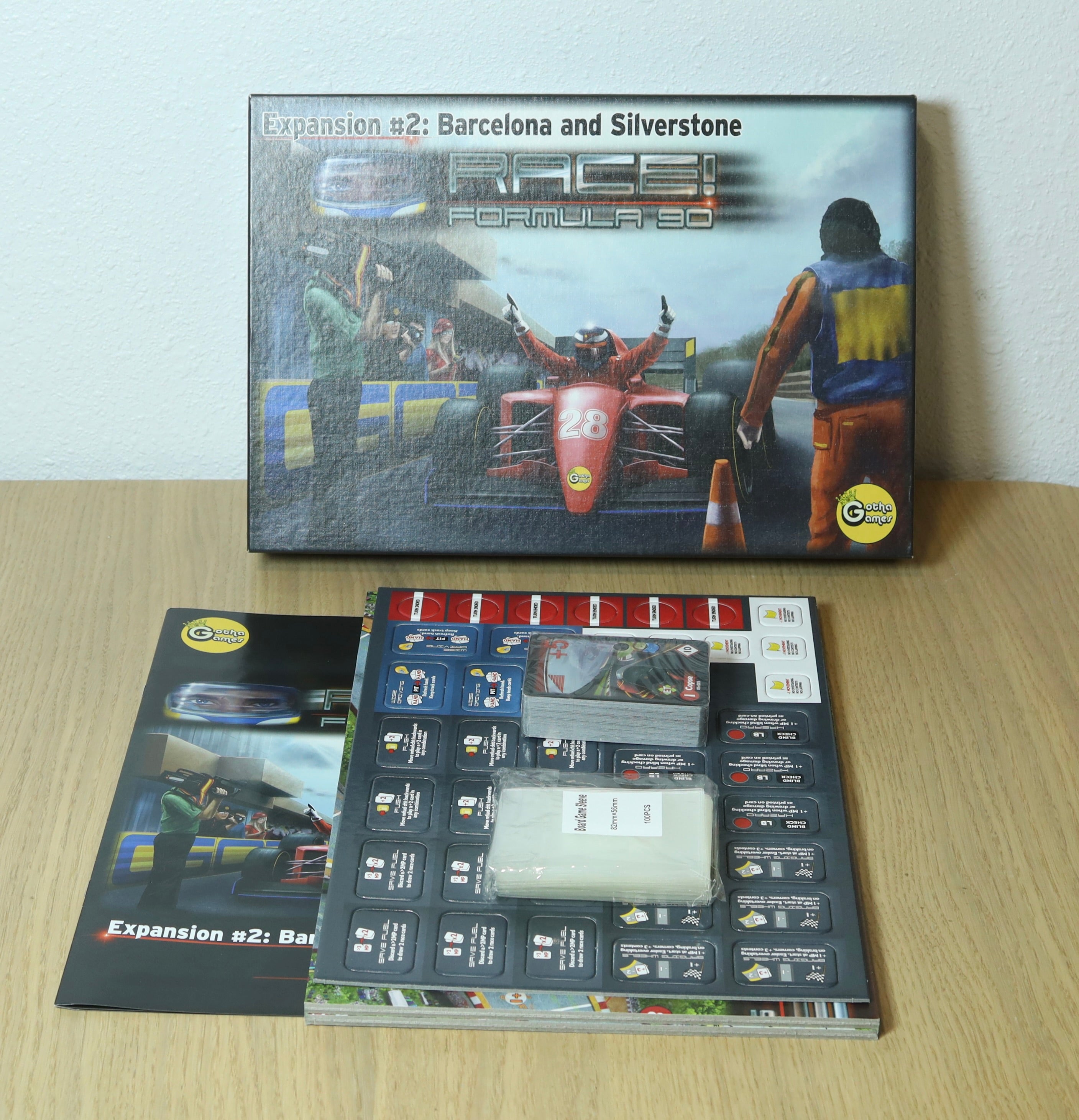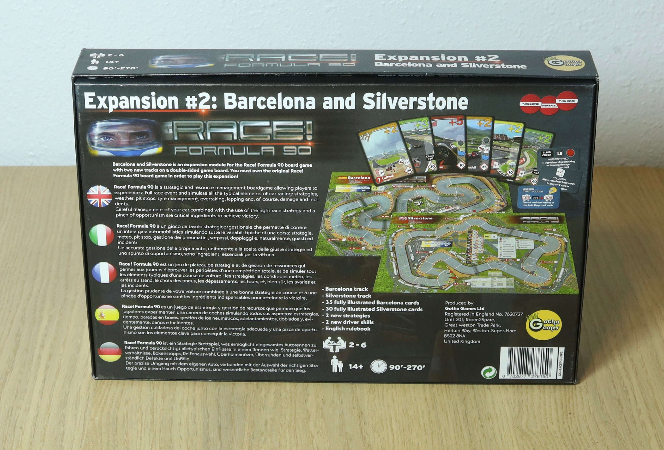 RACE! Formula 90 – Expansion #2: Barcelona and Silverstone(2016) is an add-on for the acclaimedRACE! Formula 90racing strategy board game. This expansion introduces two new double-sided race tracks — Barcelona and Silverstone — along with new strategy cards, driver skills, and rules to enhance gameplay.Base game required to play.