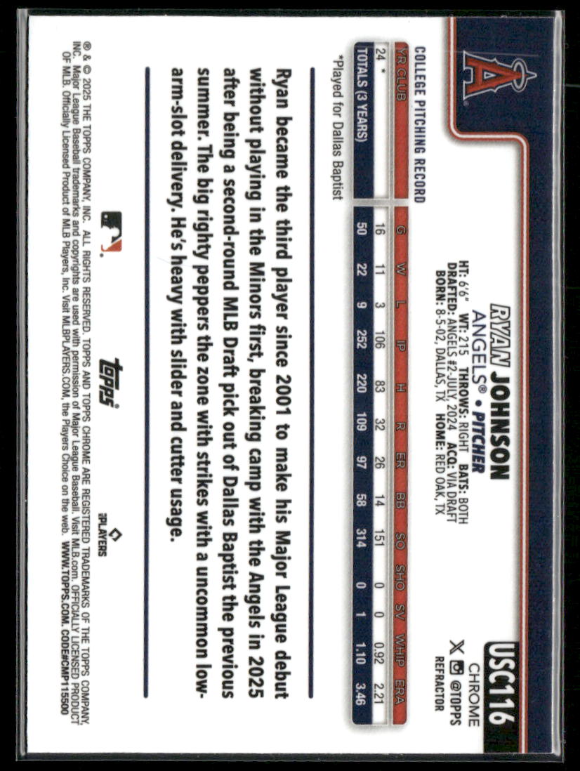 Ryan Johnson Rookie #USC116 2025 Topps Chrome Update Refractors LA Angels