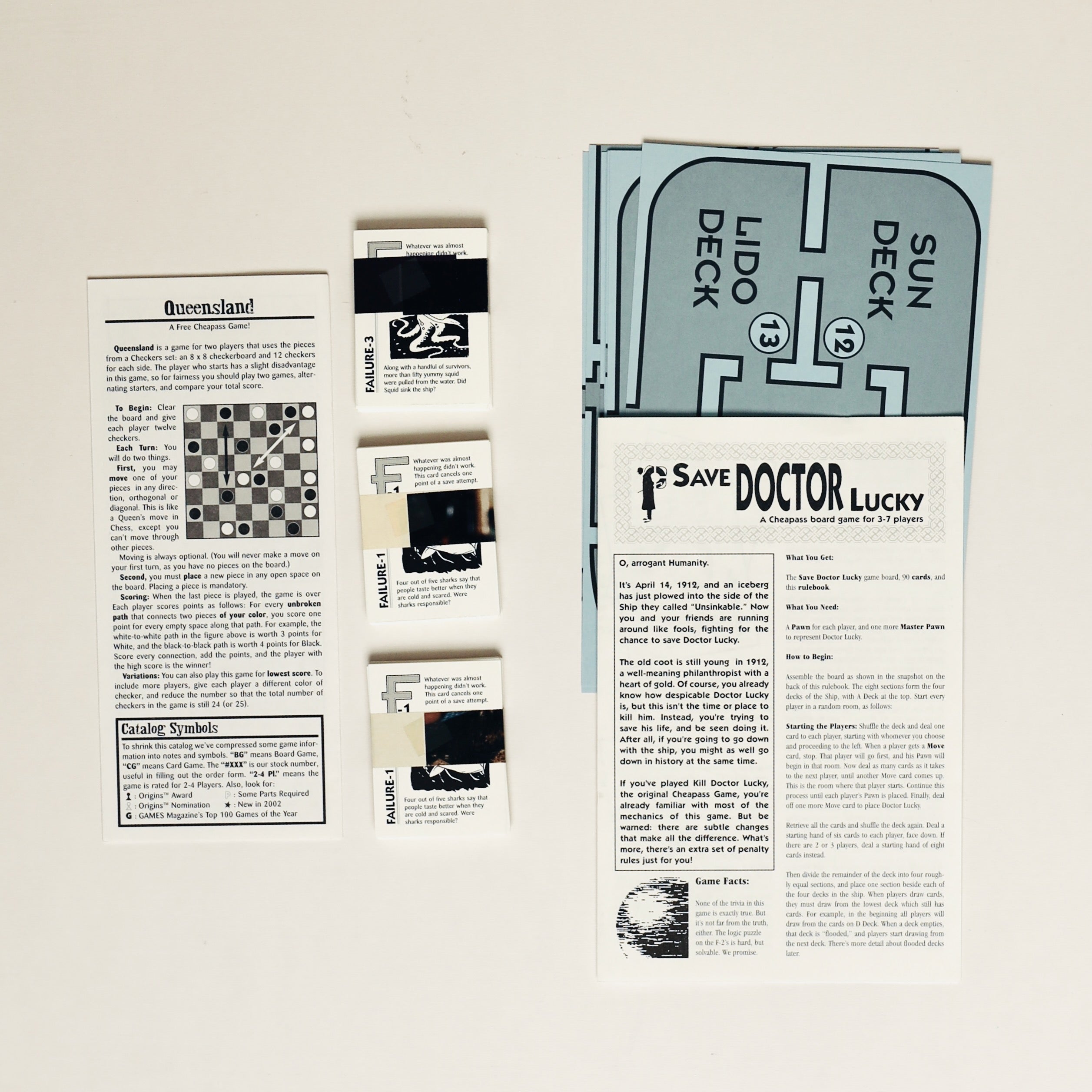 This is the 2000 edition of Save Dr. Lucky by Cheap Games. A prequel to Kill Dr. Lucky, this standalone game features reverse mechanics in a lighthearted race to rescue rather than eliminate the famous doctor. Game is complete and in like new condition.