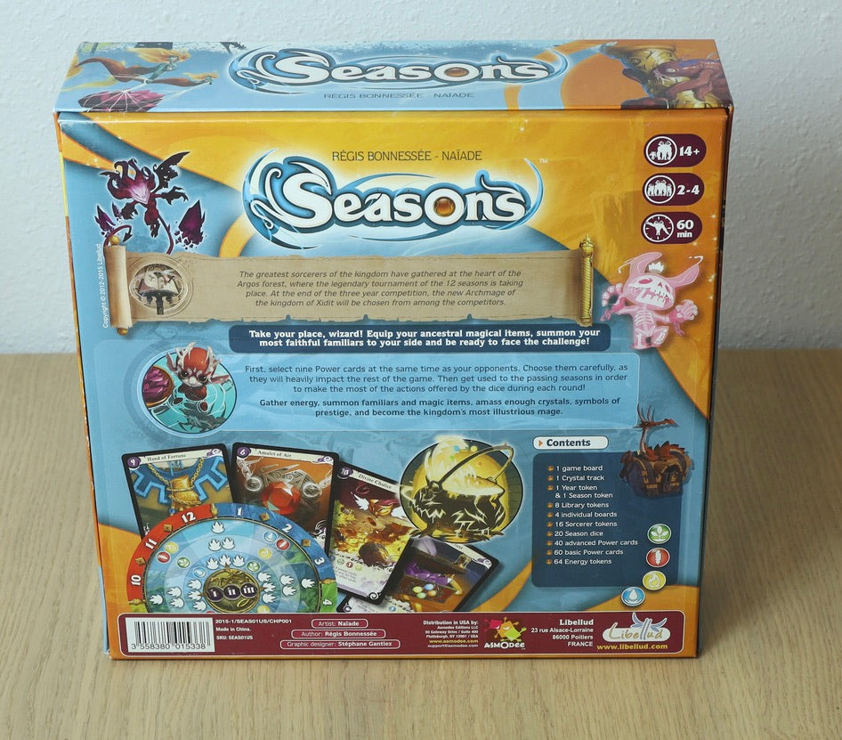 About the Game: Seasonsplaces players in a magical tournament where you’ll manage energy, cast powerful spells, and summon magical items over the course of three in-game years. Draft dice each round to gather resources and take actions that shape your strategy and score points.