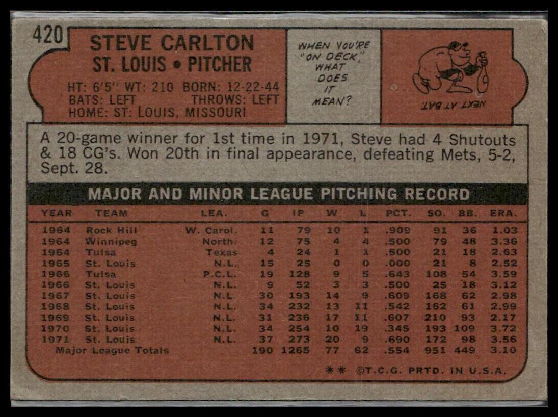 Steve Carlton #420 1972 Topps St. Louis Cardinals
