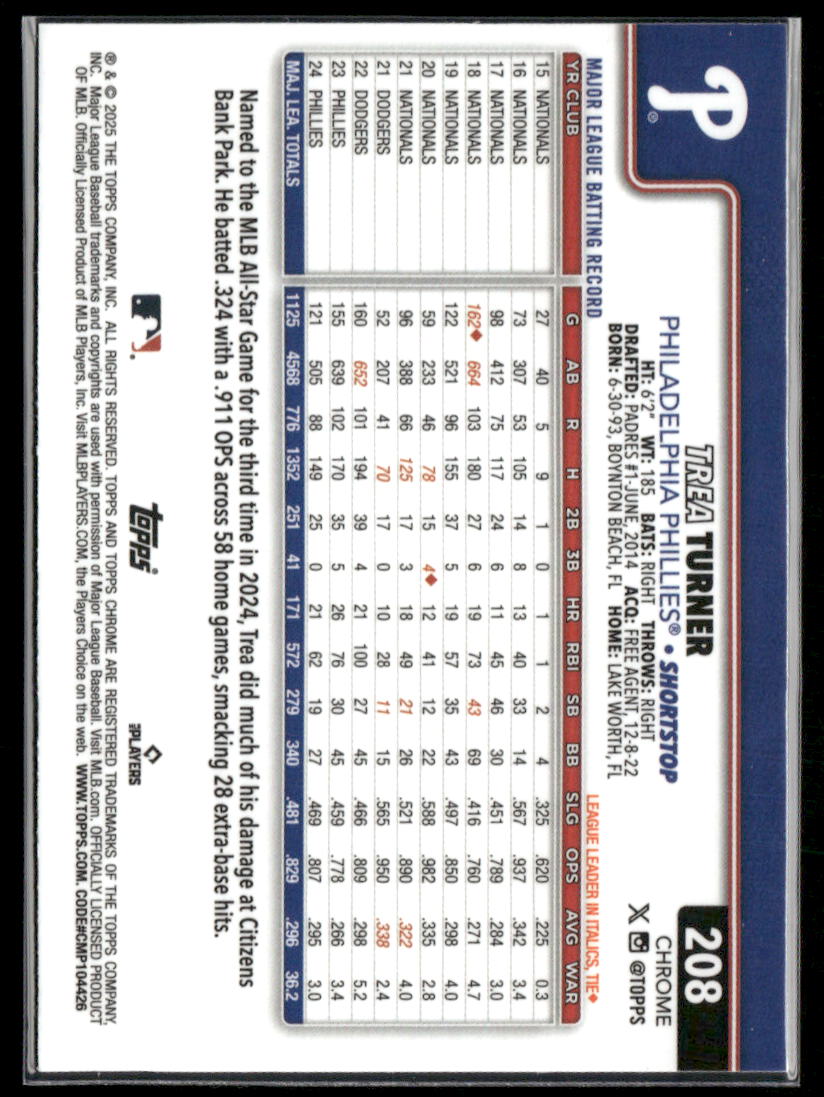 Trea Turner #208 2025 Topps Chrome Sepia Refractors Philadelphia Phillies