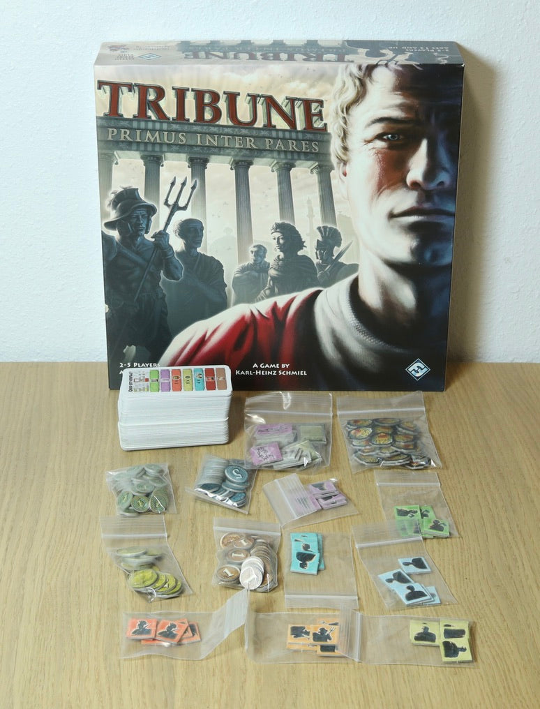 Tribune: Primus Inter Pares(2007) is a strategic board game of political maneuvering and power struggles set in ancient Rome. Players compete to control influential factions, gather resources, and fulfill victory conditions to claim the prestigious office of Tribune. This listing includes the original base gameandtheTribune: Expansion, adding new victory conditions, factions, and strategic possibilities.