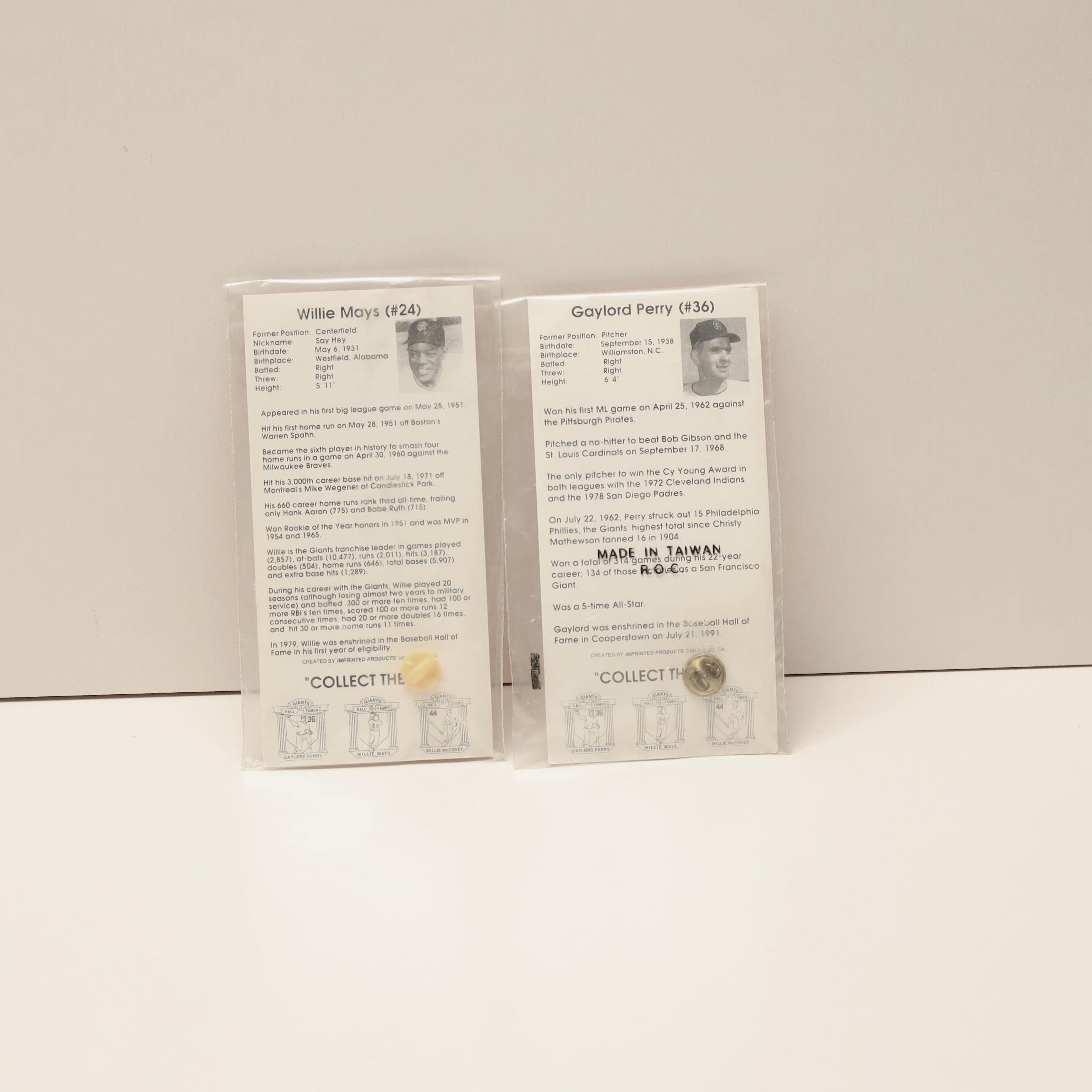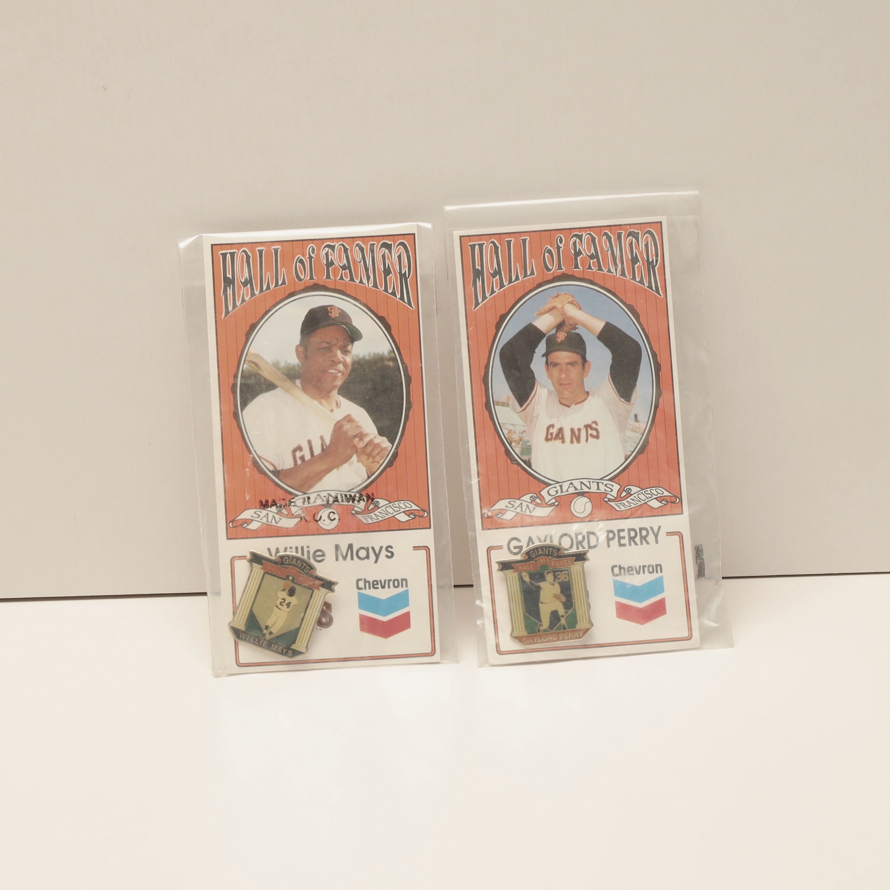 This listing is for a lot of two San Francisco Giants Hall of Fame collectible pins featuring Willie Mays and Gaylord Perry. These were promotional items sponsored by Chevron and include both a player pin and illustrated card, sealed in original packaging.