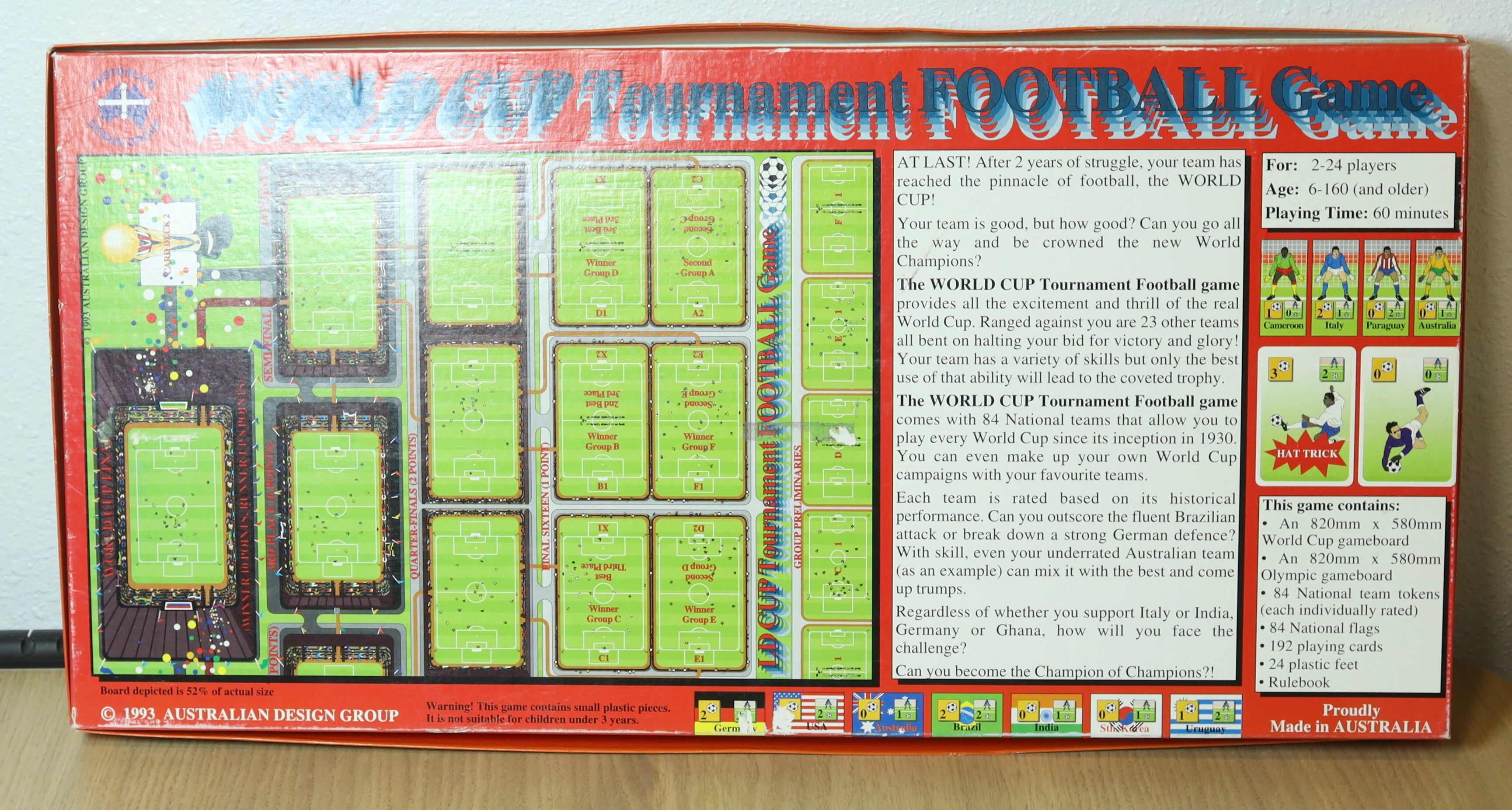 World Cup Tournament Football Game(1993) by the Australian Design Group brings the excitement and strategy of international football to your tabletop. Featuring 84 national teams dating back to the inaugural 1930 World Cup, players can relive historic matches or create their own dream tournaments.